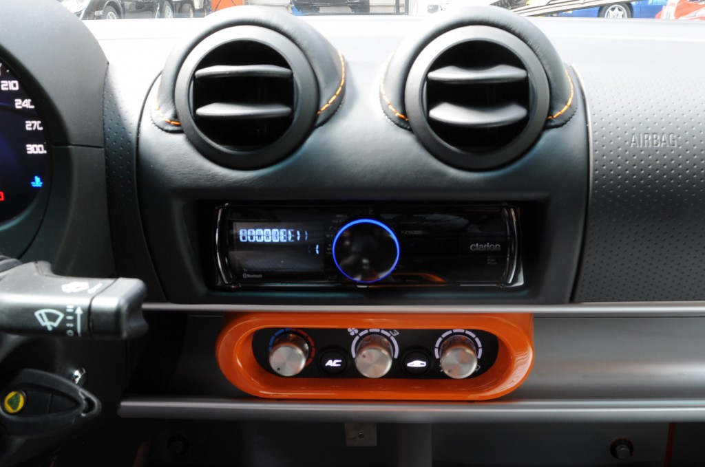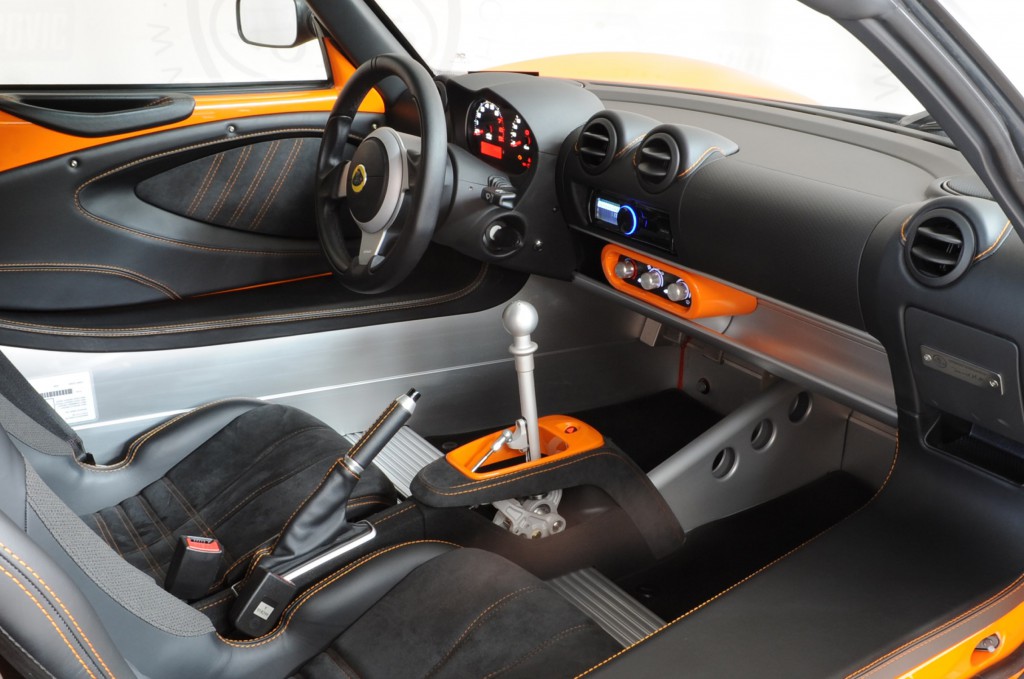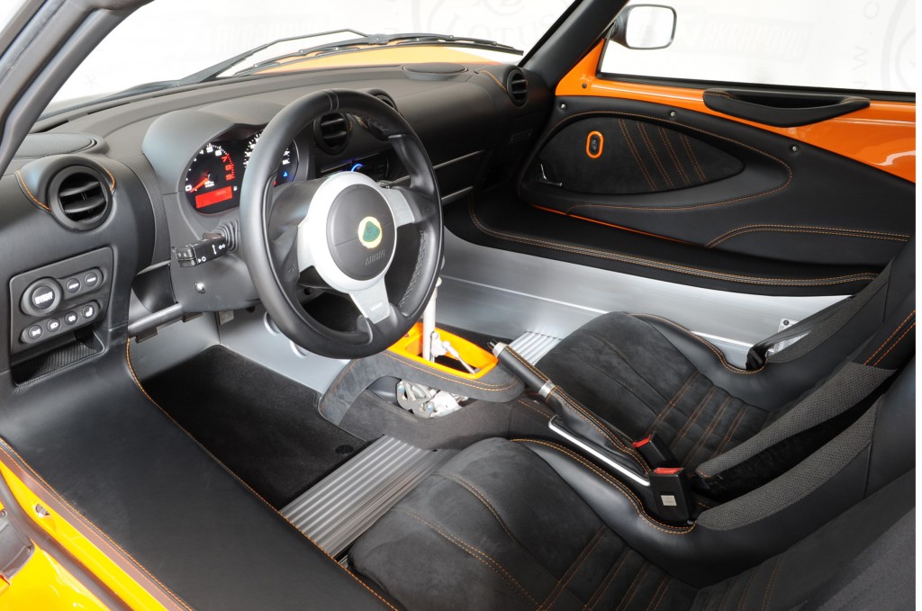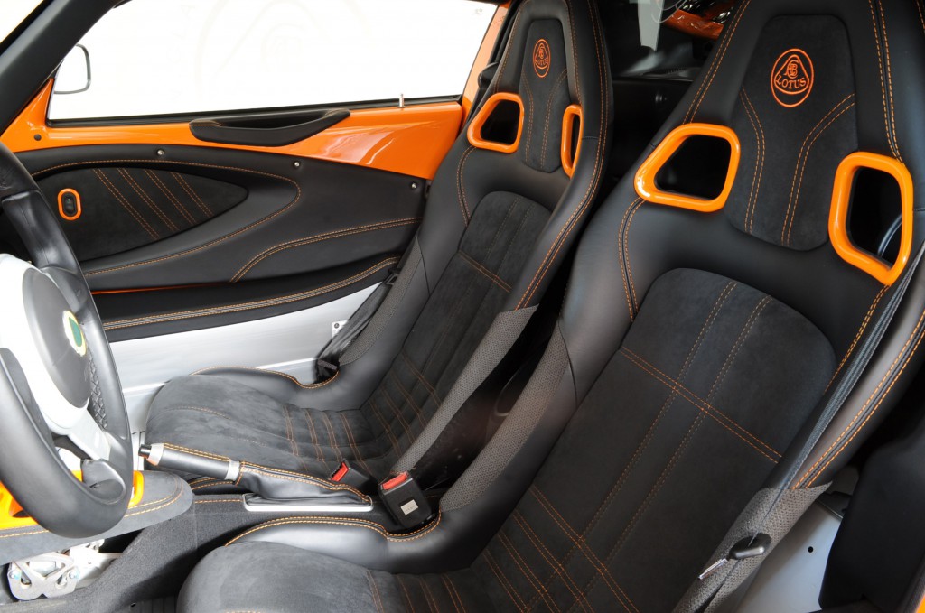 Orange avec les sièges baquets en Alcantara et coutures oranges.