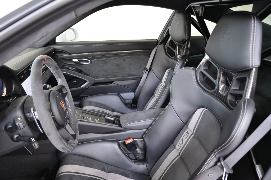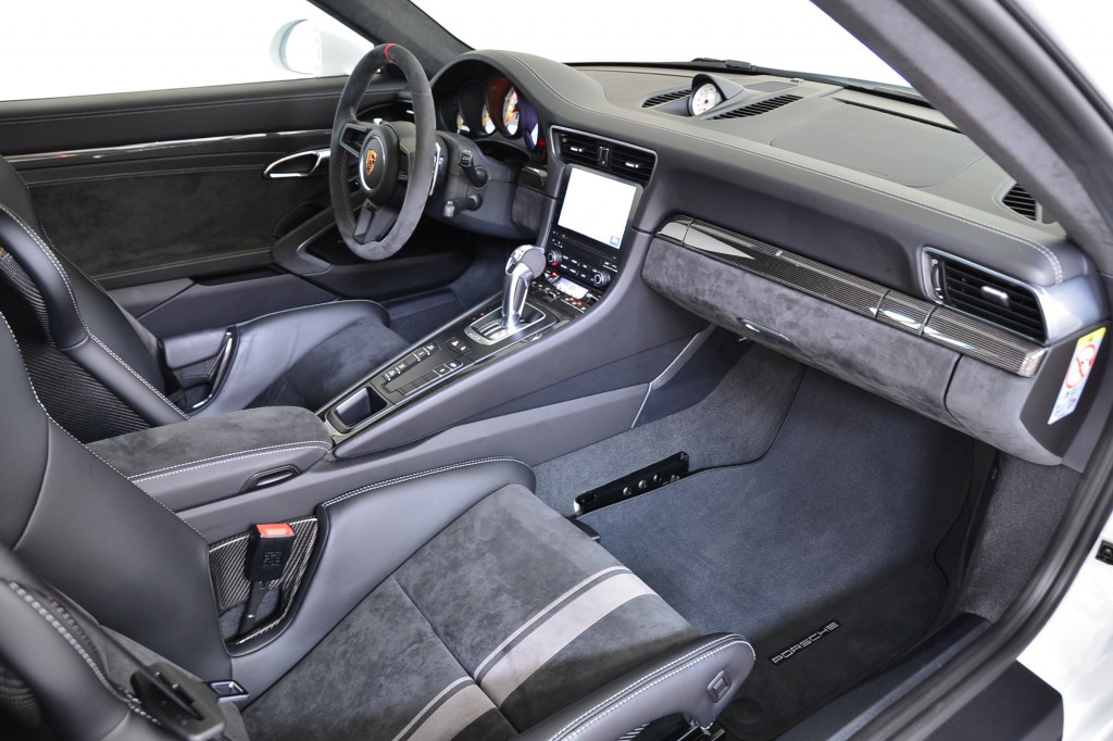 Blanc Carrara métallisé avec les baquets 918 Carbone en cuir et Alcantara noir ainsi que le pack tout cuir noir et la finition intérieure Carbone.
