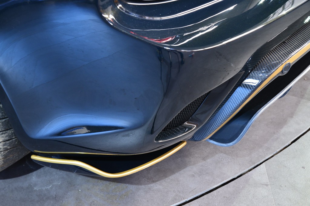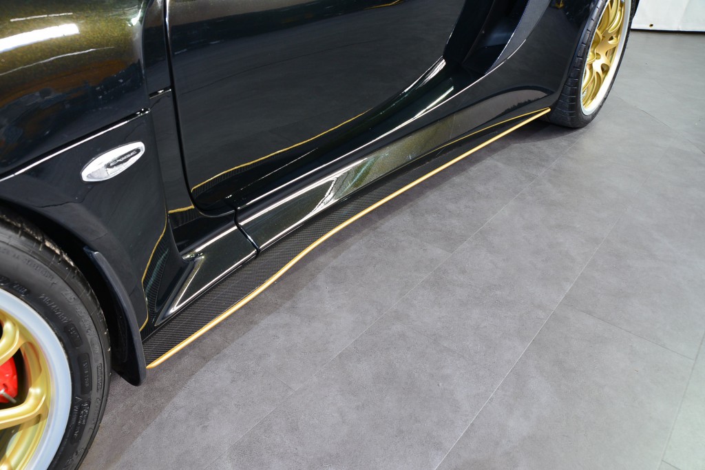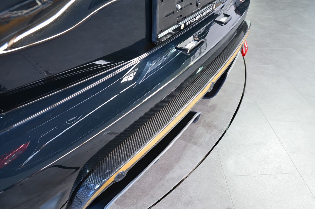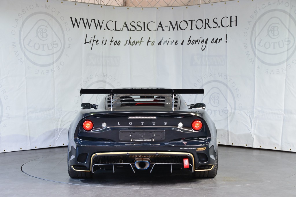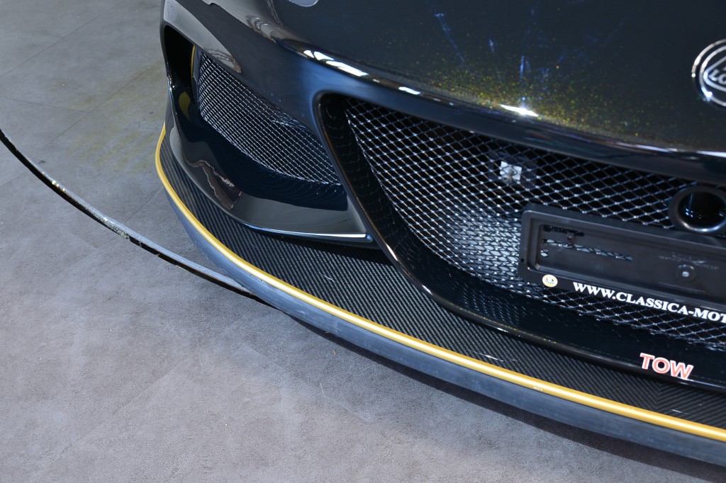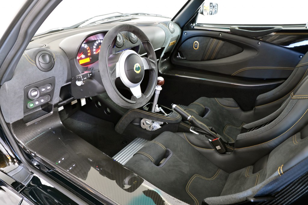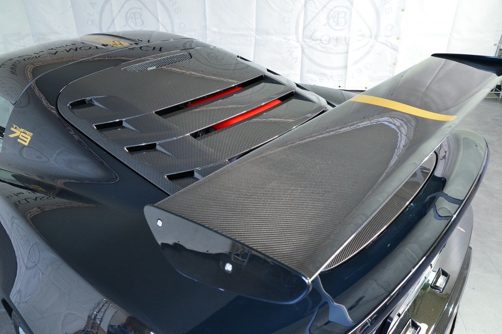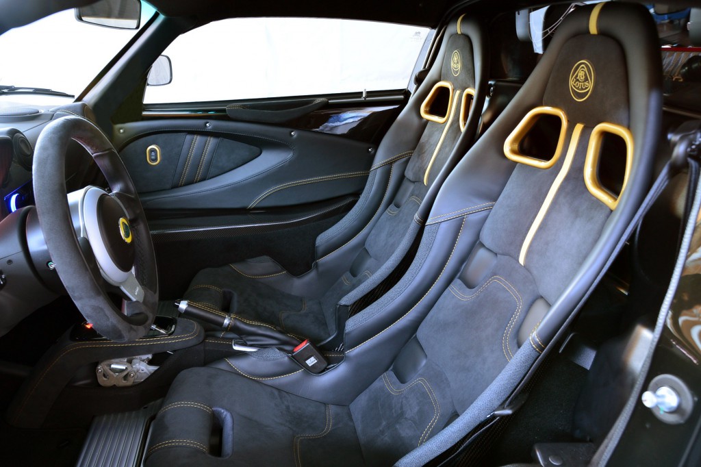 Couleur Lotus Héritage noir métallisé avec les sièges Carbone en Alcantara et coutures dorées. Stripes dorés.