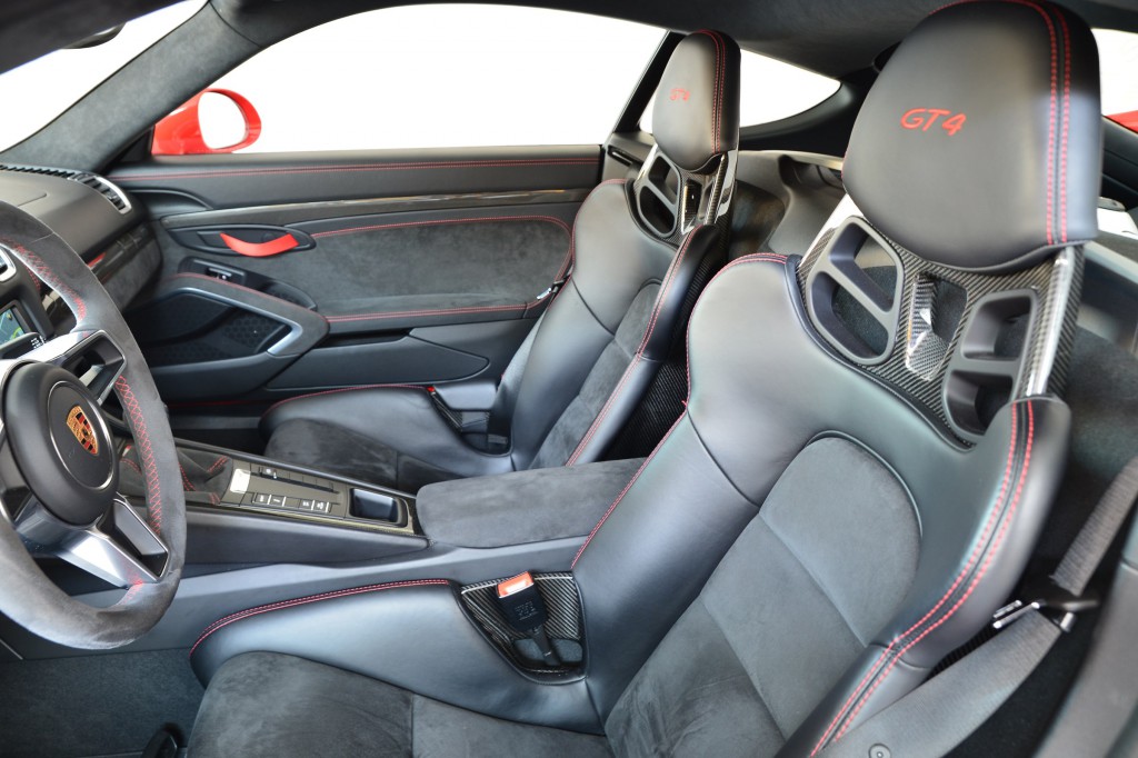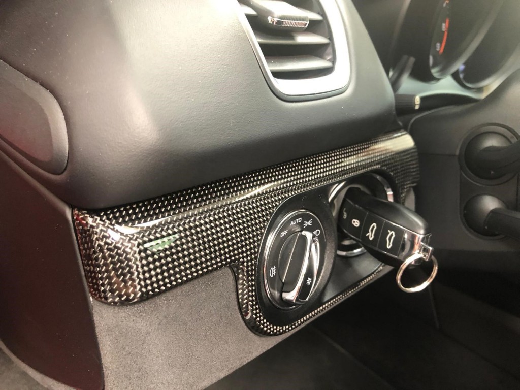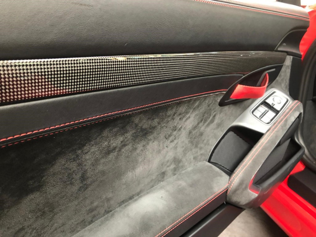 Rouge avec les sièges Baquets Carbone 918 en cuir noir et coutures rouges.