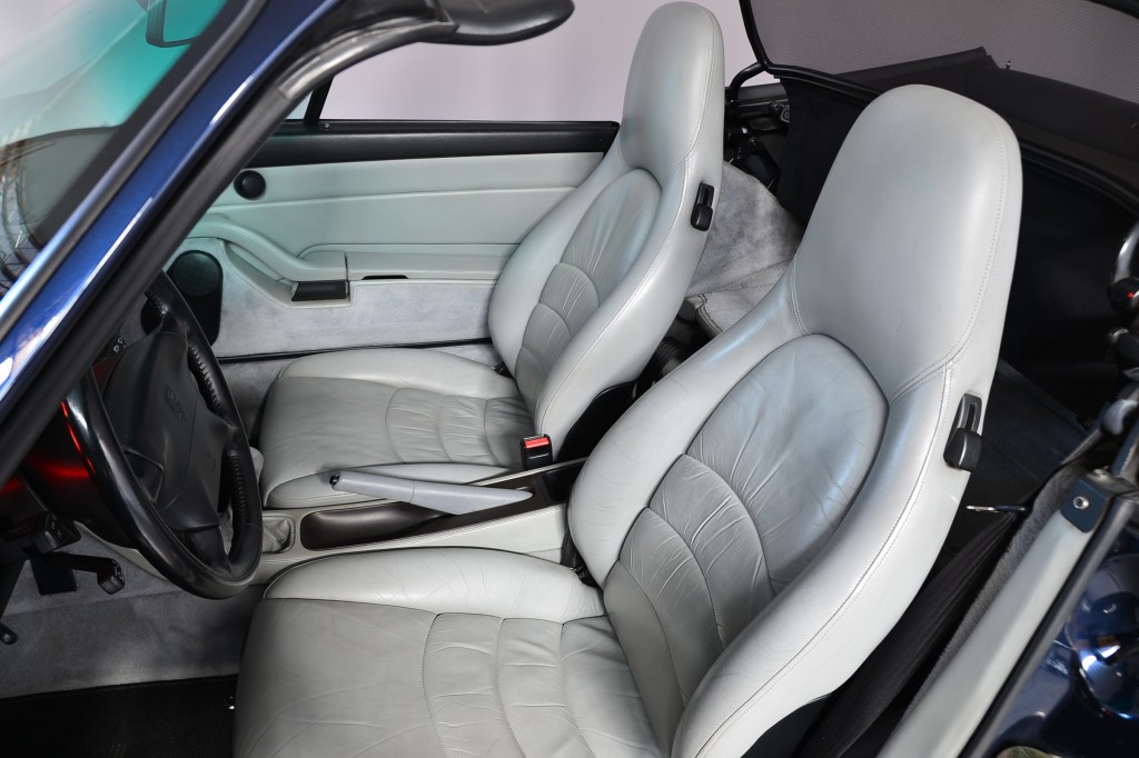 Bleu métallisé avec les sièges en cuir gris et capote bleue.