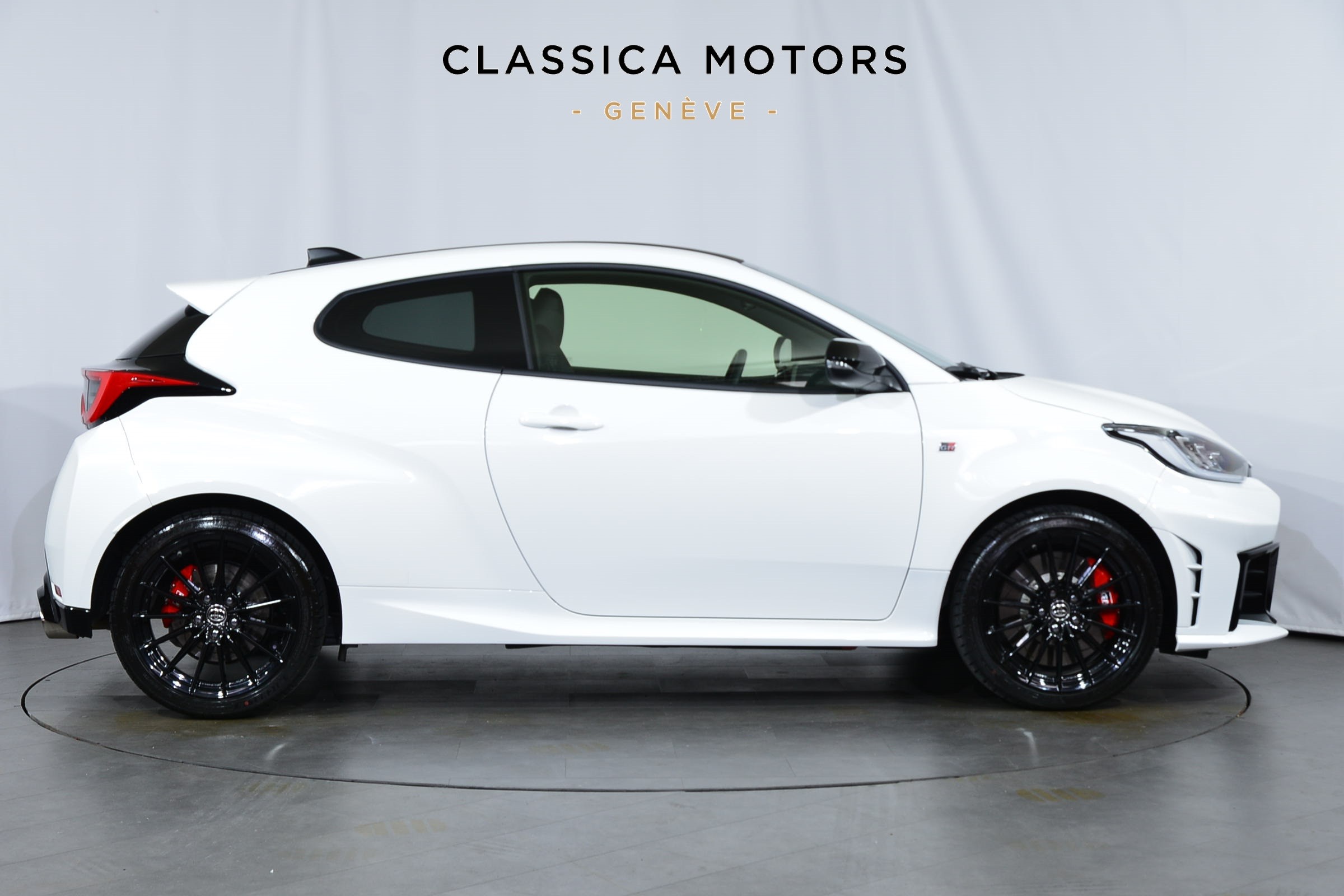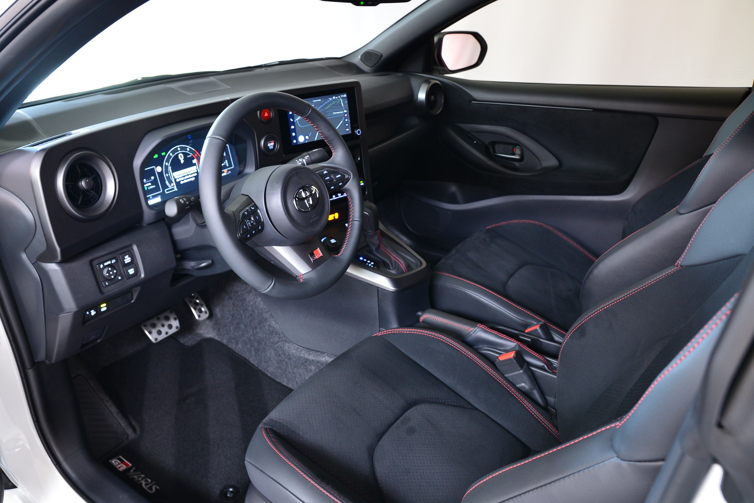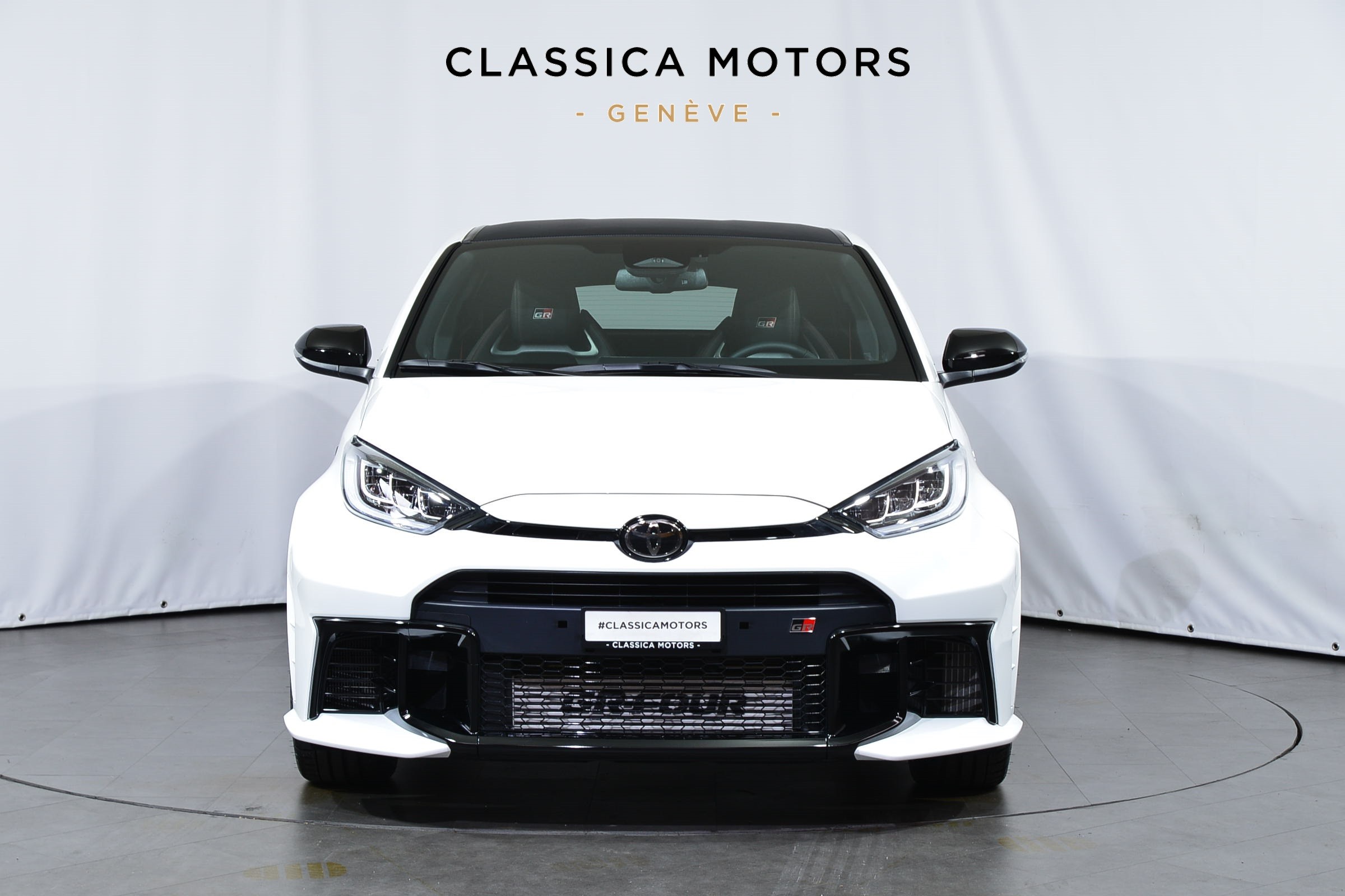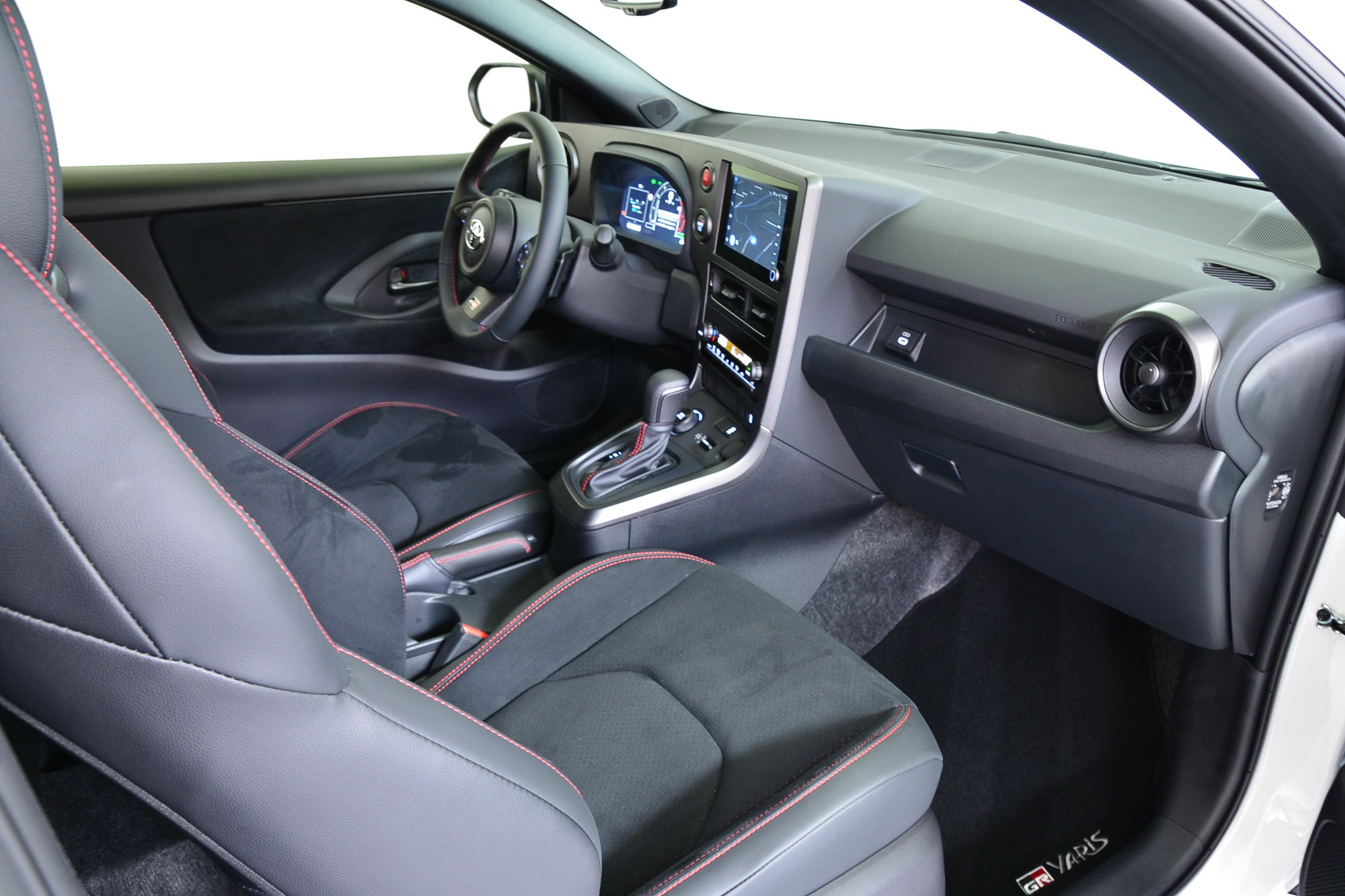 Toyota Yaris 1.6 GR Sport Automatique 4 roues motrices, Véhicule suisse, présentée en Blanc uni avec sièges sport noirs.