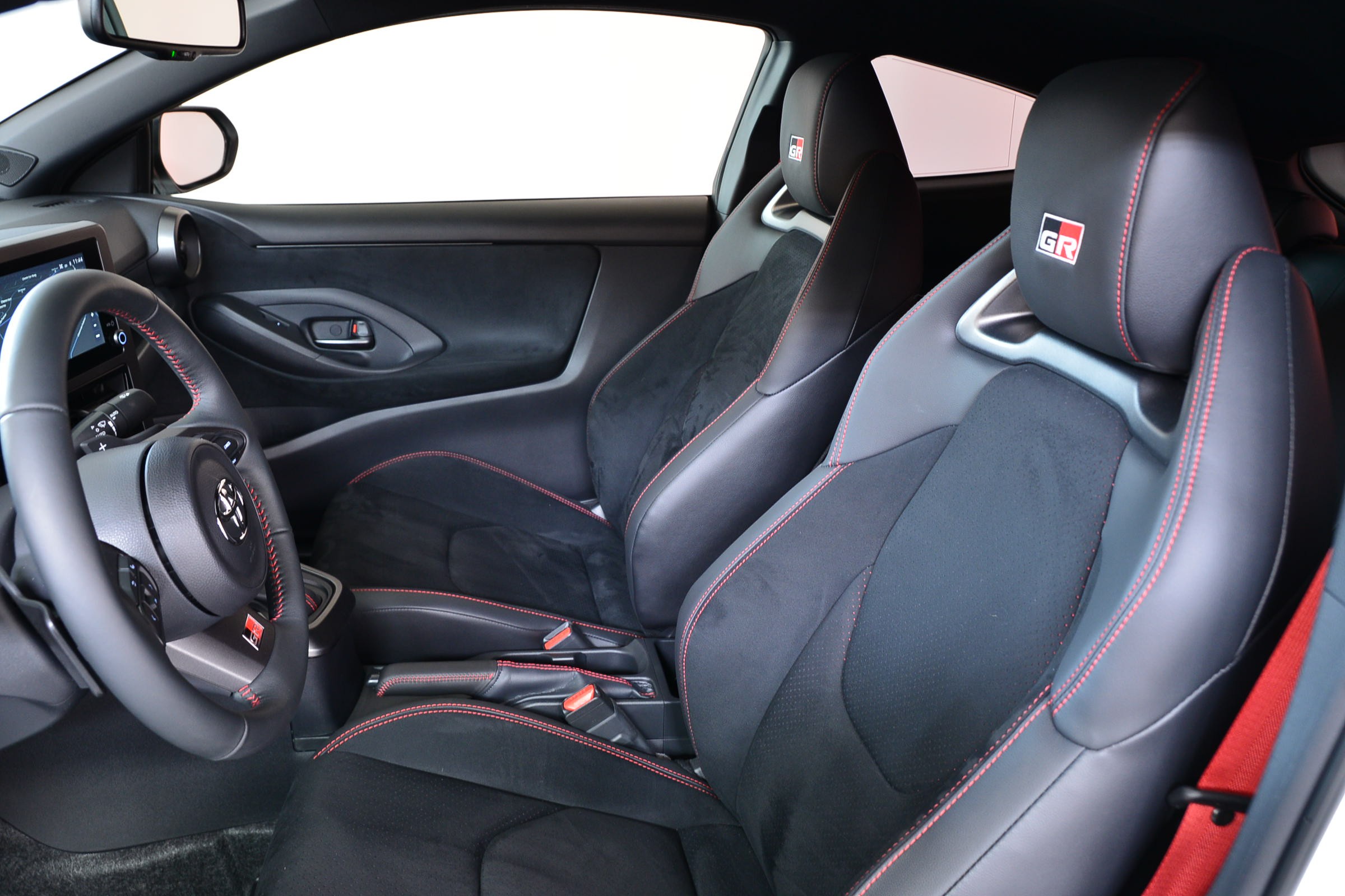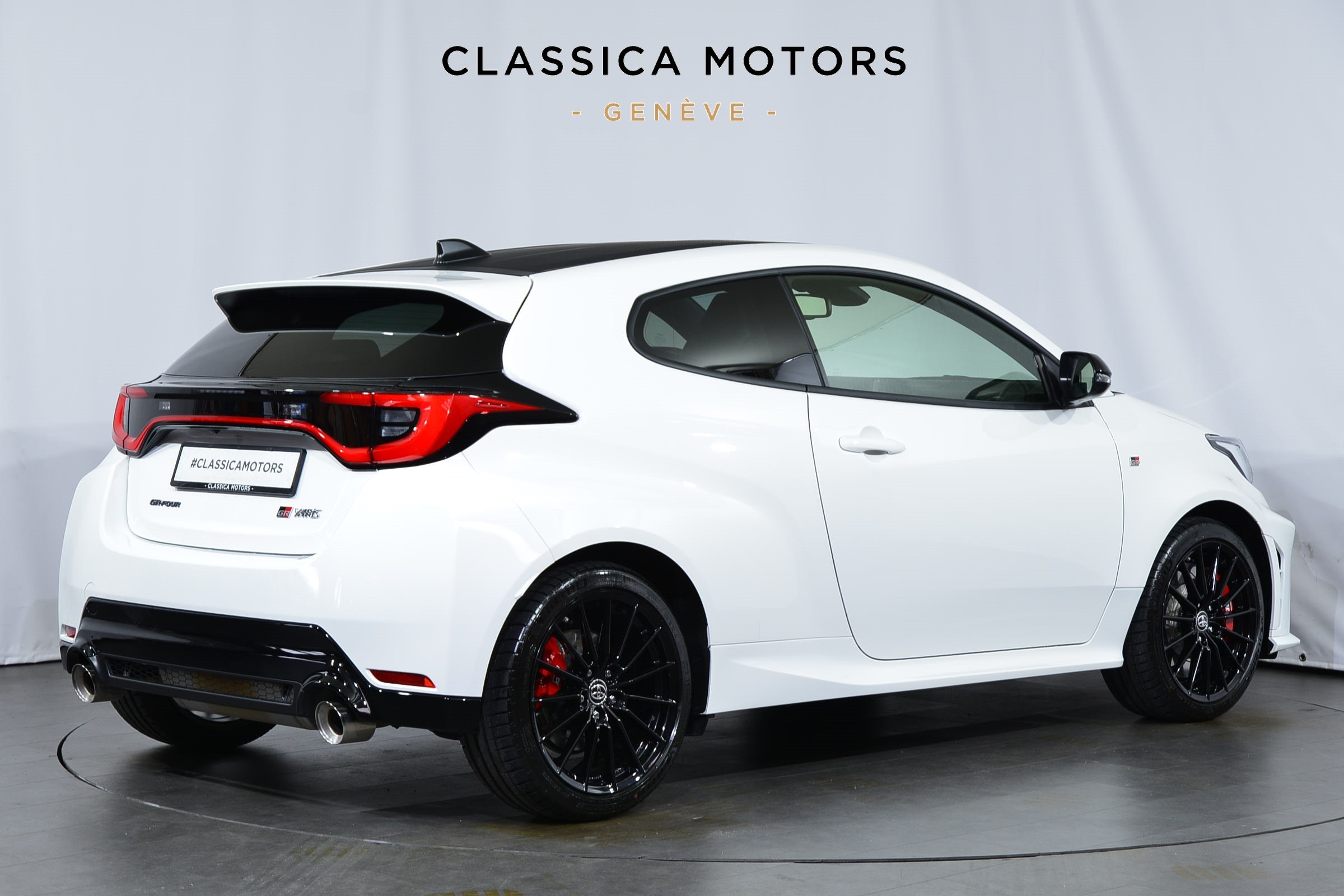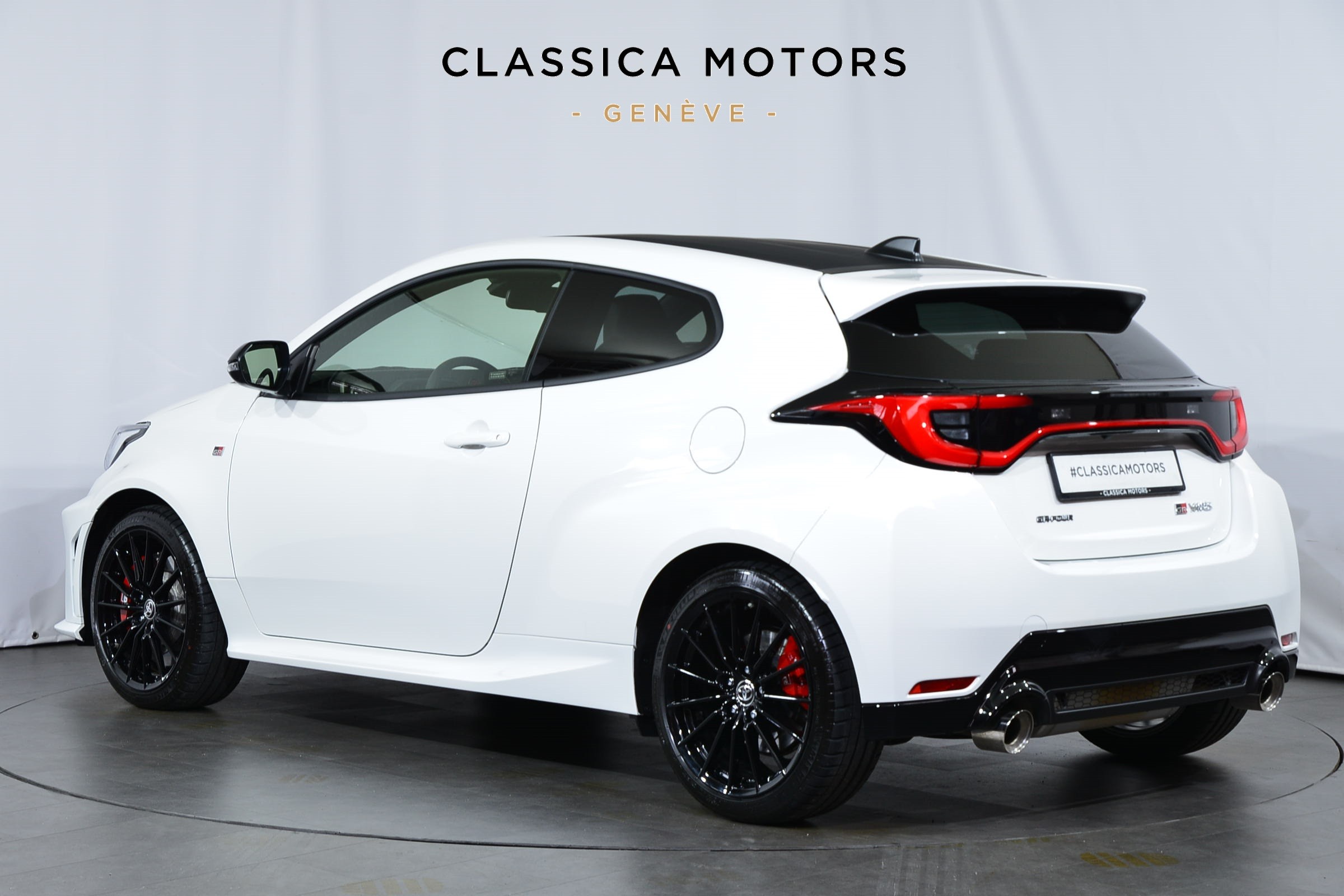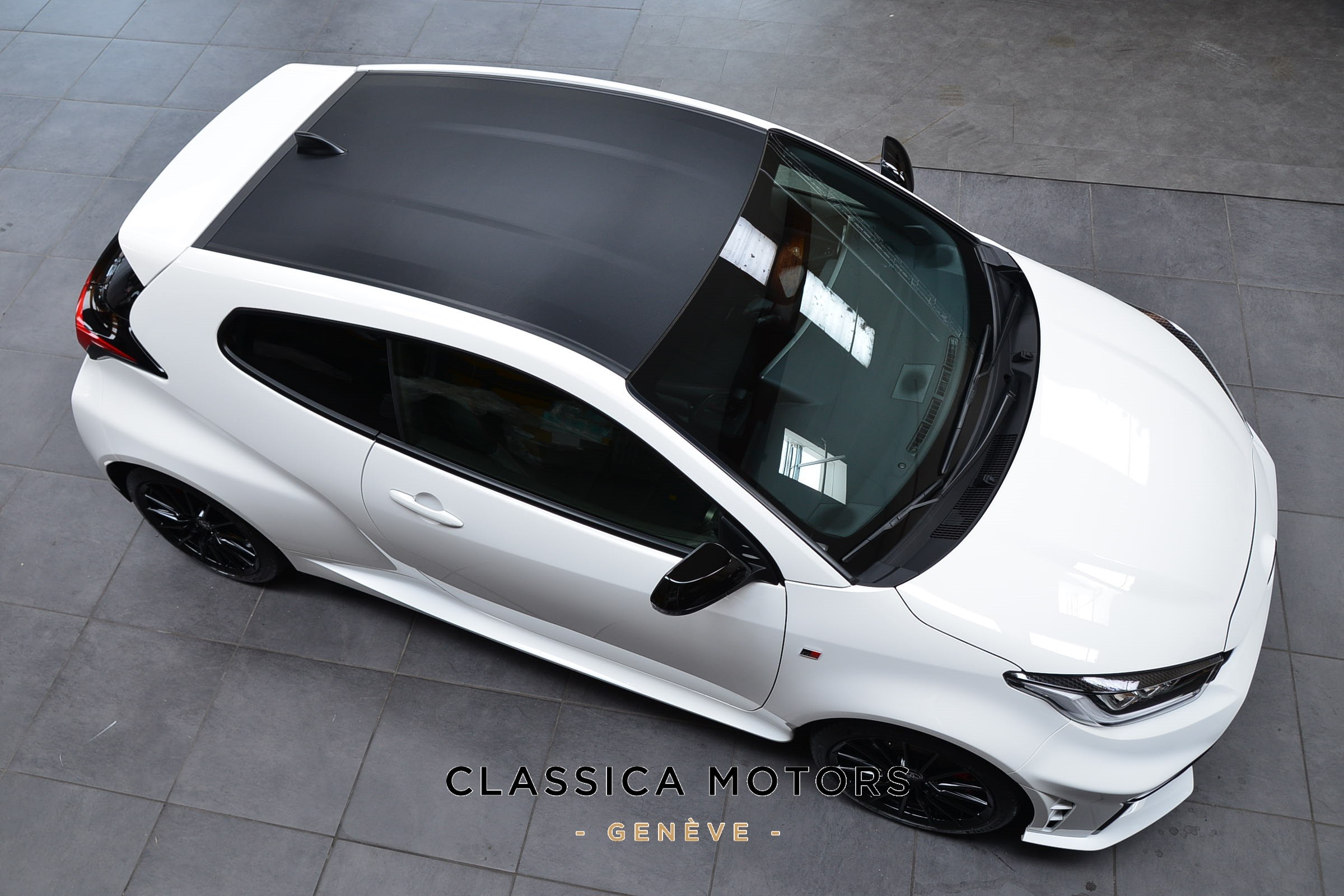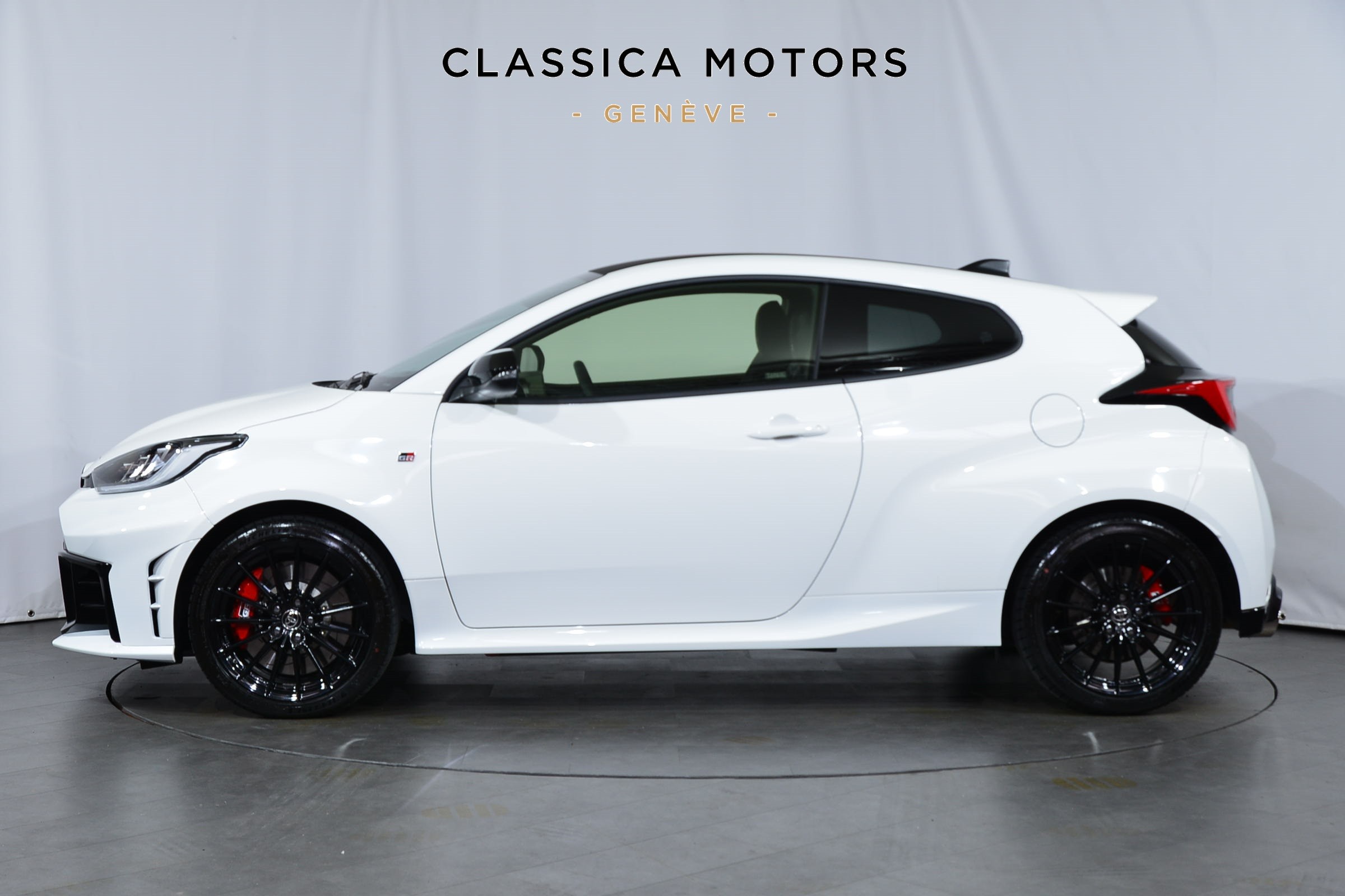 Toyota Yaris 1.6 GR Sport Automatique 4 roues motrices, Véhicule suisse, présentée en Blanc uni avec sièges sport noirs.