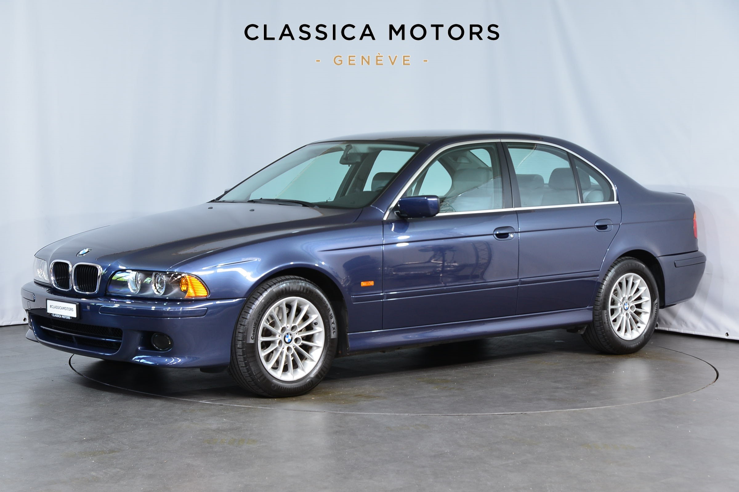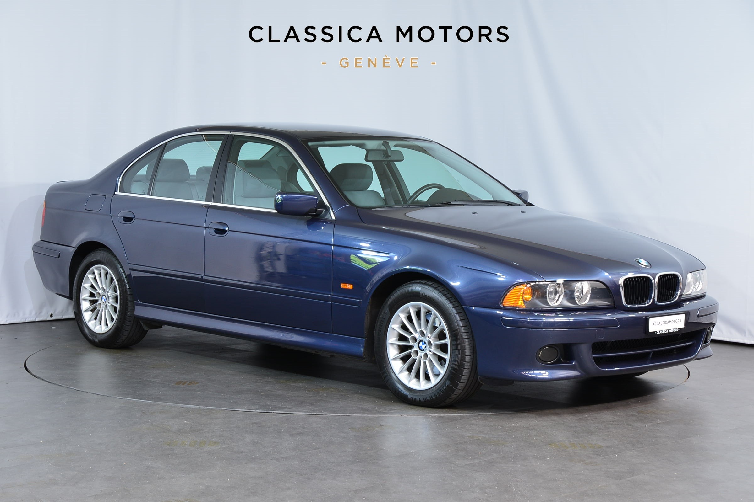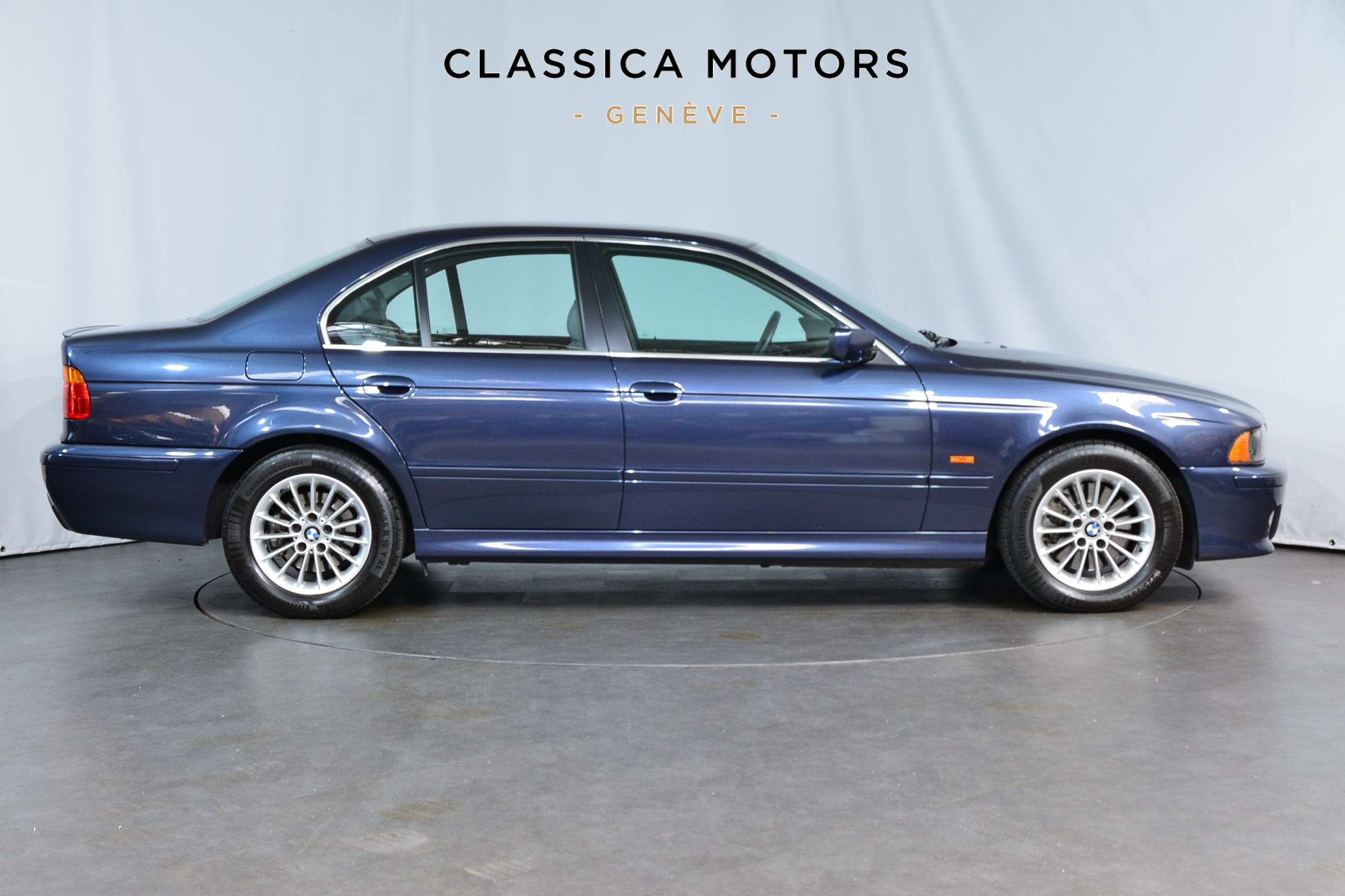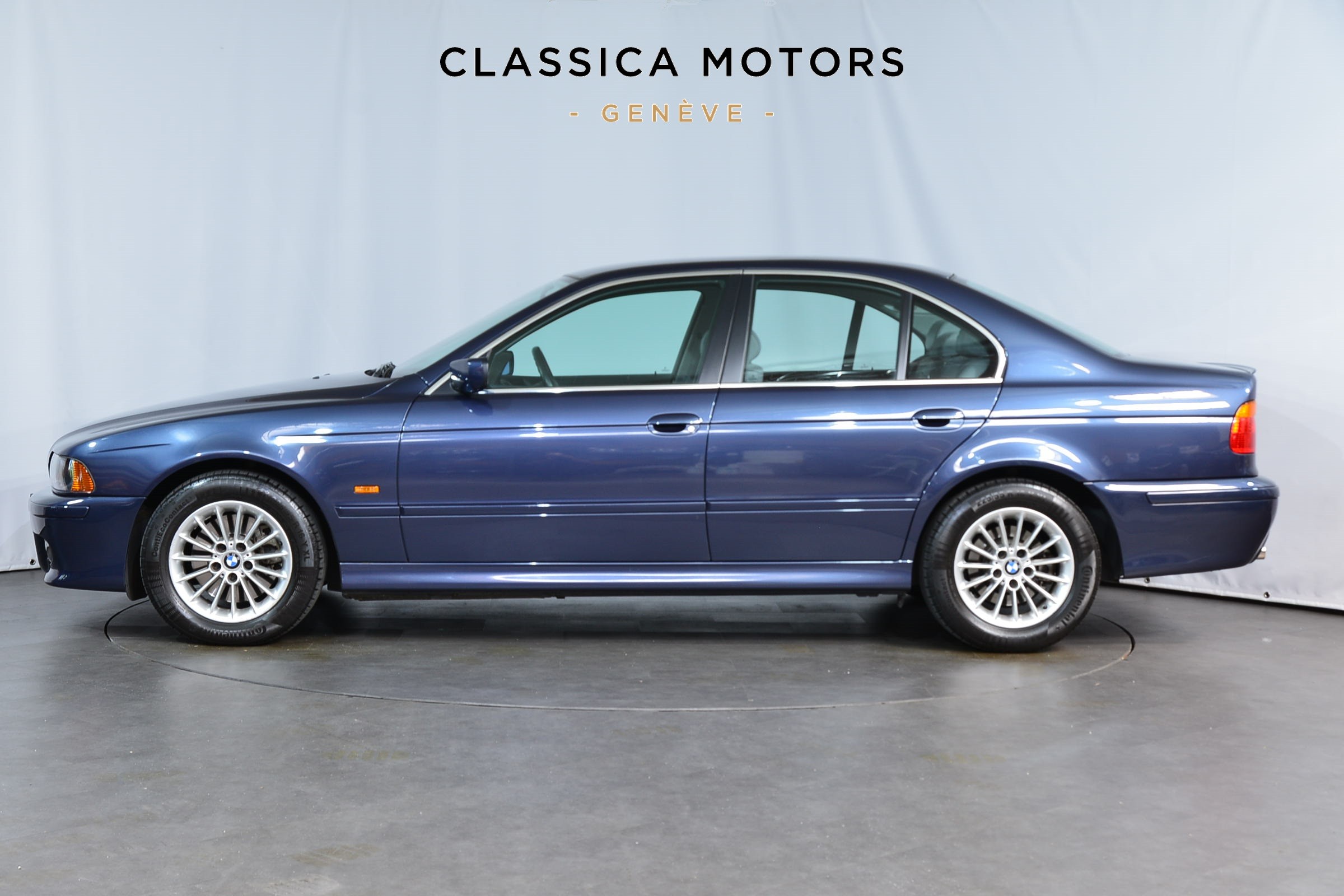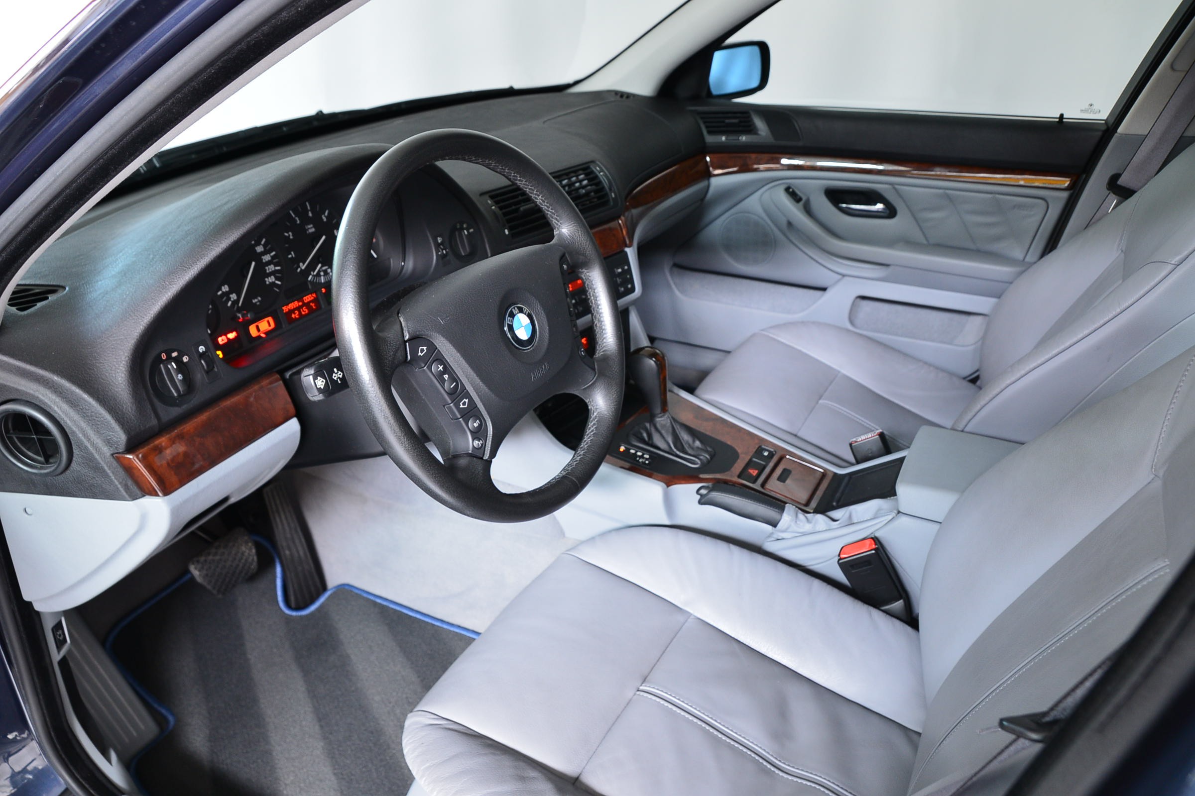 BMW 530i Automatique, Véhicule suisse, présentée dans une teinte Bleu métallisé avec intérieur en cuir Montana gris.