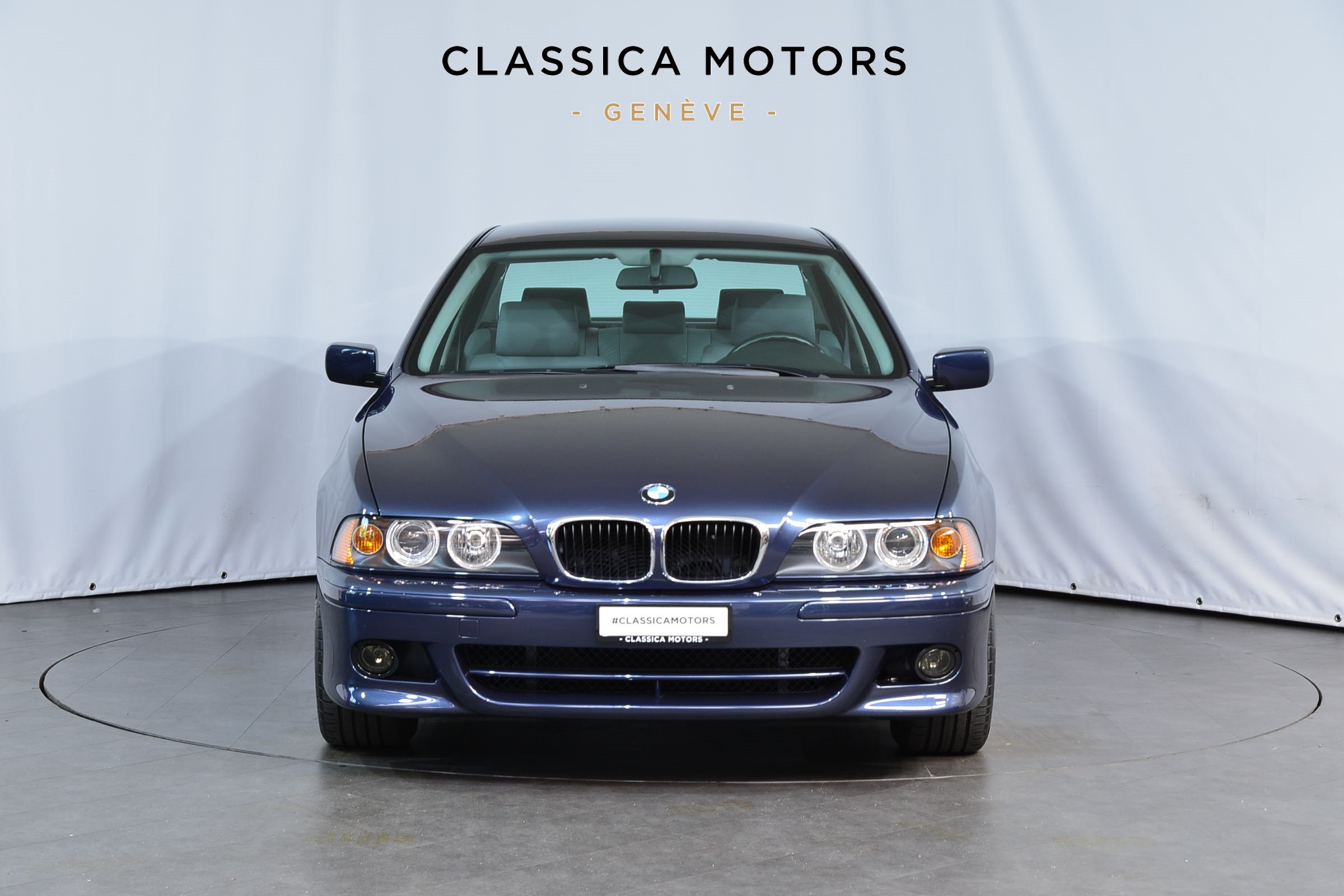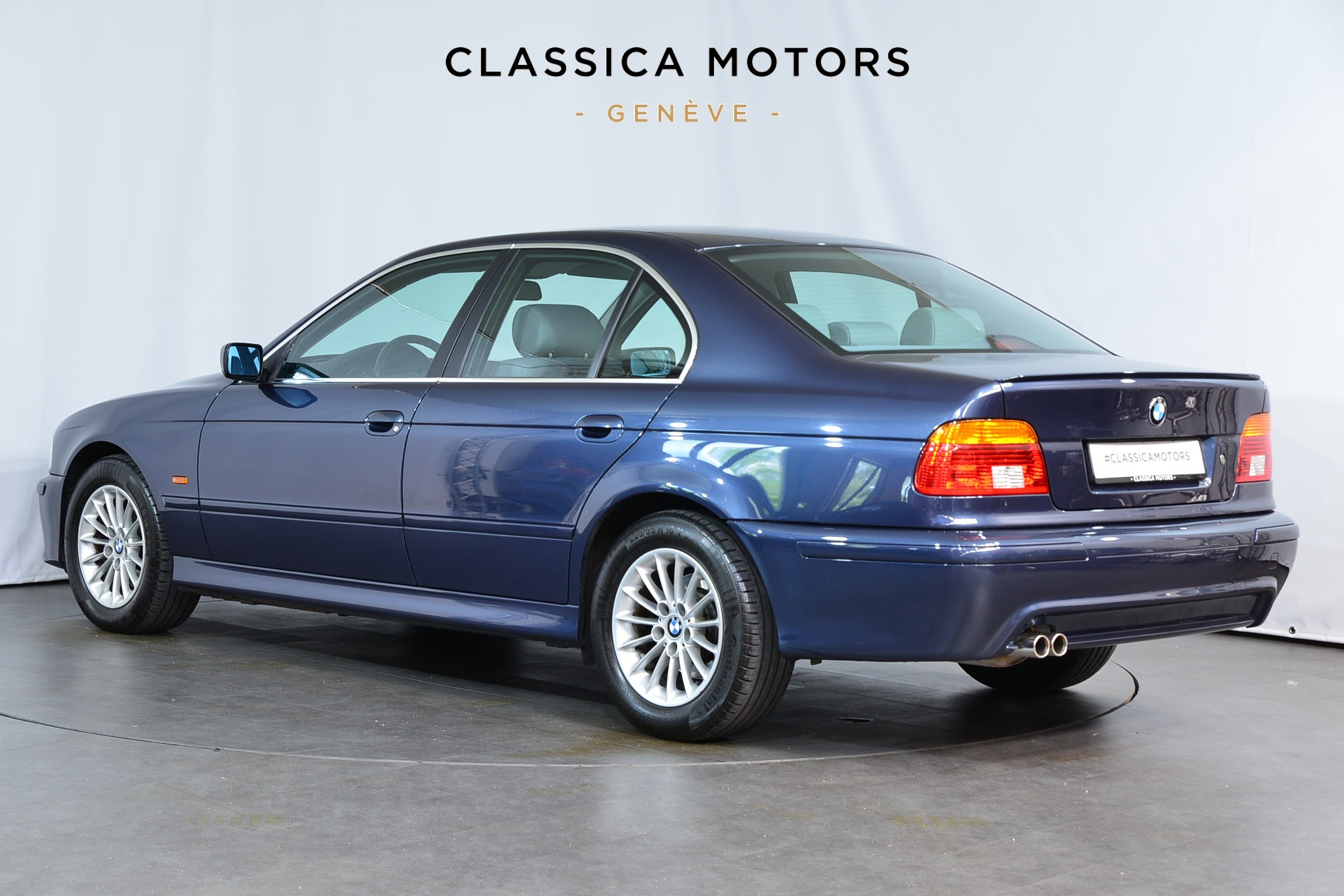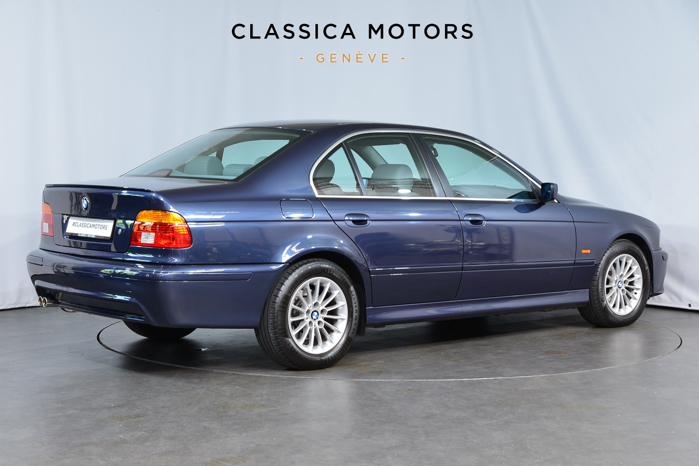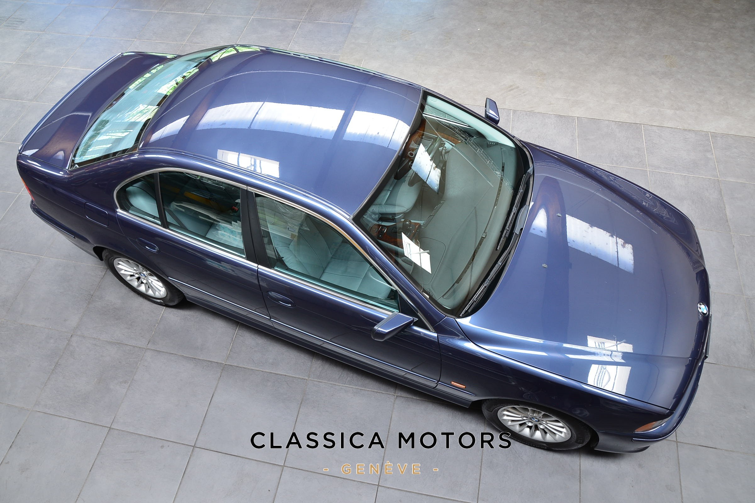 BMW 530i Automatique, Véhicule suisse, présentée dans une teinte Bleu métallisé avec intérieur en cuir Montana gris.