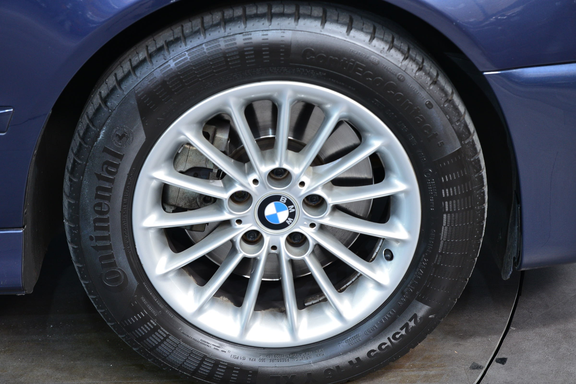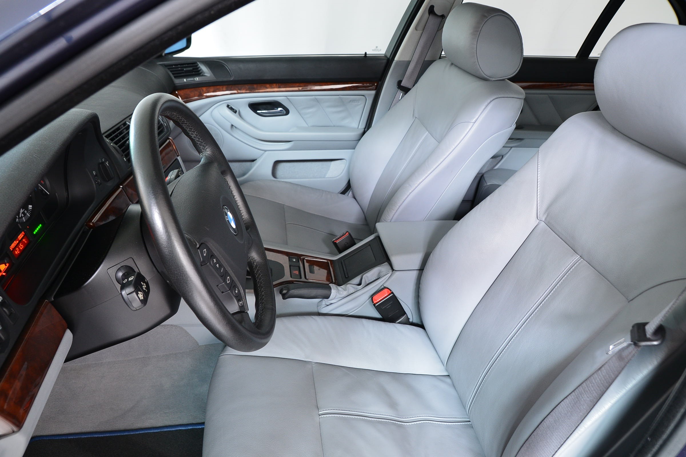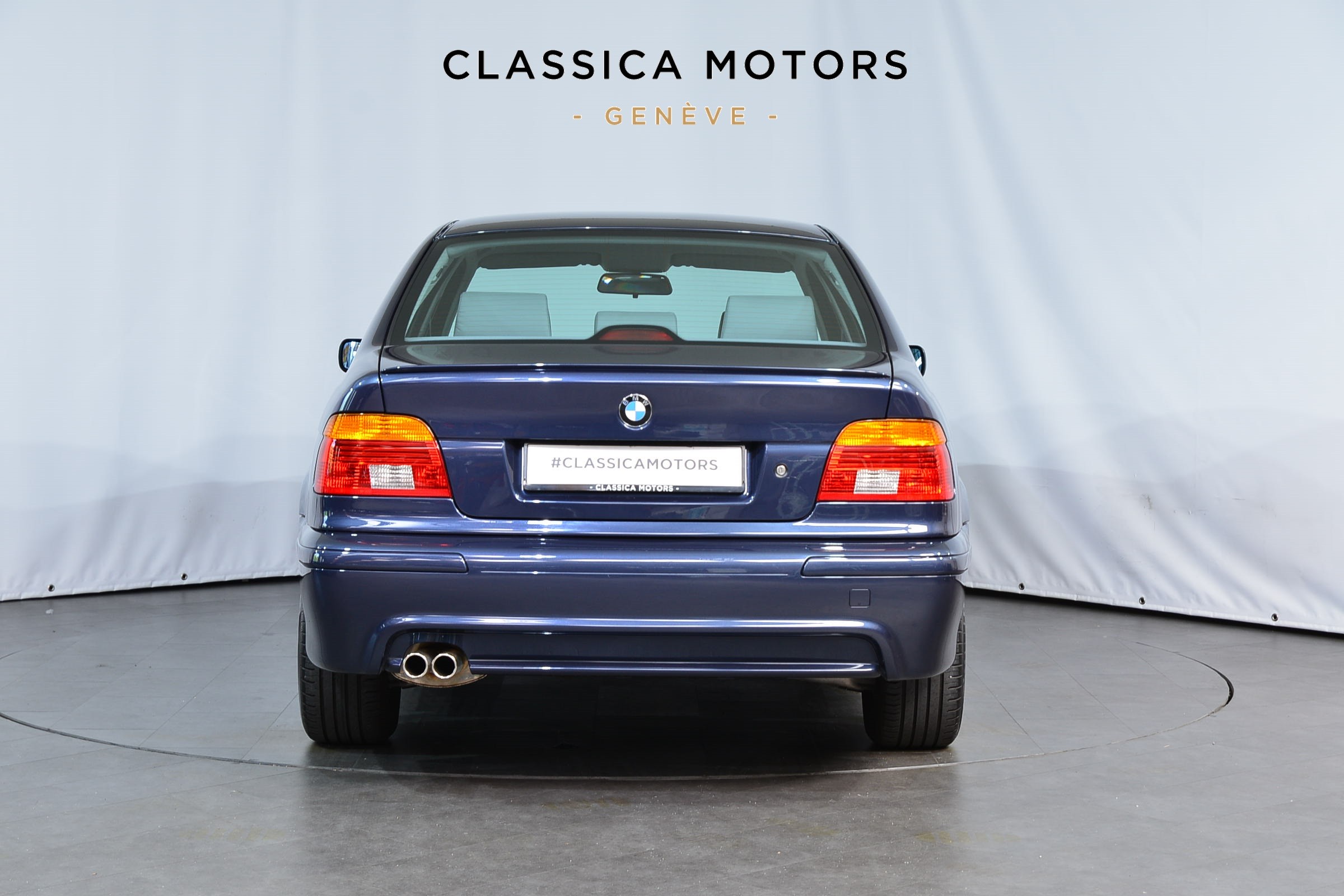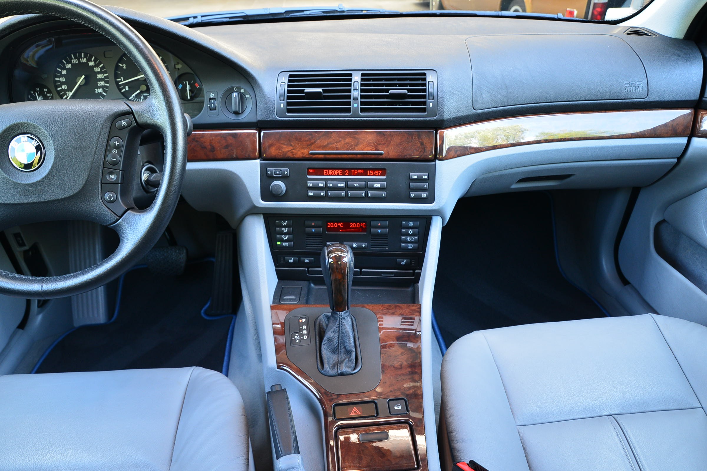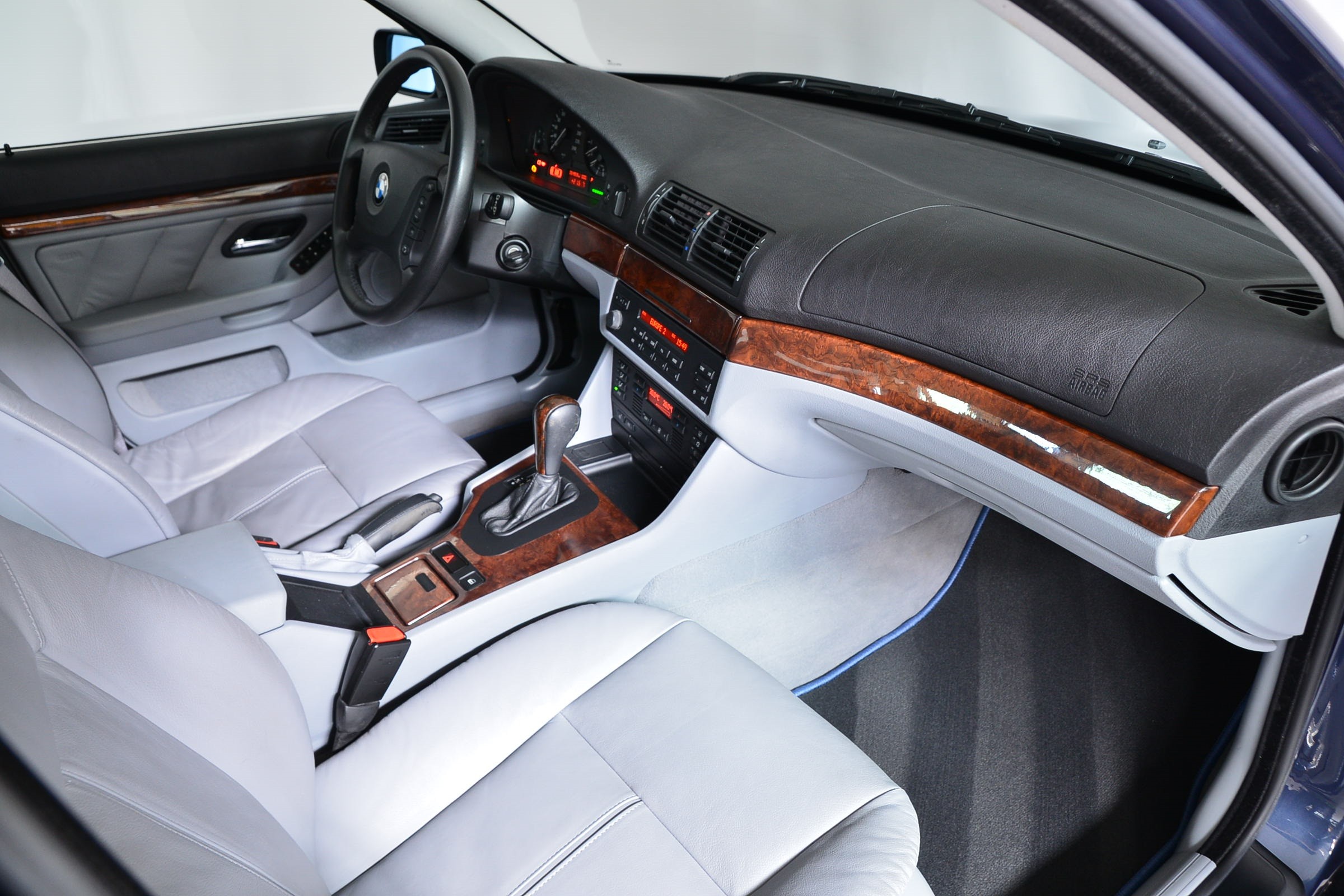 BMW 530i Automatique, Véhicule suisse, présentée dans une teinte Bleu métallisé avec intérieur en cuir Montana gris.