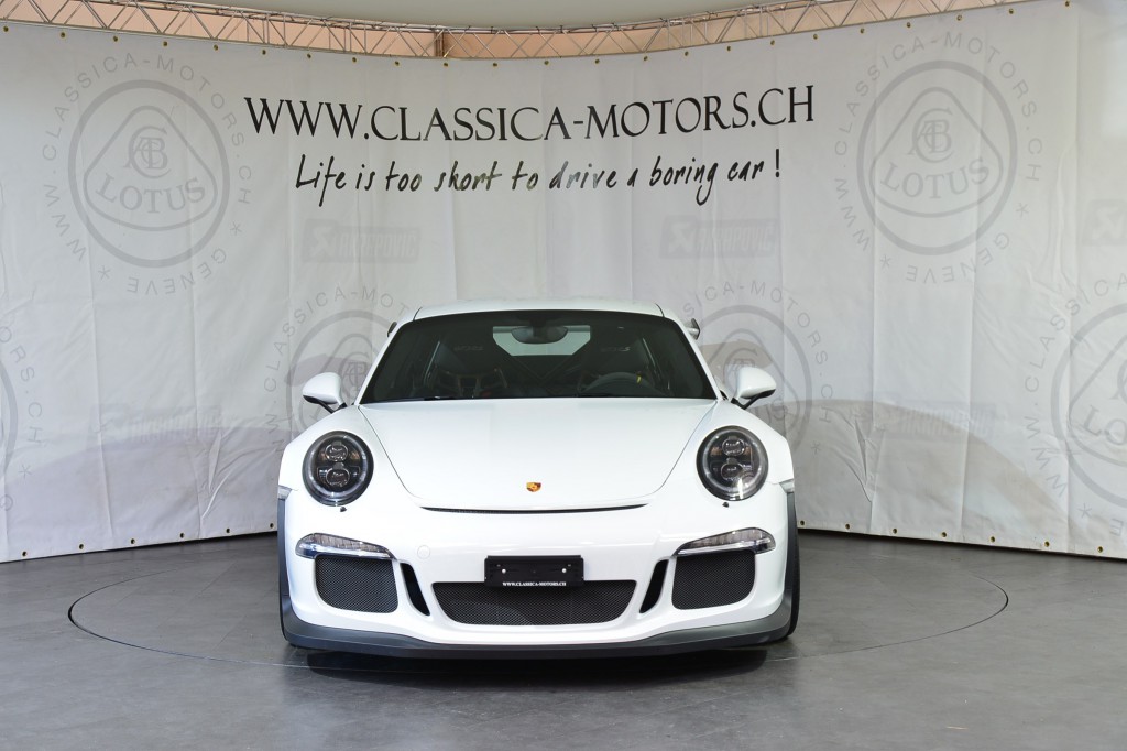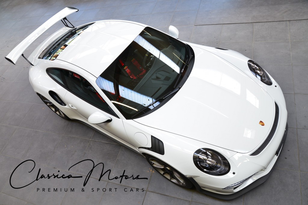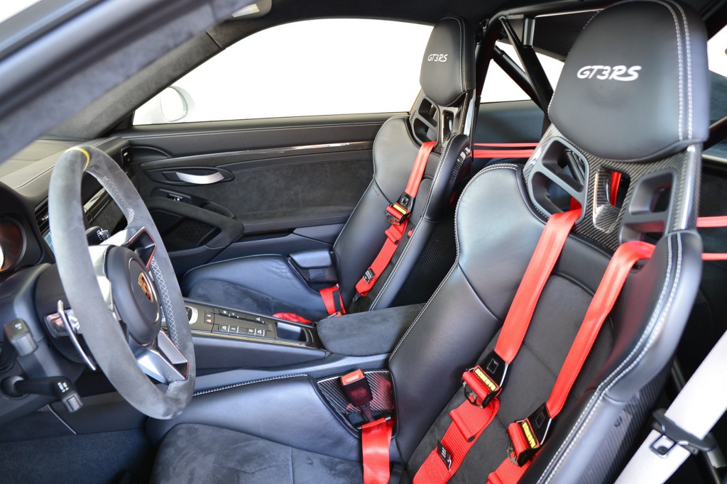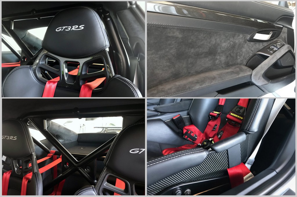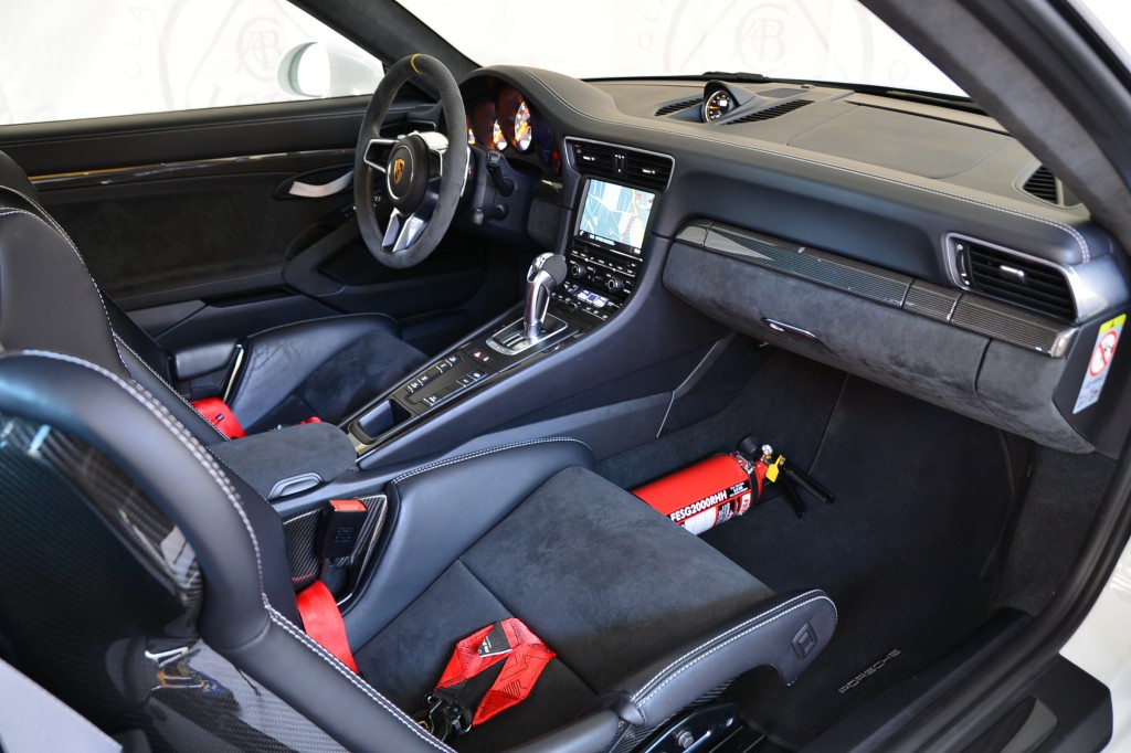 Blanche avec les sièges Baquets 918 Carbone en cuir et Alcantara noir. Pack cuir complet, placage Carbone et coutures grises.