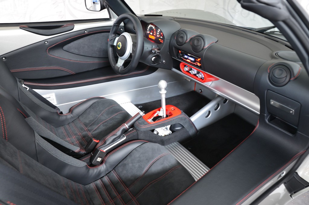 Evora Silver métallisé avec les sièges en Alcantara et coutures rouges.