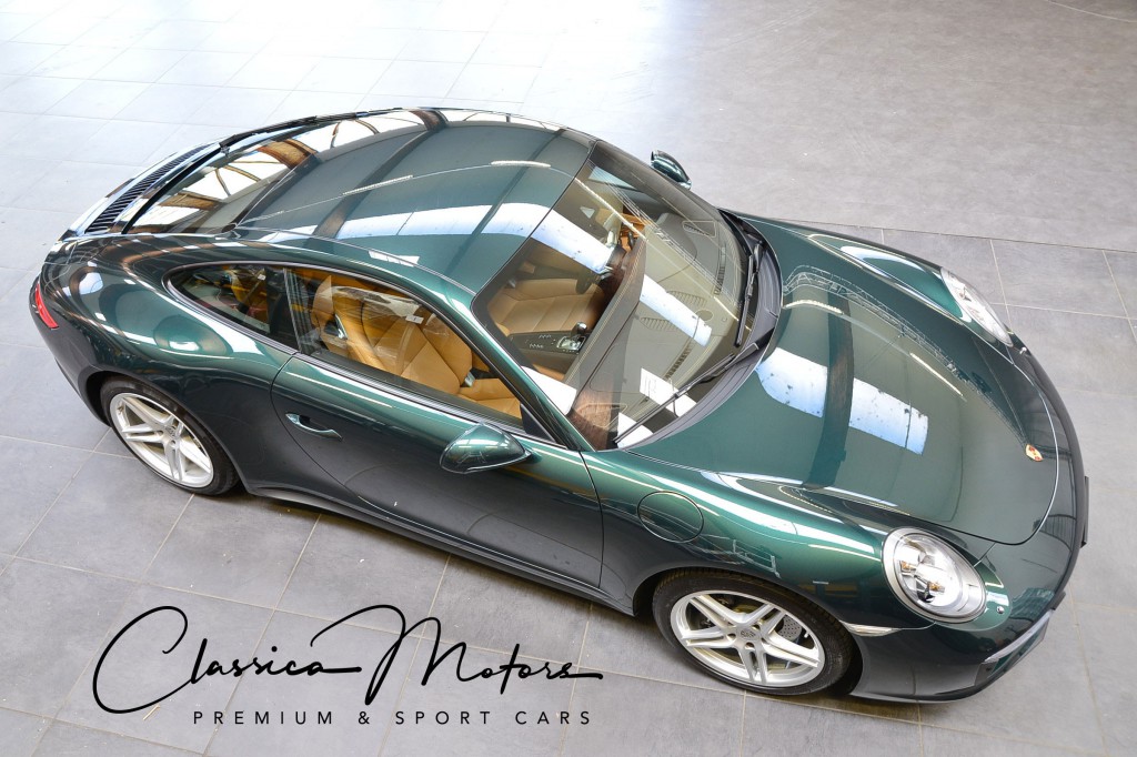 Couleur exclusive vert anglais avec l'interieur en cuir naturel bicolor, ciel de toit alcantara brun, haut du tableau de bord cuir brun, volant cuir brun.
