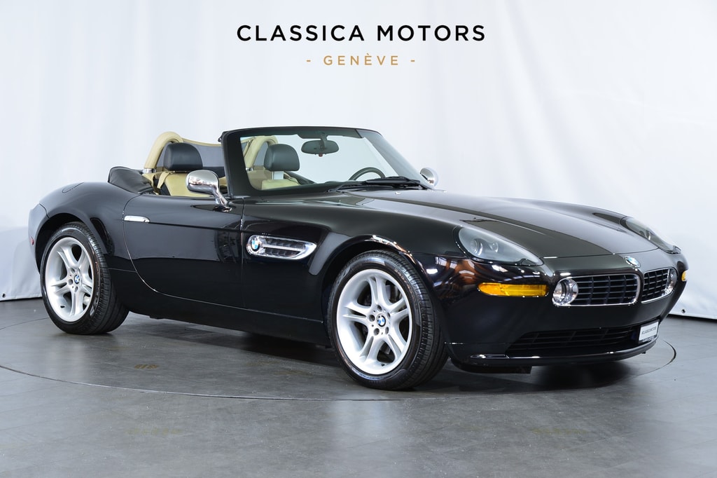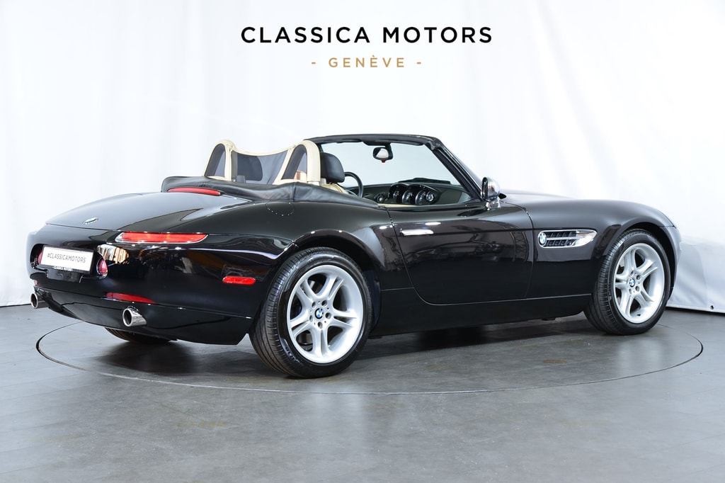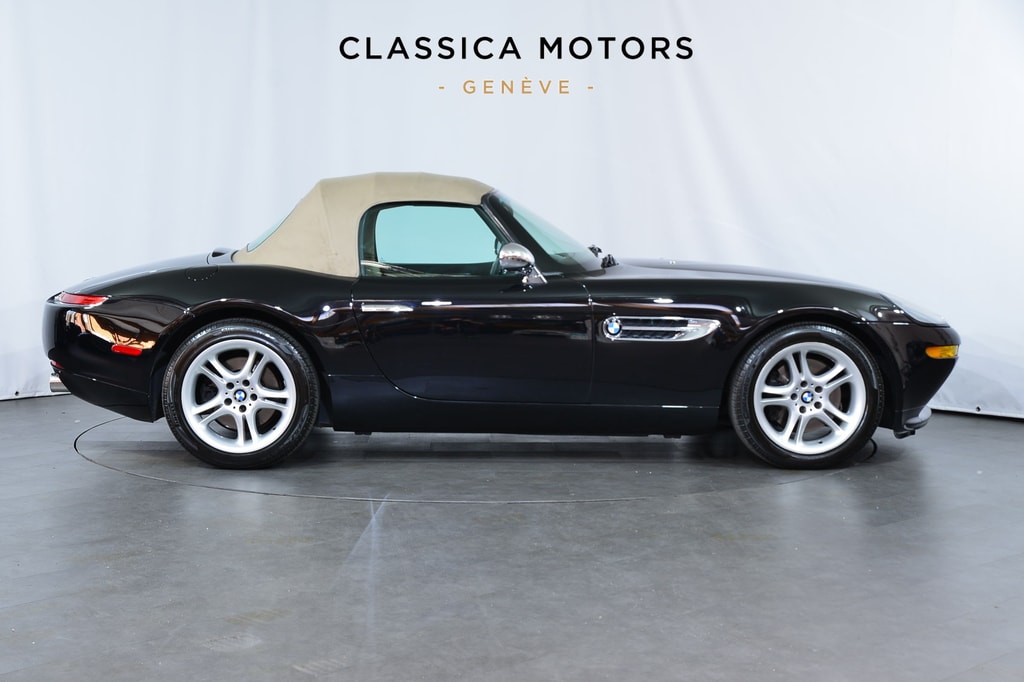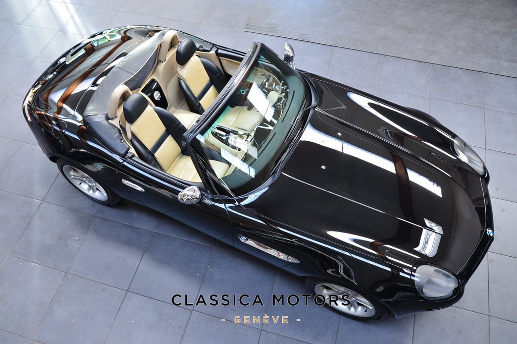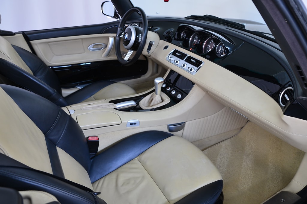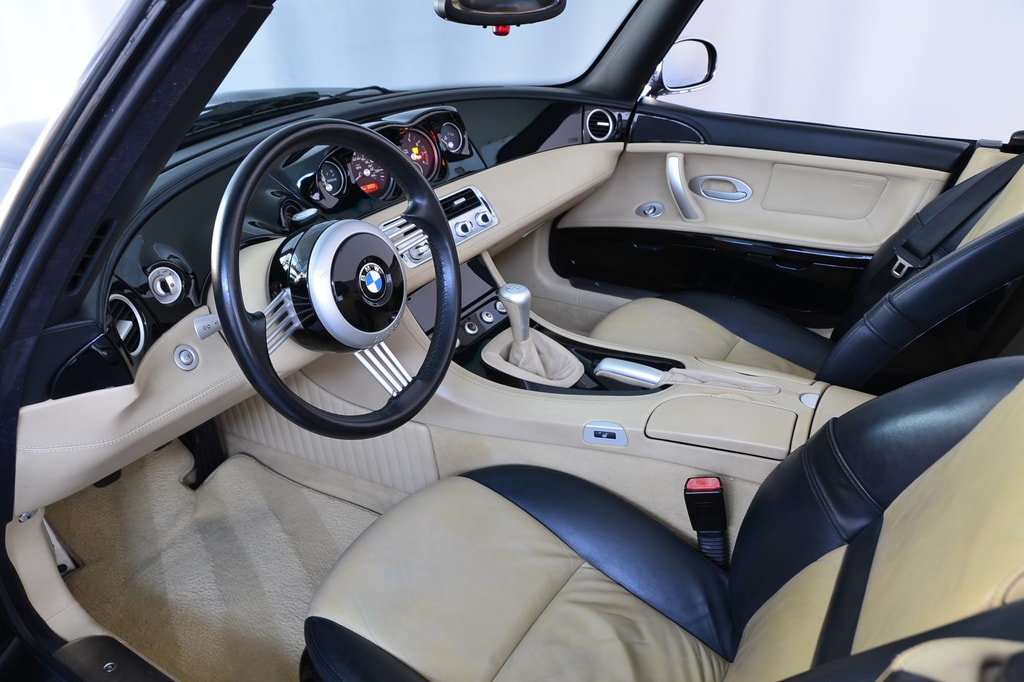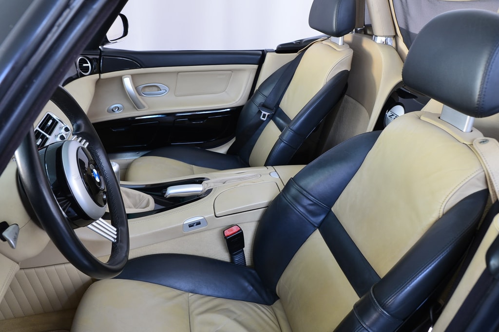 Noir métallisé avec les sièges en cuir beige noir et capote beige.