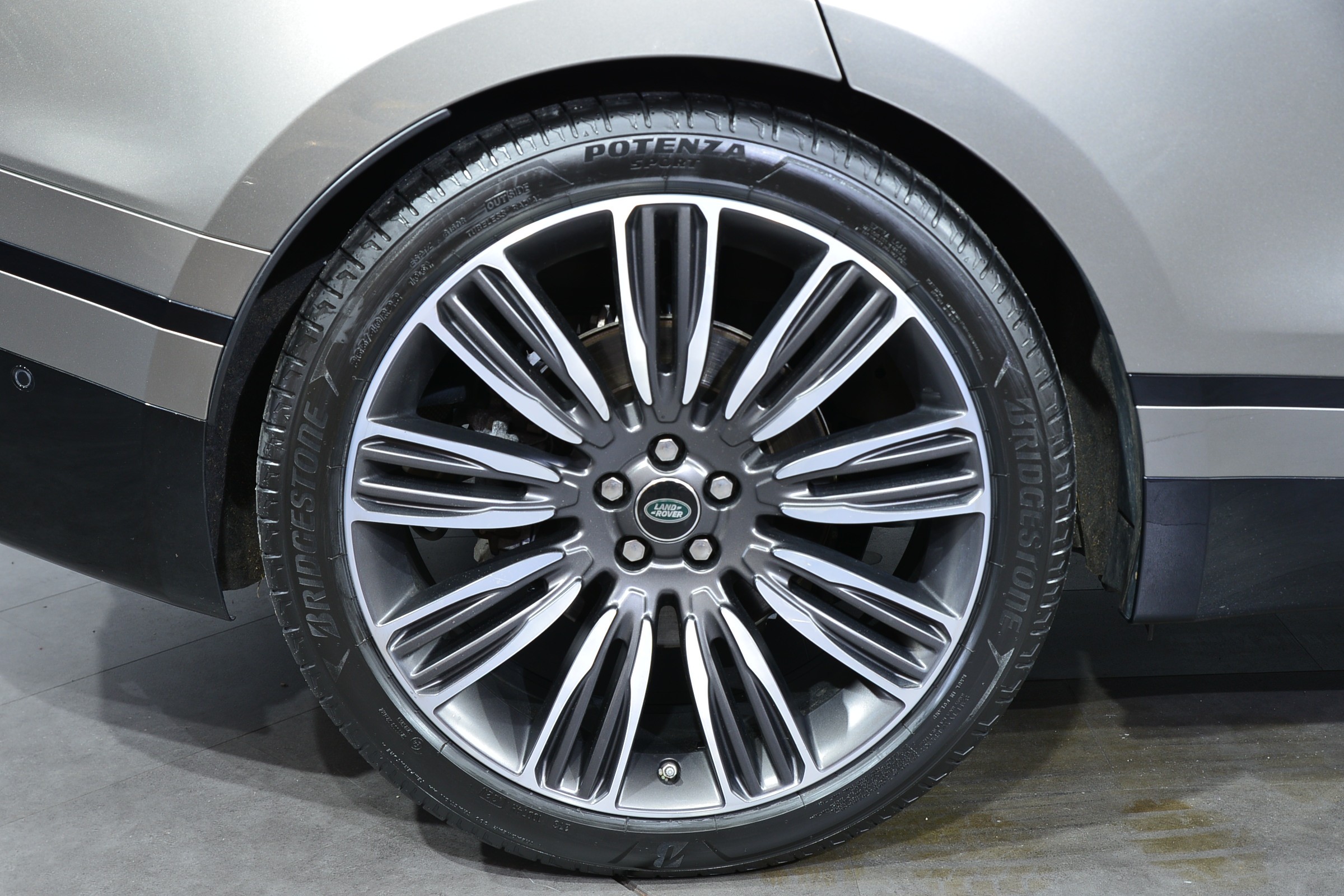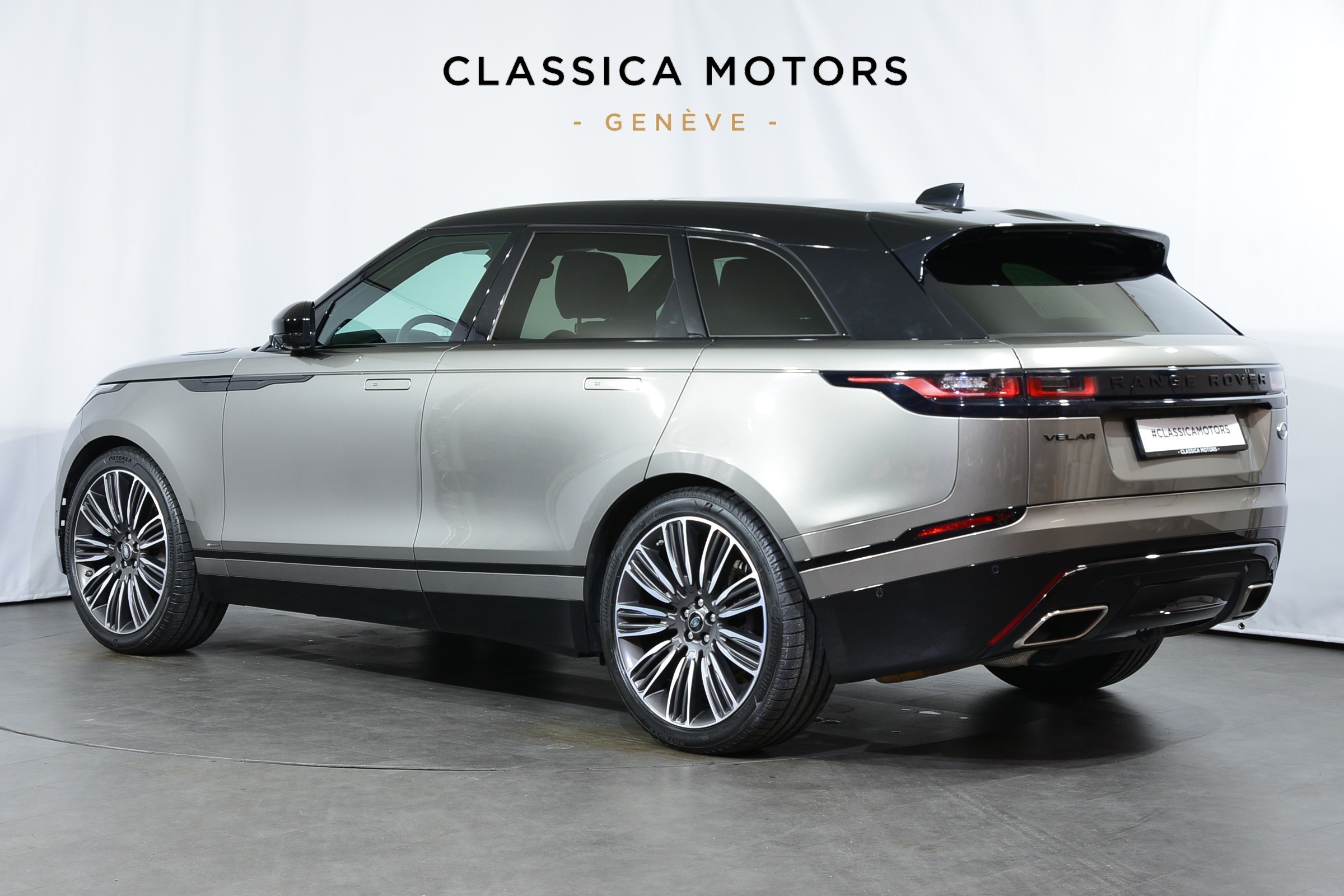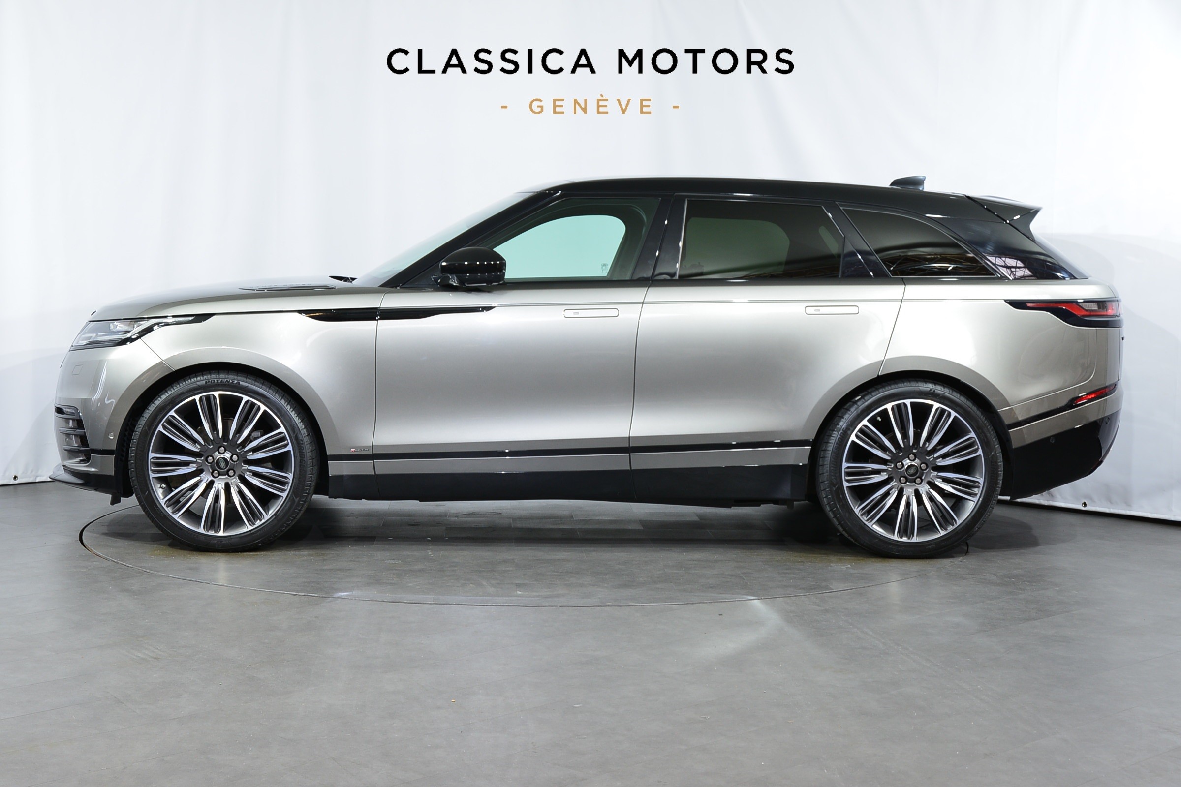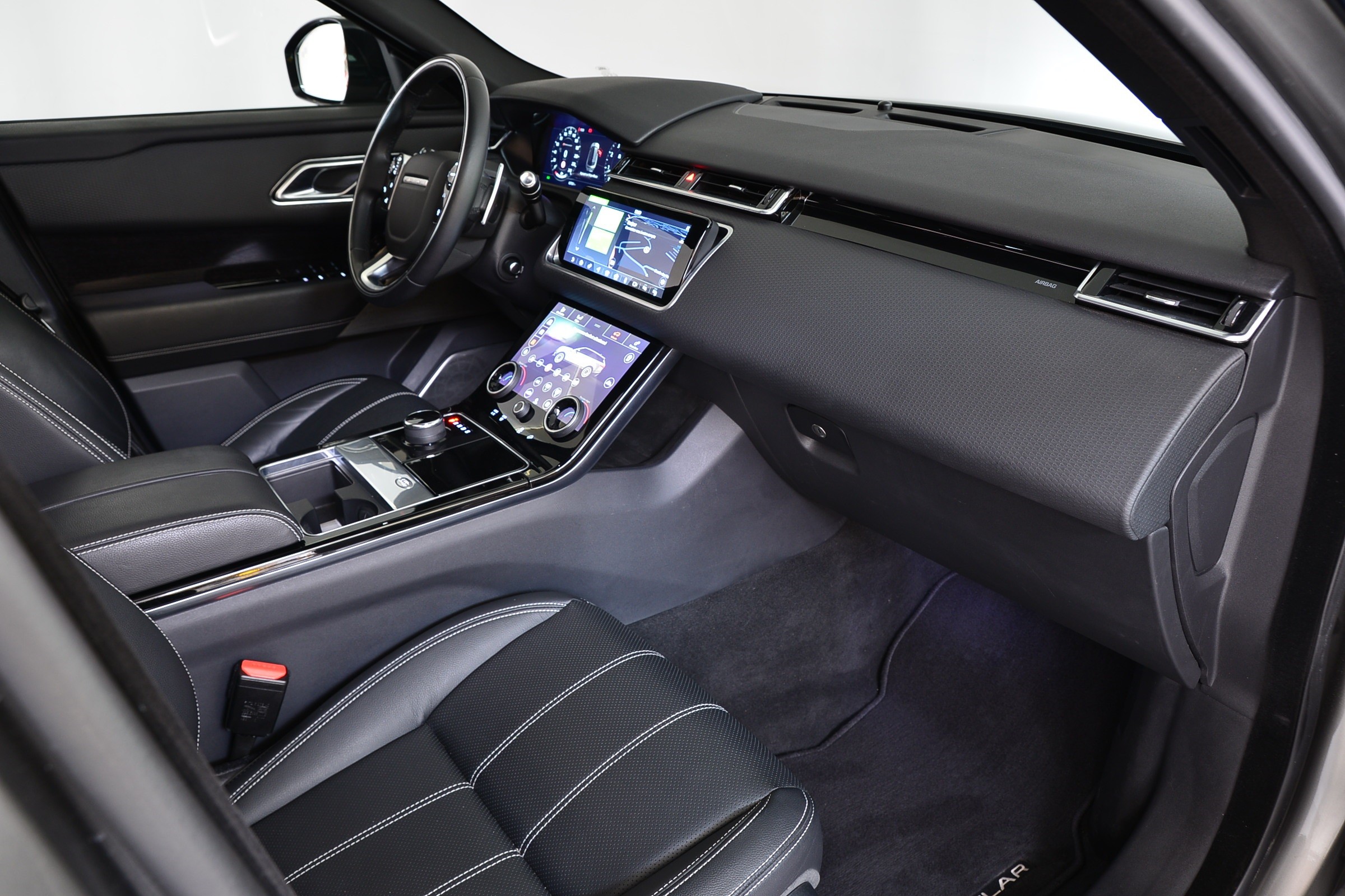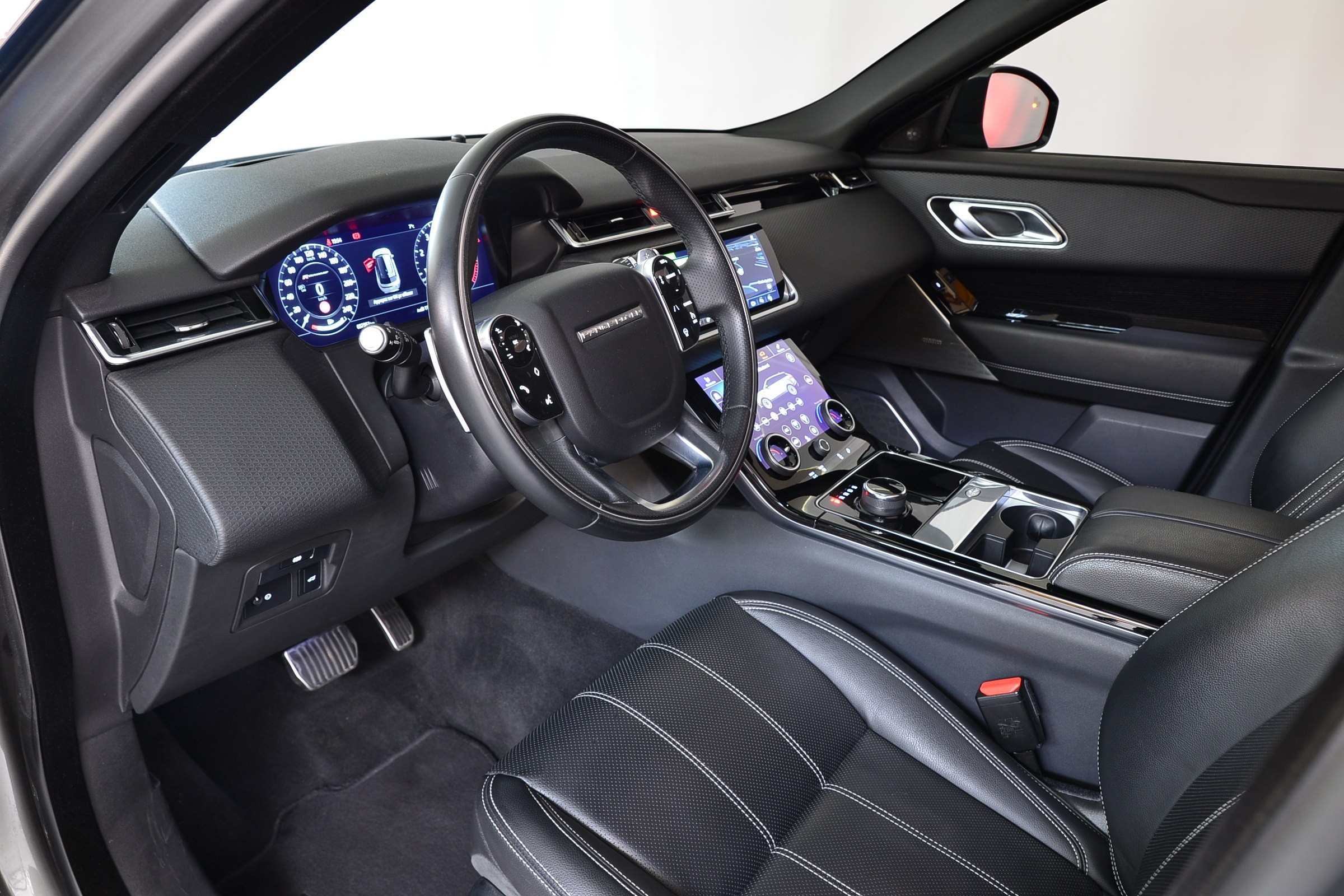 Land Rover Range Rover Velar R-Dynamic P300 SE, Véhicule suisse, présenté dans une élégante combinaison Gris/Beige métallisé avec sièges en cuir noir perforés.