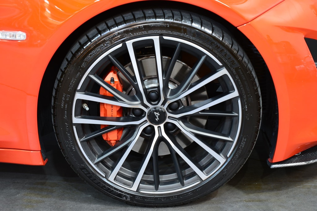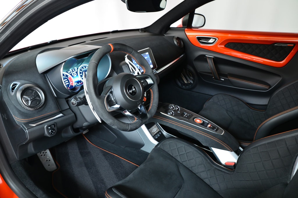 Orange Feux métallisé avec les sièges baquets en Alcantara noir.