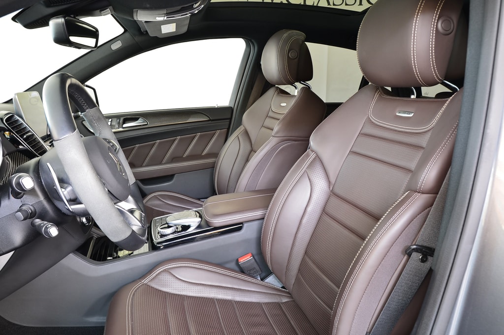 Gris Sélénite métallisé avec les sièges sport AMG en cuir Exclusiv brun.