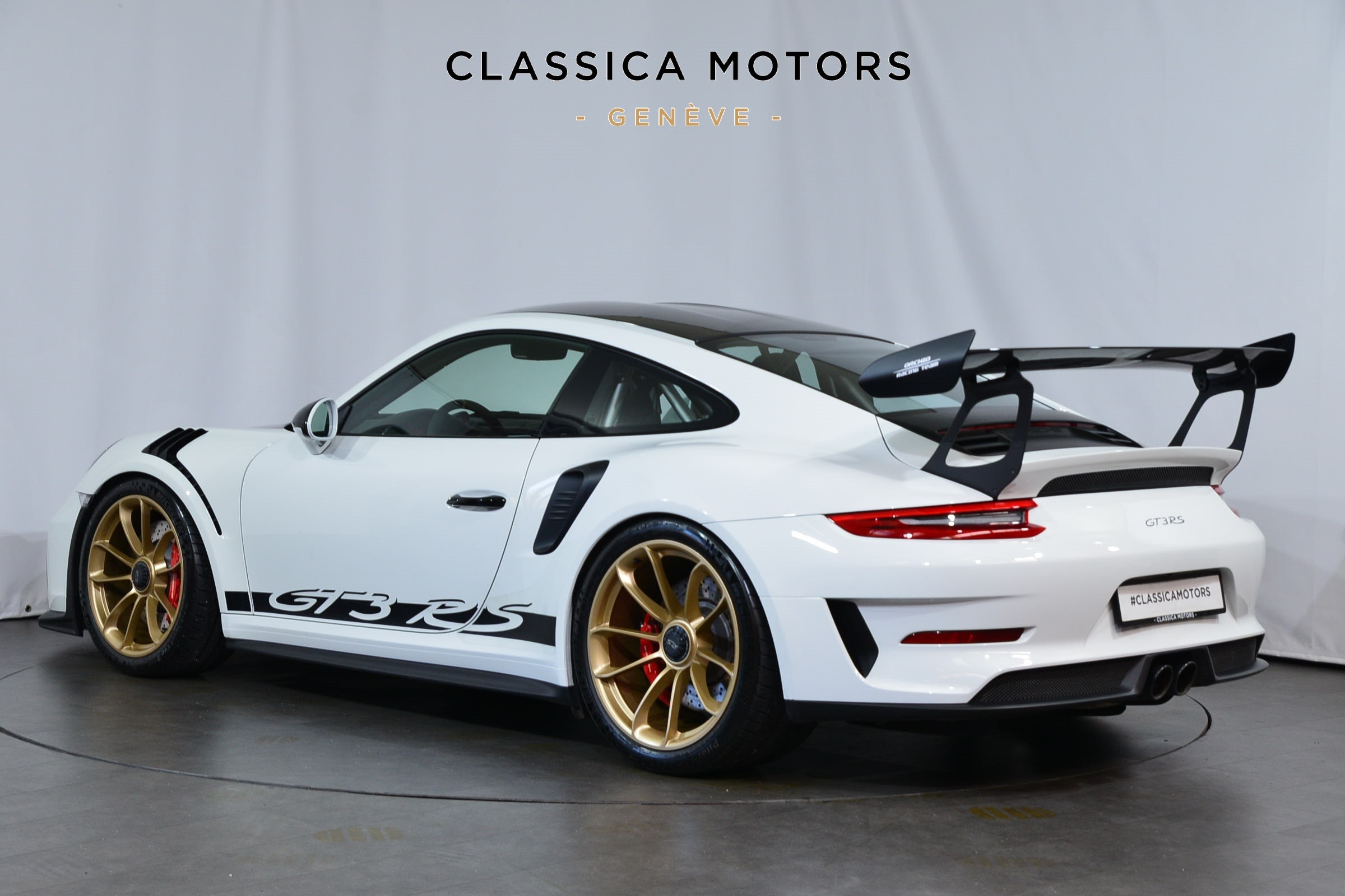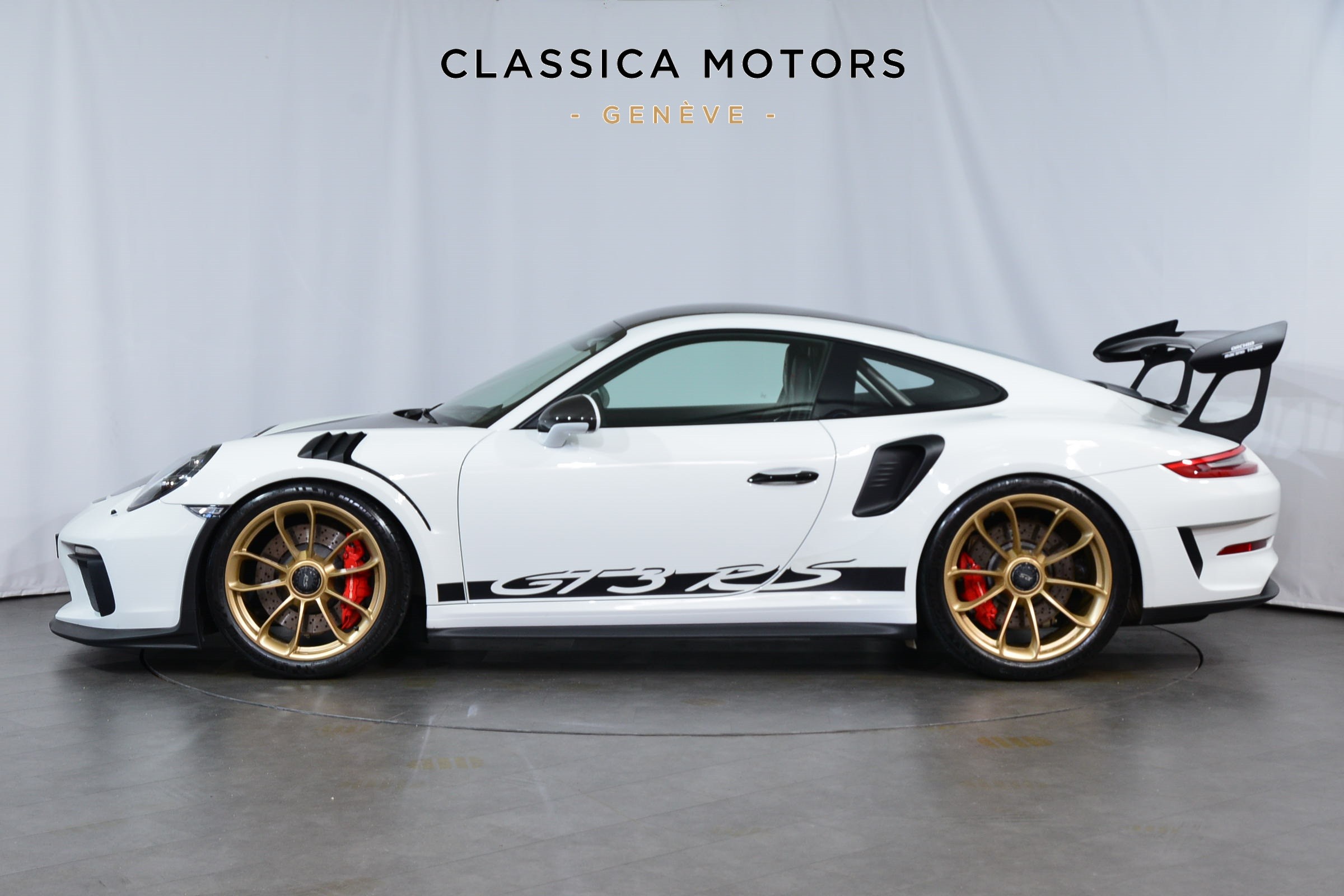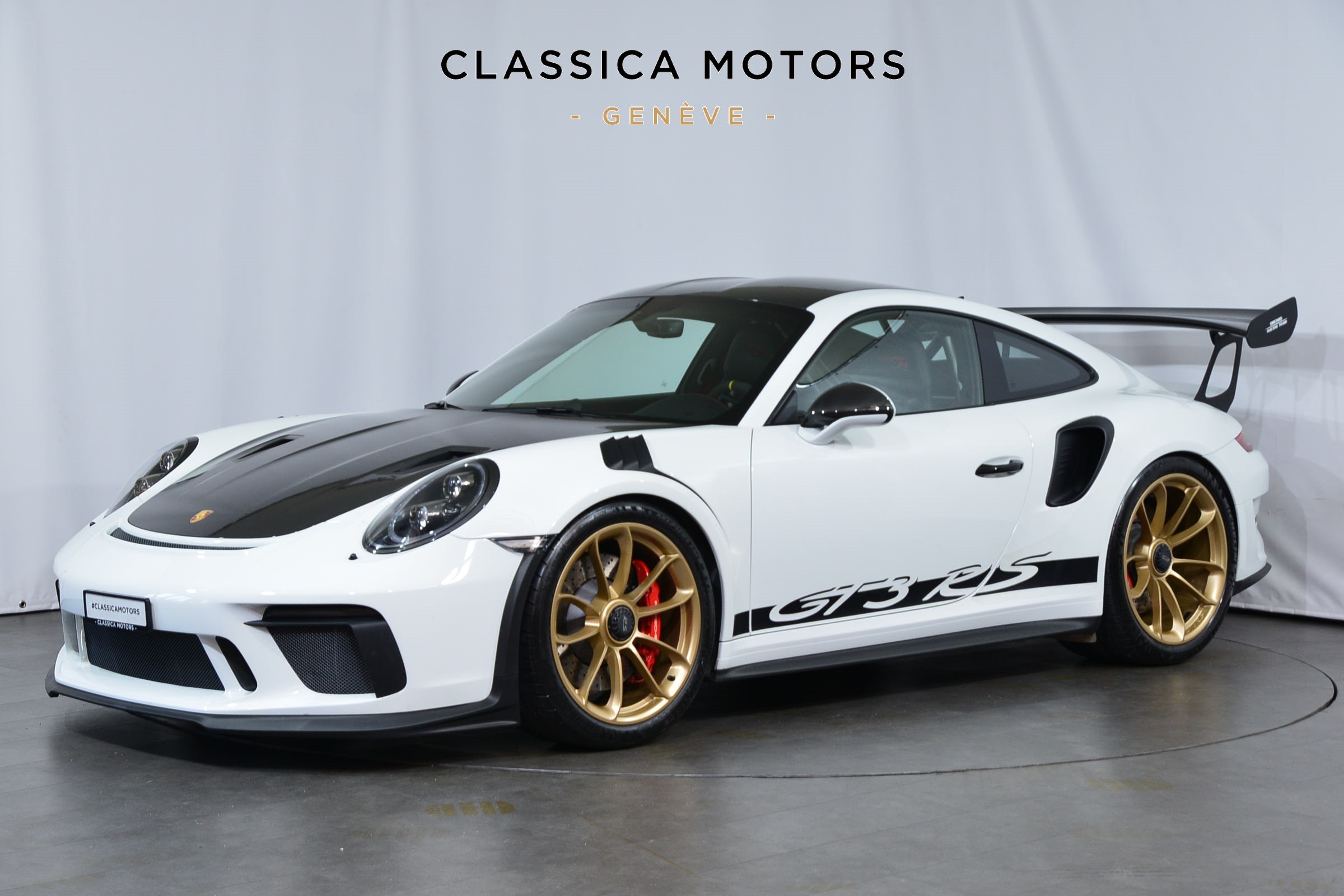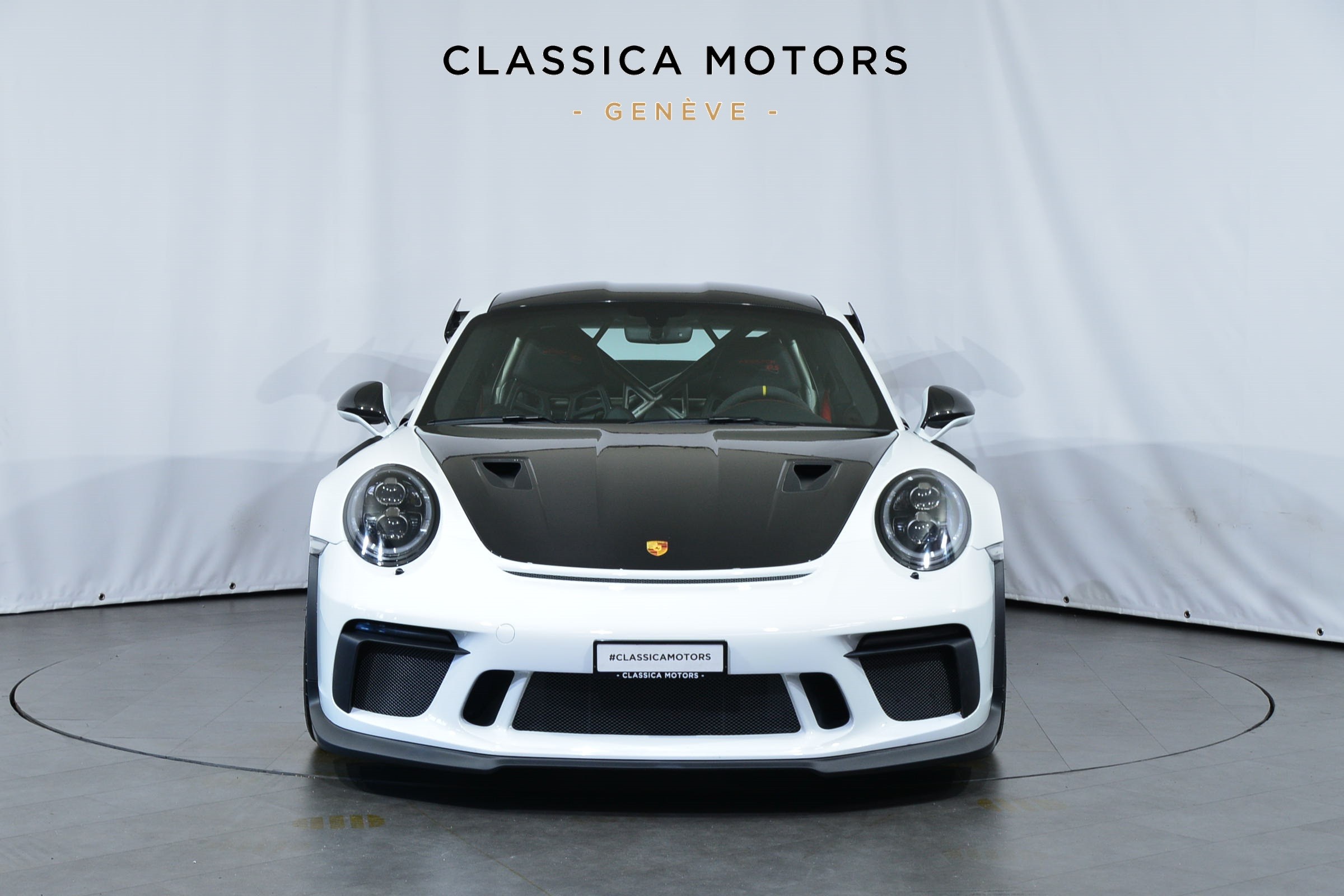 Porsche 911 GT3 RS (991.2) Pack Weissach, Véhicule suisse, présentée dans une teinte Blanc uni avec sièges baquets noirs.