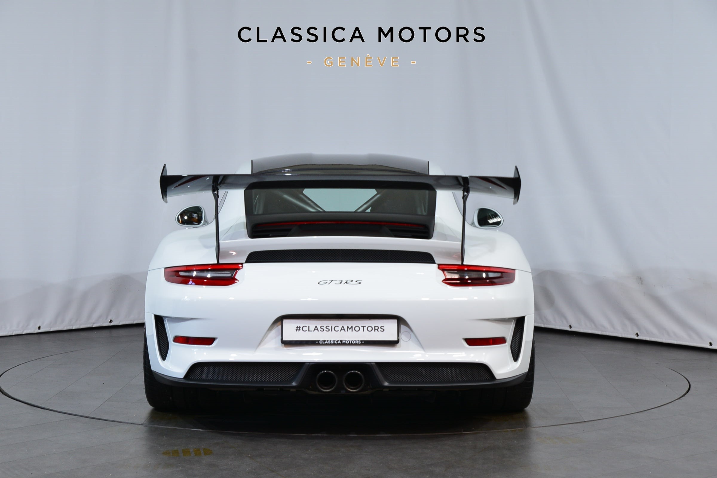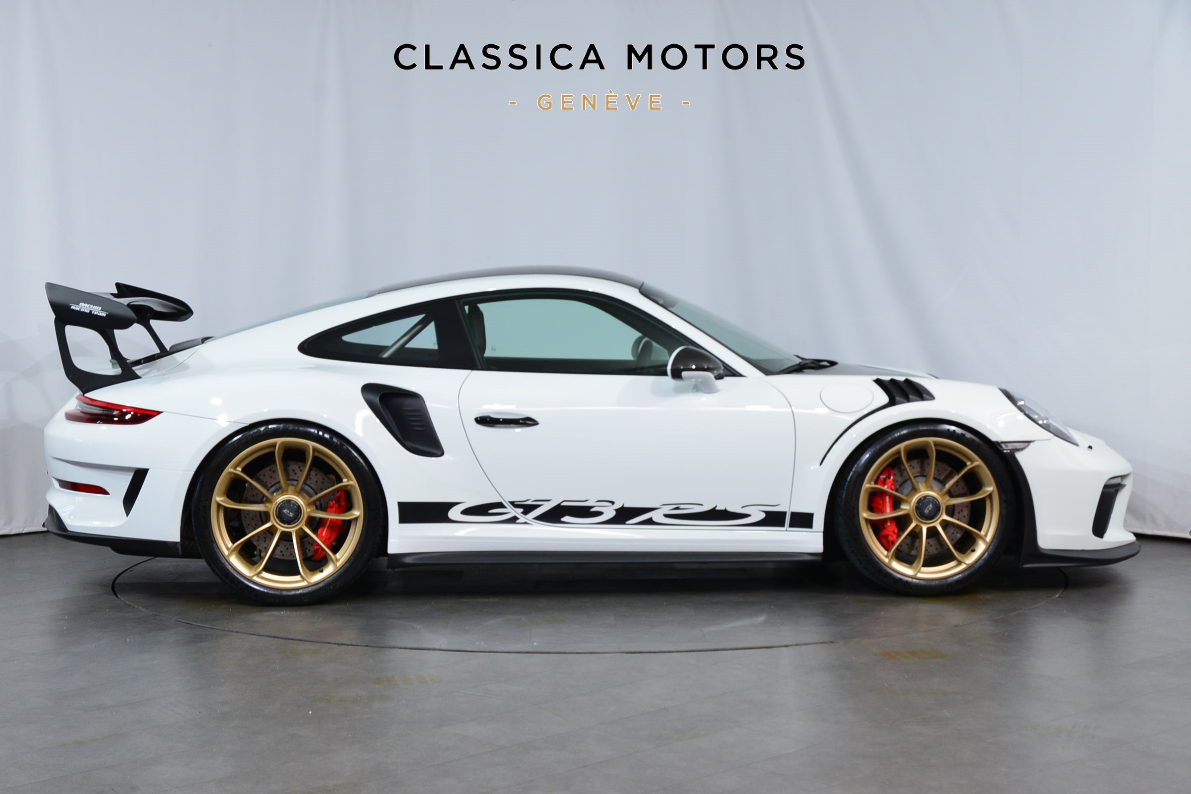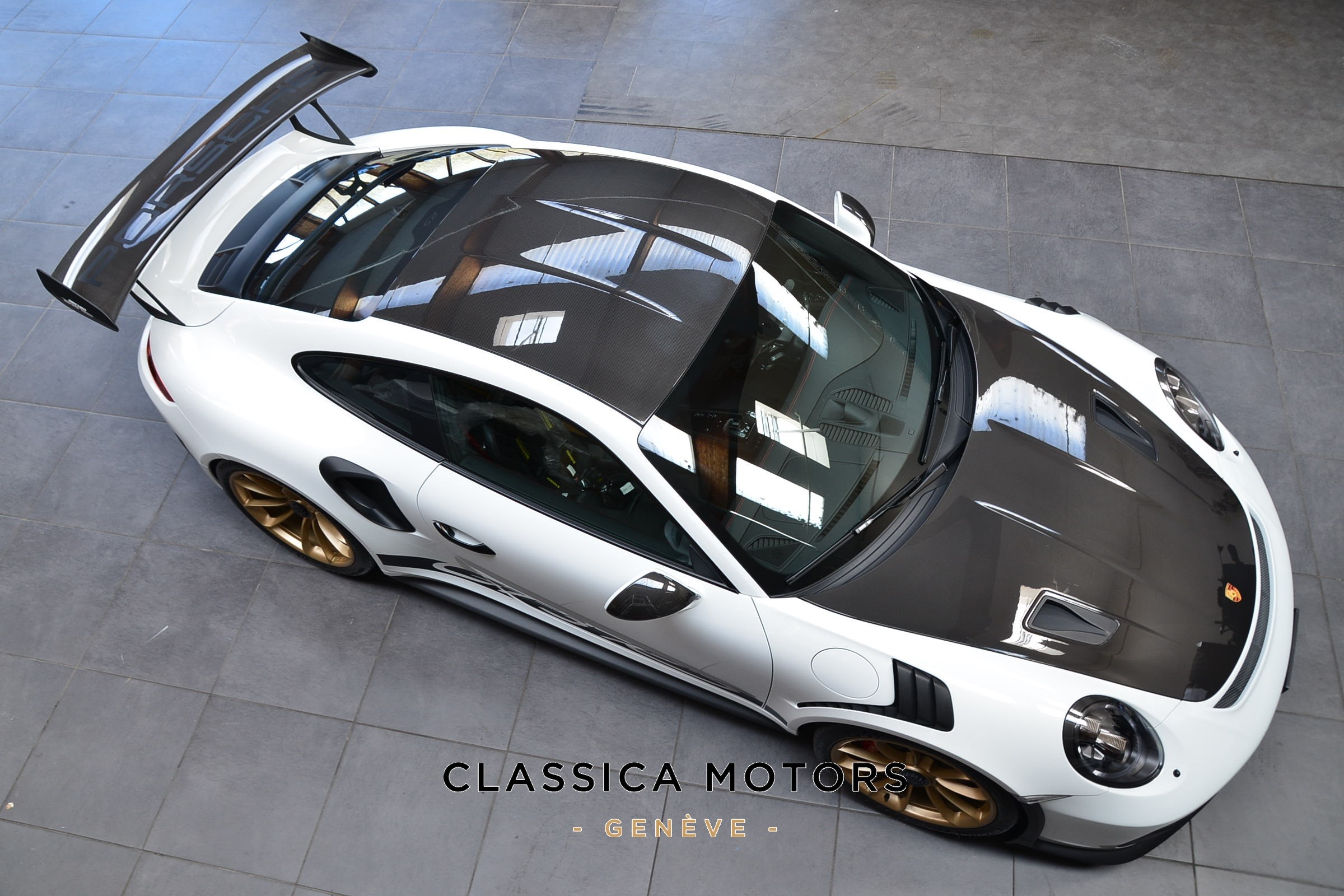 Porsche 911 GT3 RS (991.2) Pack Weissach, Véhicule suisse, présentée dans une teinte Blanc uni avec sièges baquets noirs.