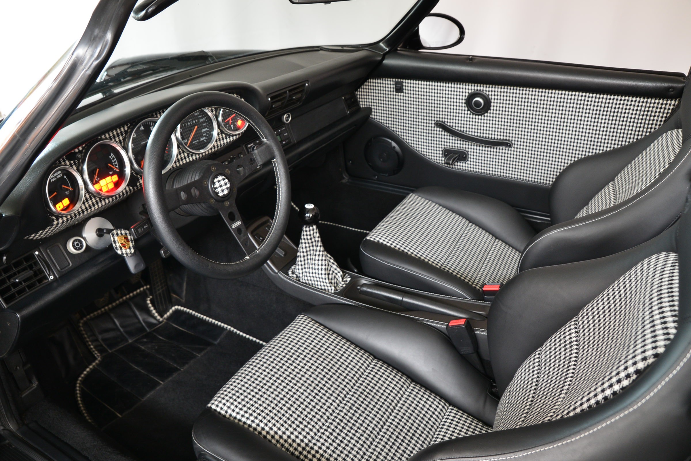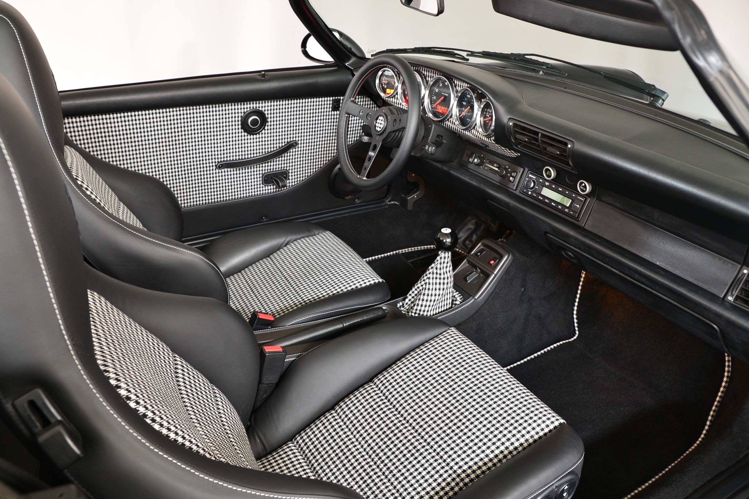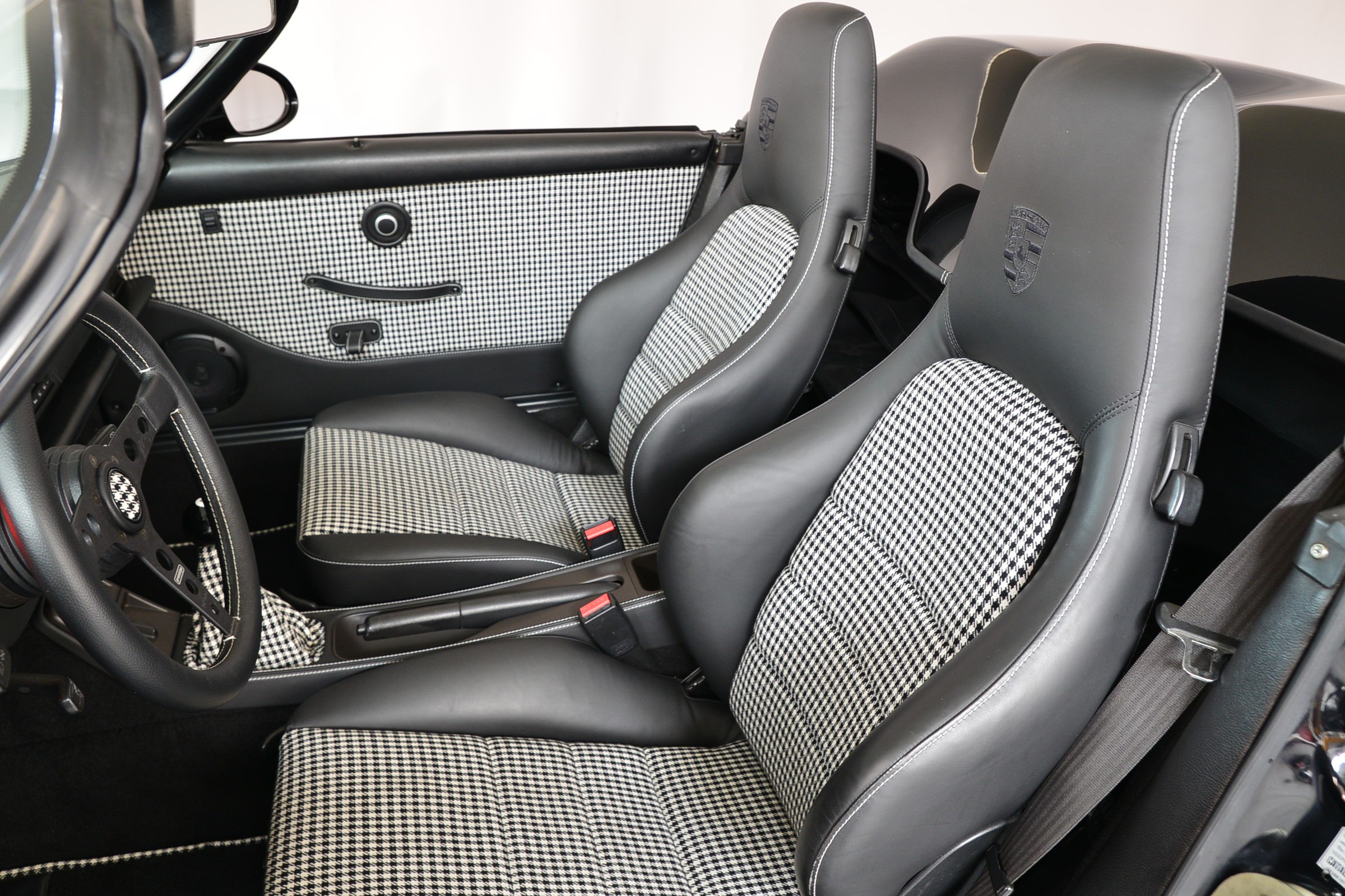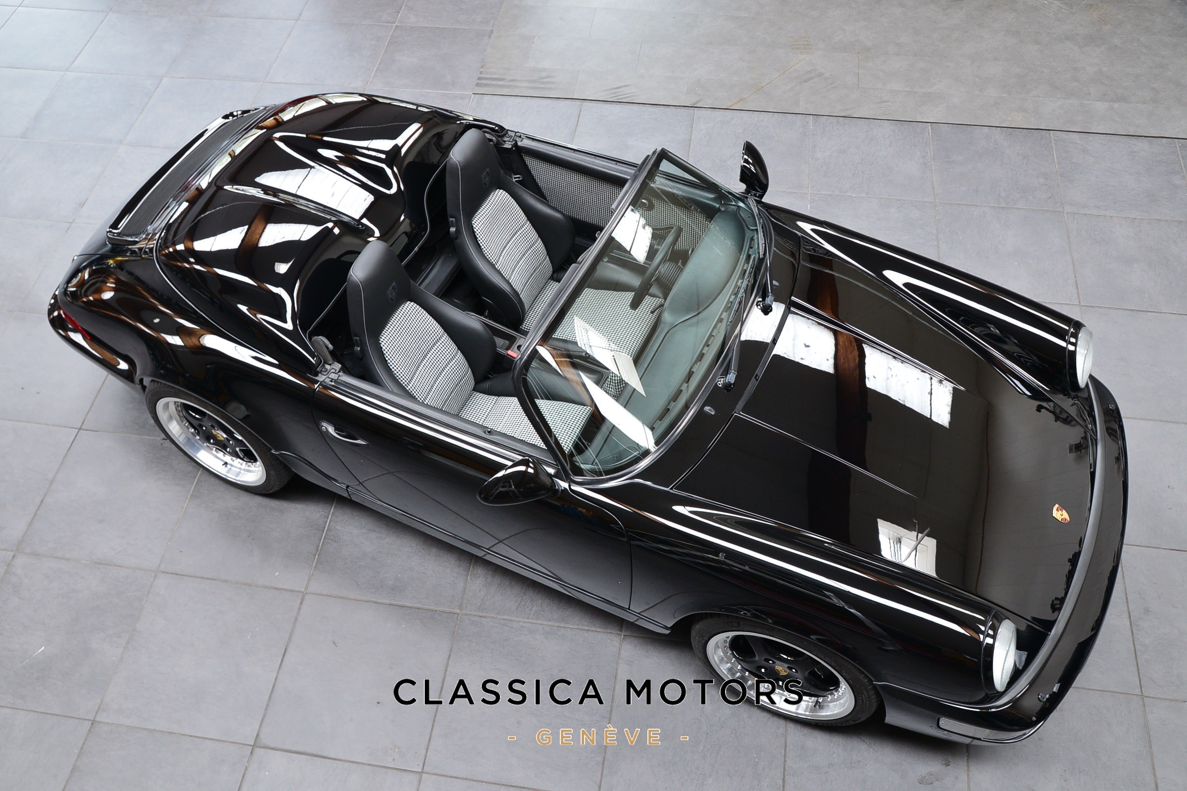 Porsche 911 Carrera 2 Speedster, Véhicule USA, présentée en Noir brillant avec intérieur cuir et tissu pied-de-poule noir et blanc.