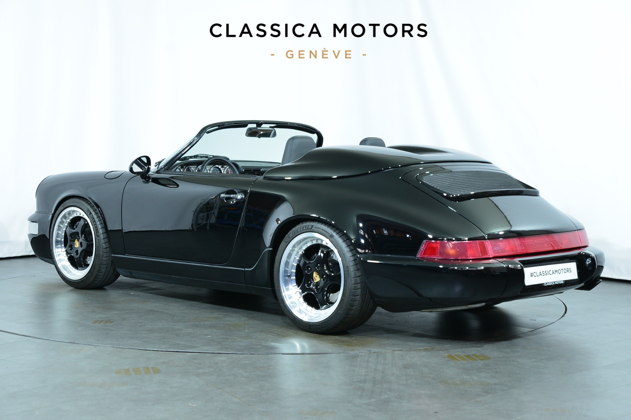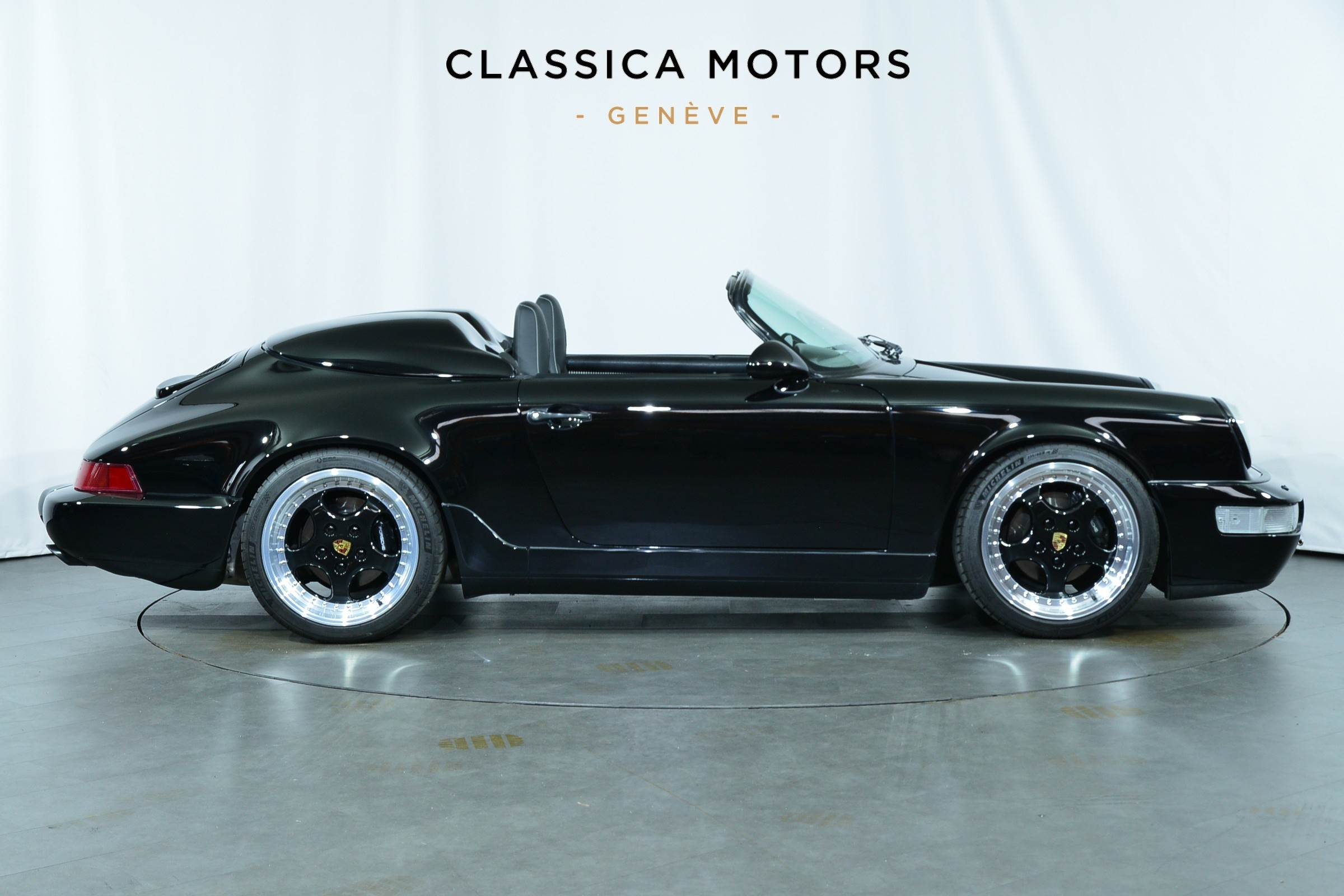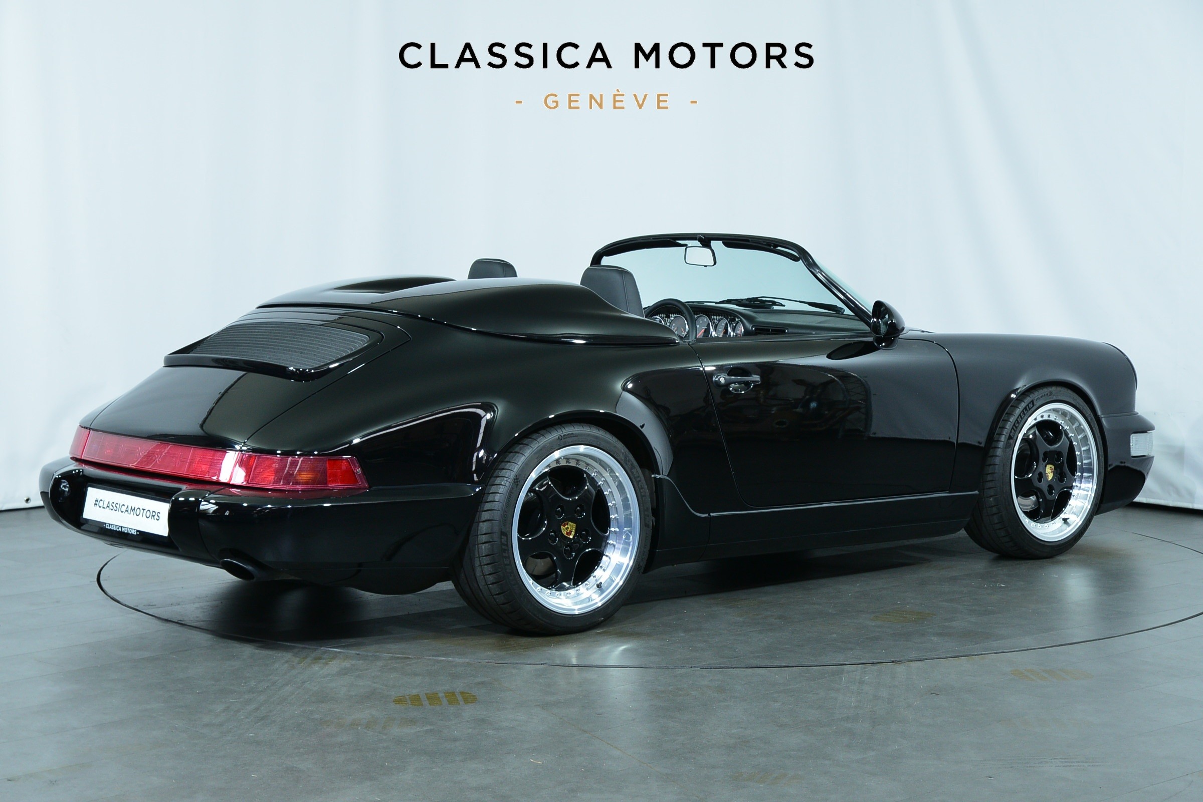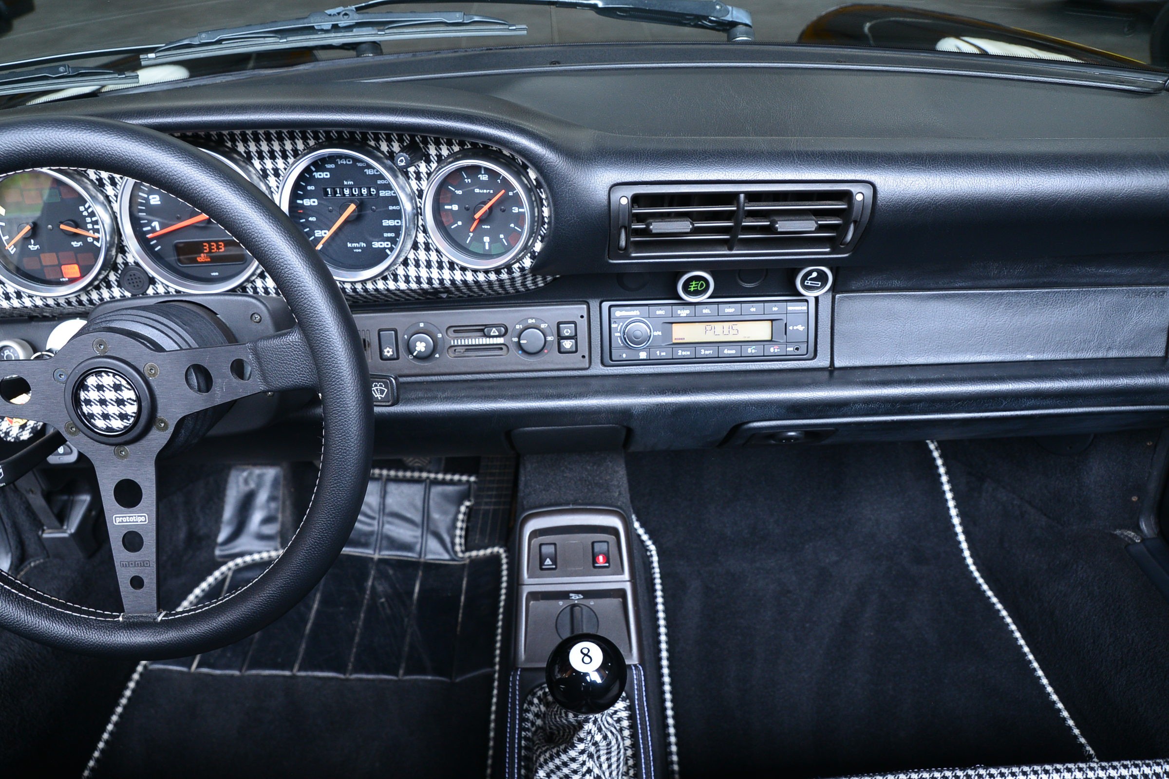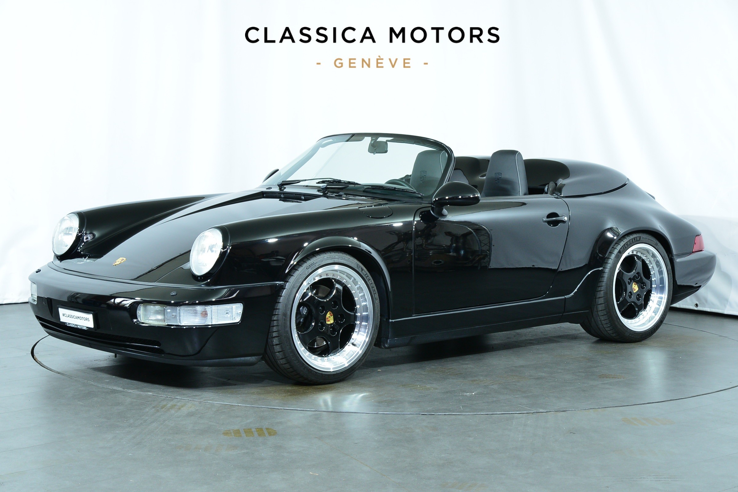 Porsche 911 Carrera 2 Speedster, Véhicule USA, présentée en Noir brillant avec intérieur cuir et tissu pied-de-poule noir et blanc.