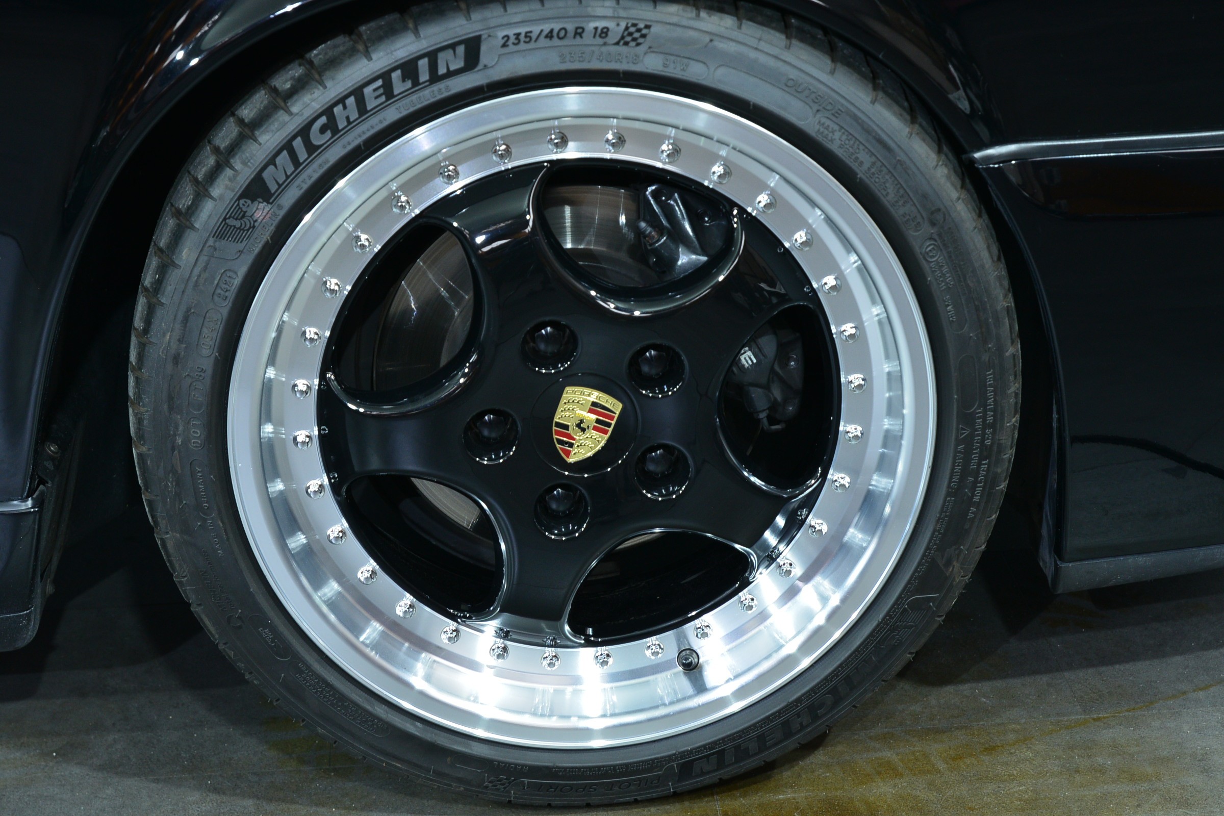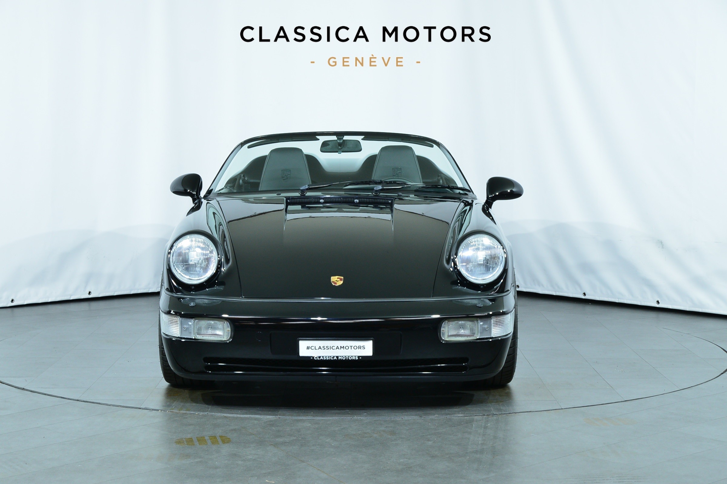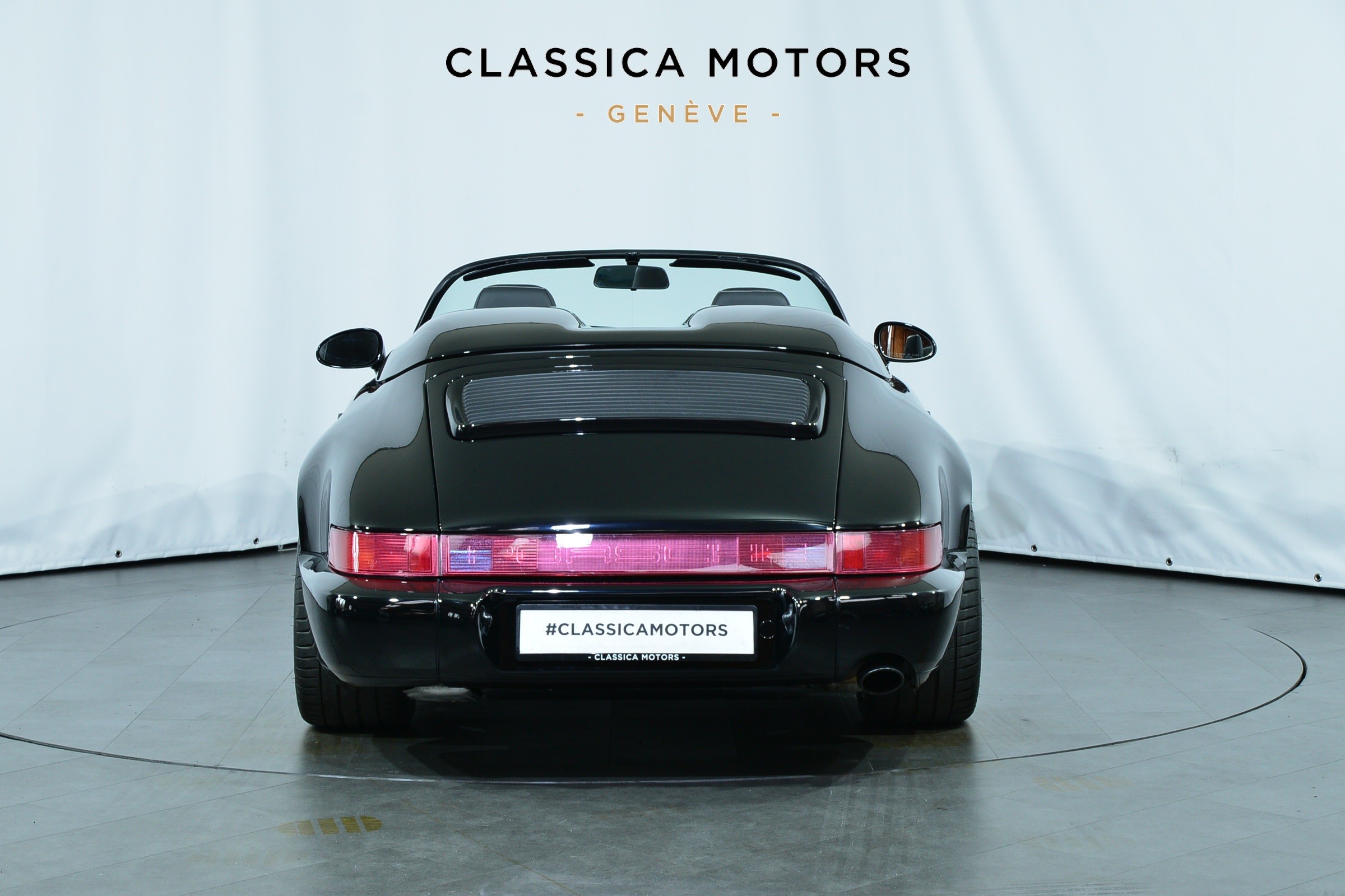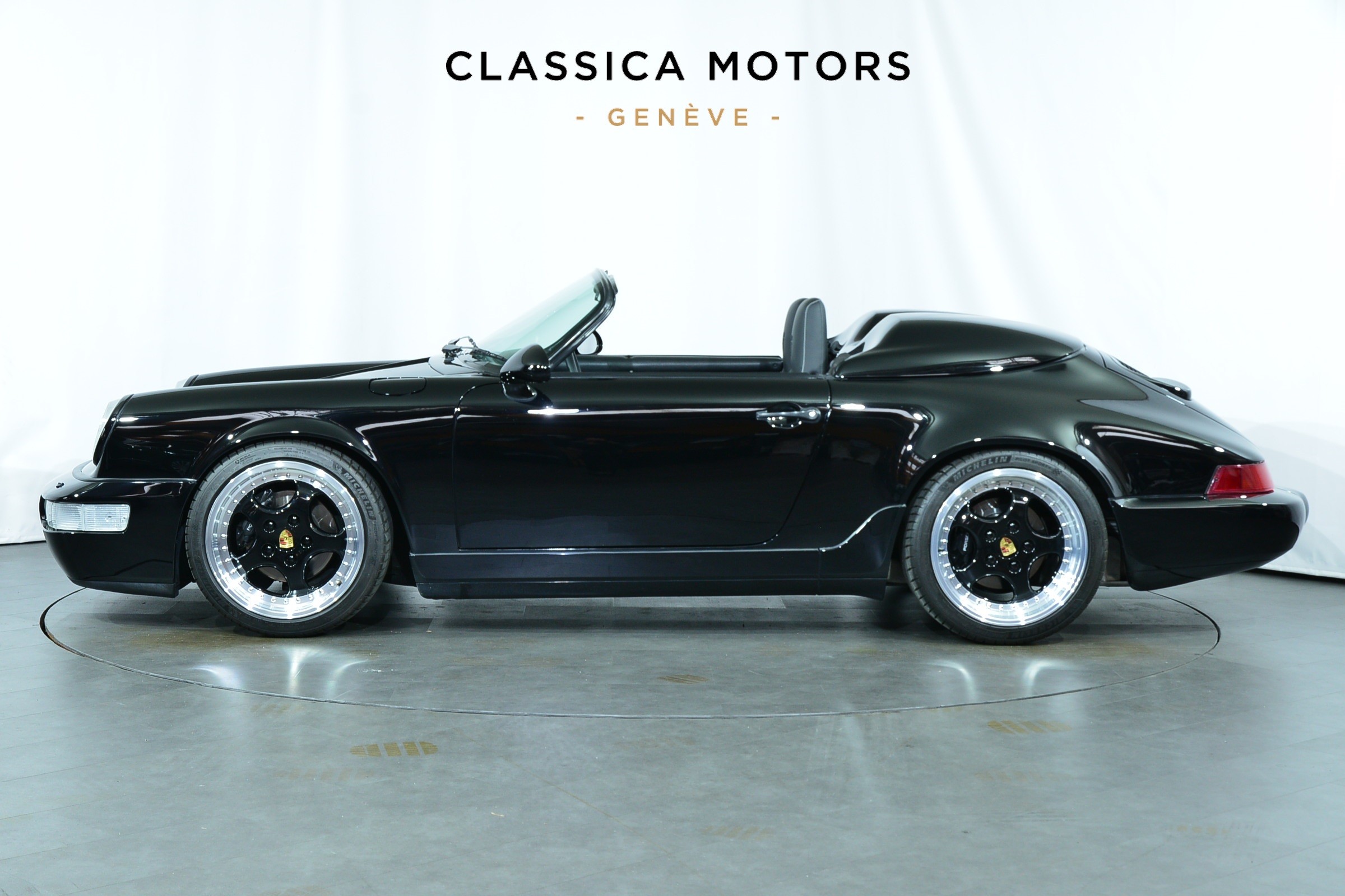 Porsche 911 Carrera 2 Speedster, Véhicule USA, présentée en Noir brillant avec intérieur cuir et tissu pied-de-poule noir et blanc.