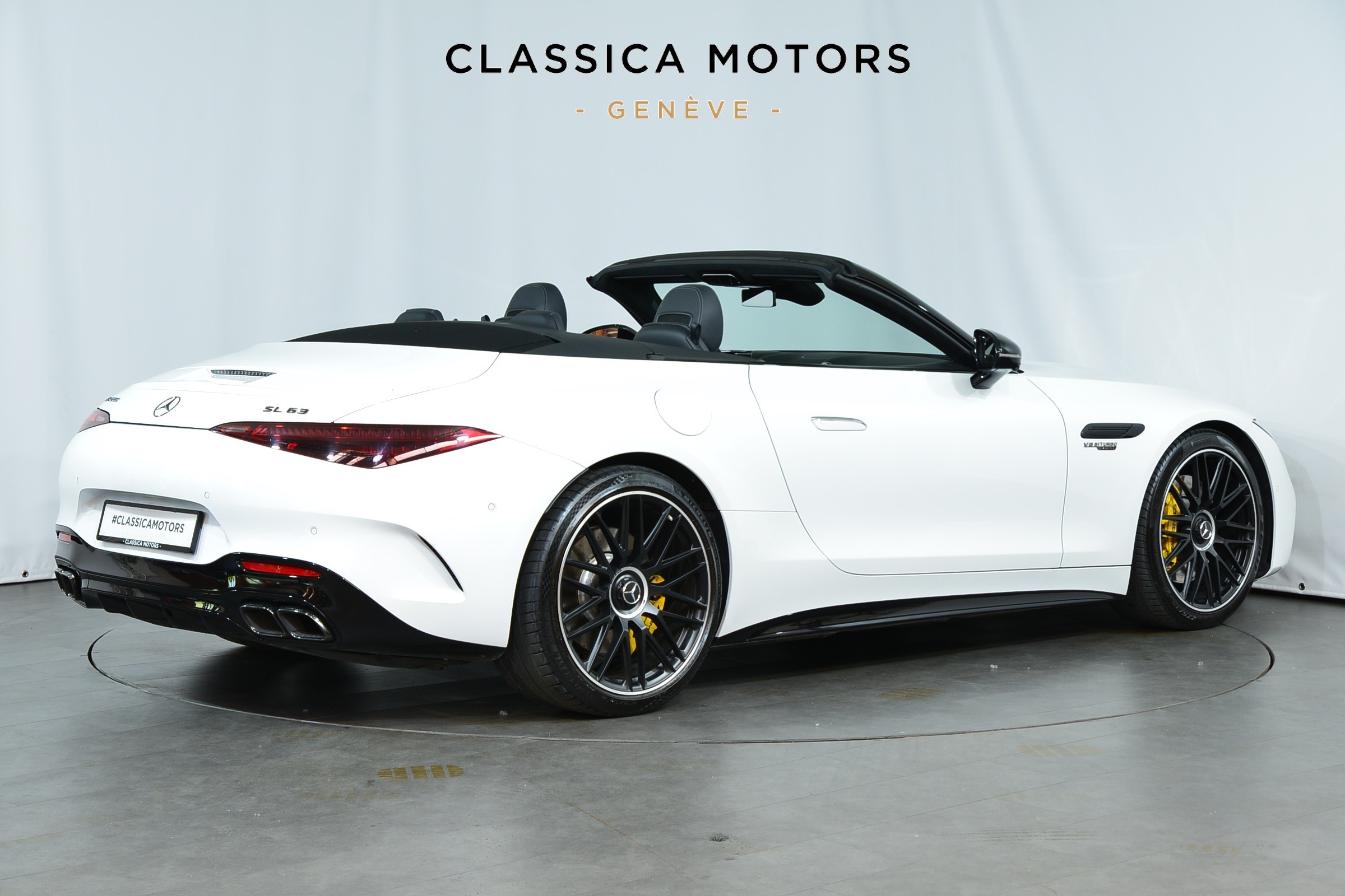 Mercedes-Benz AMG SL 63 4MATIC, présentée en Blanc métallisé avec intérieur cuir noir.