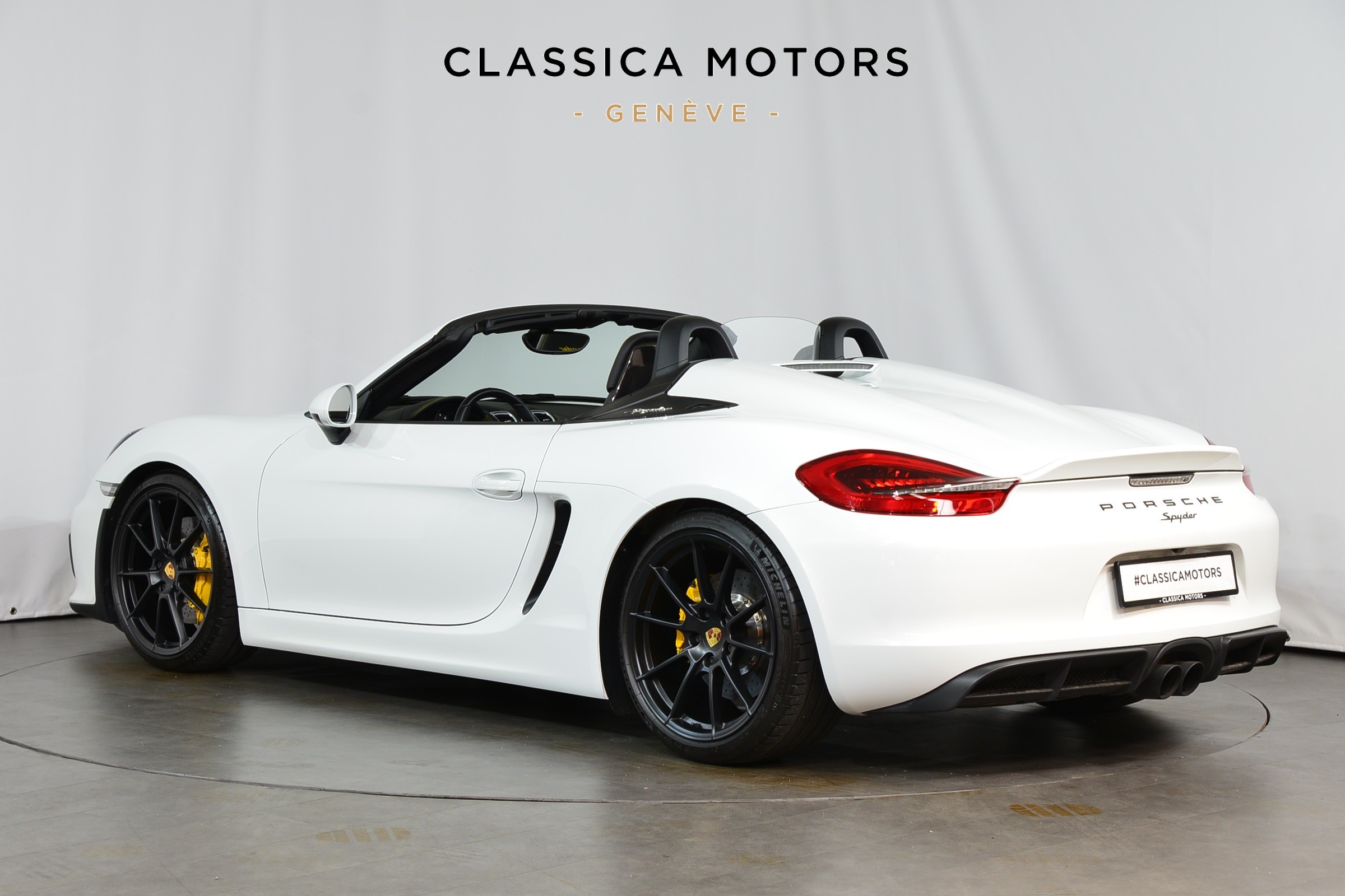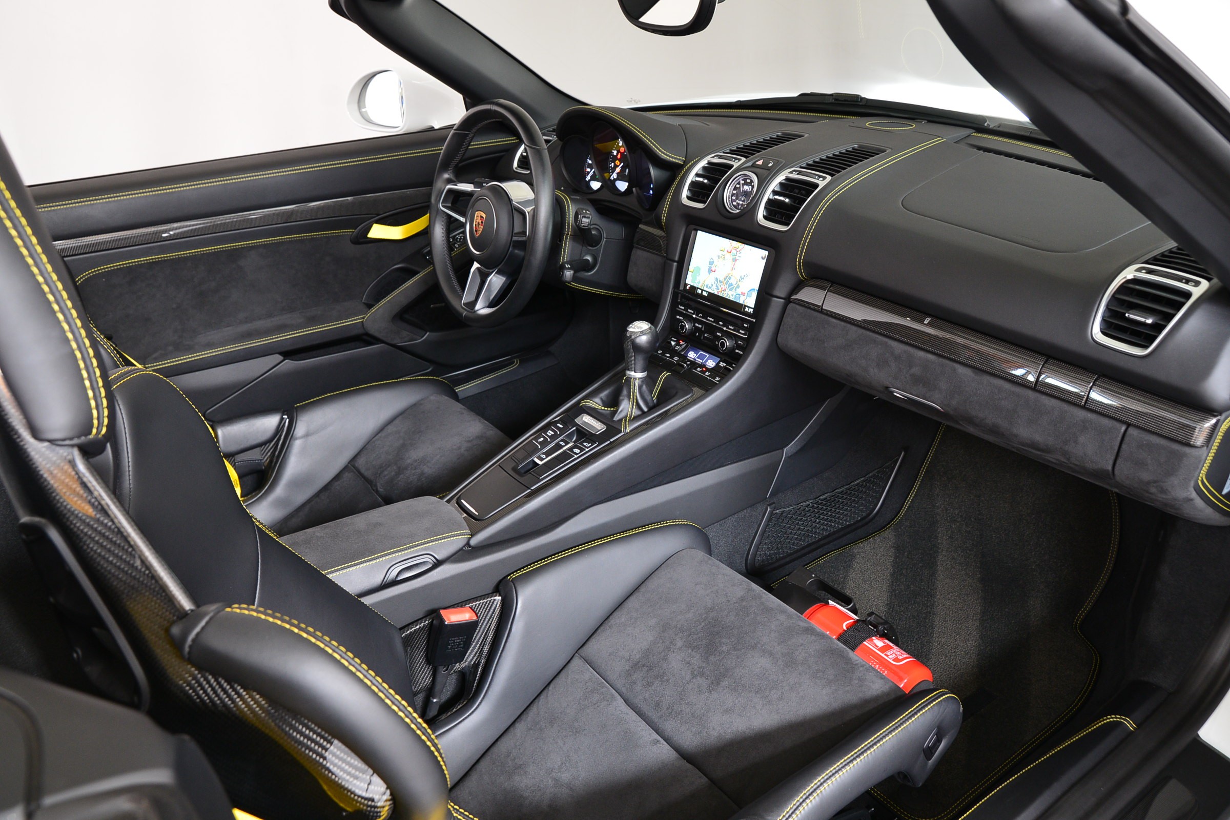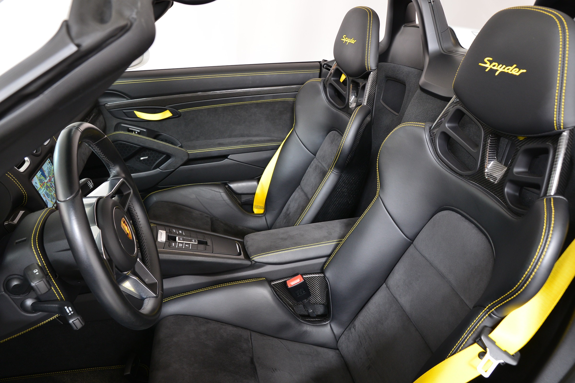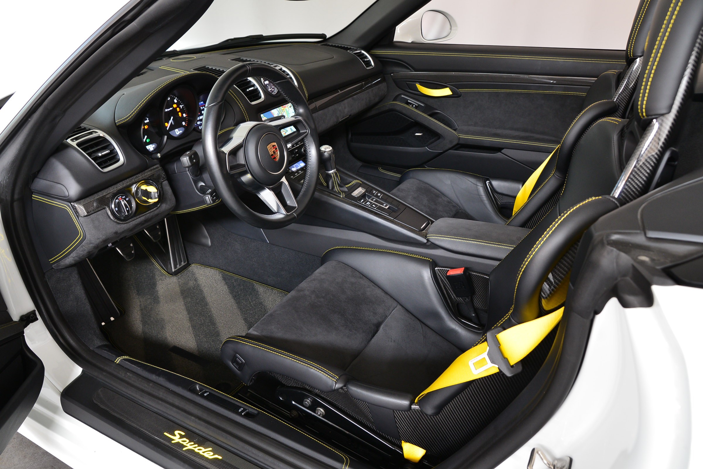 Porsche Boxster Spyder 3.8 - Boîte manuelle 6 vitesses, Véhicule suisse, présenté en Blanc avec intérieur cuir et Alcantara noir, surpiqûres et ceintures de couleur jaune.