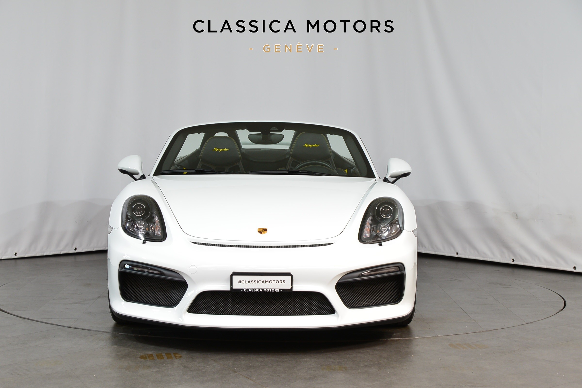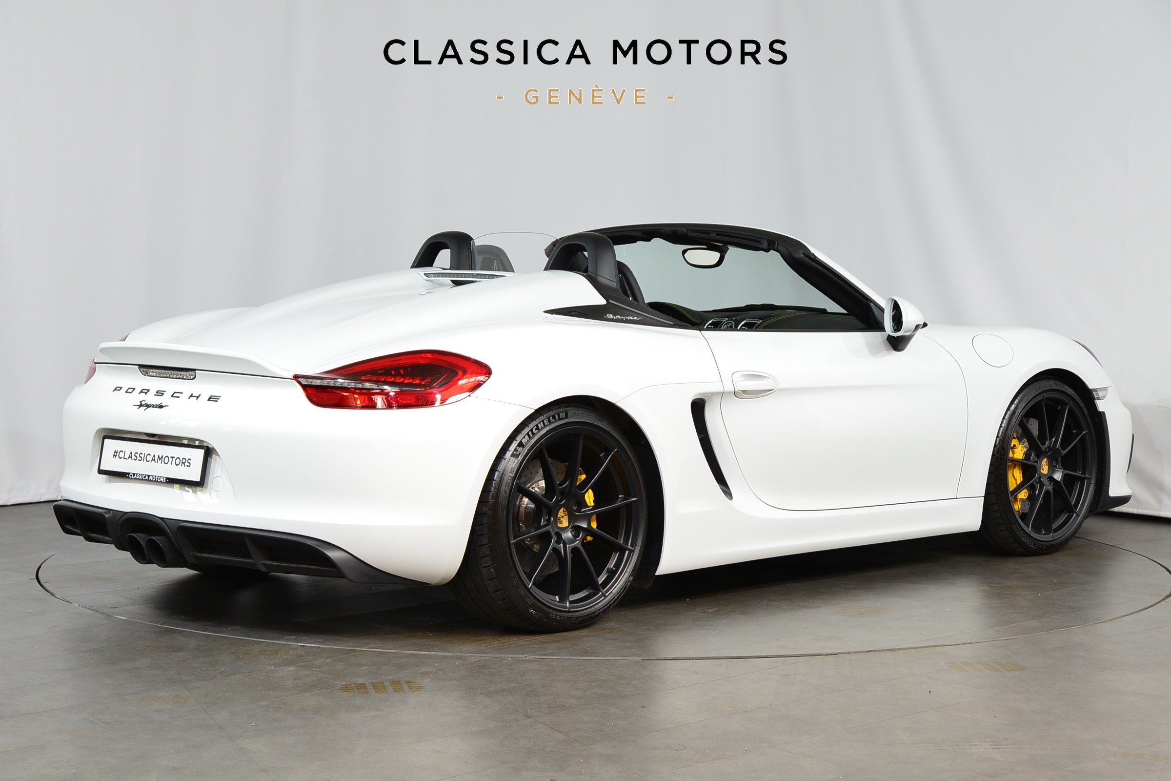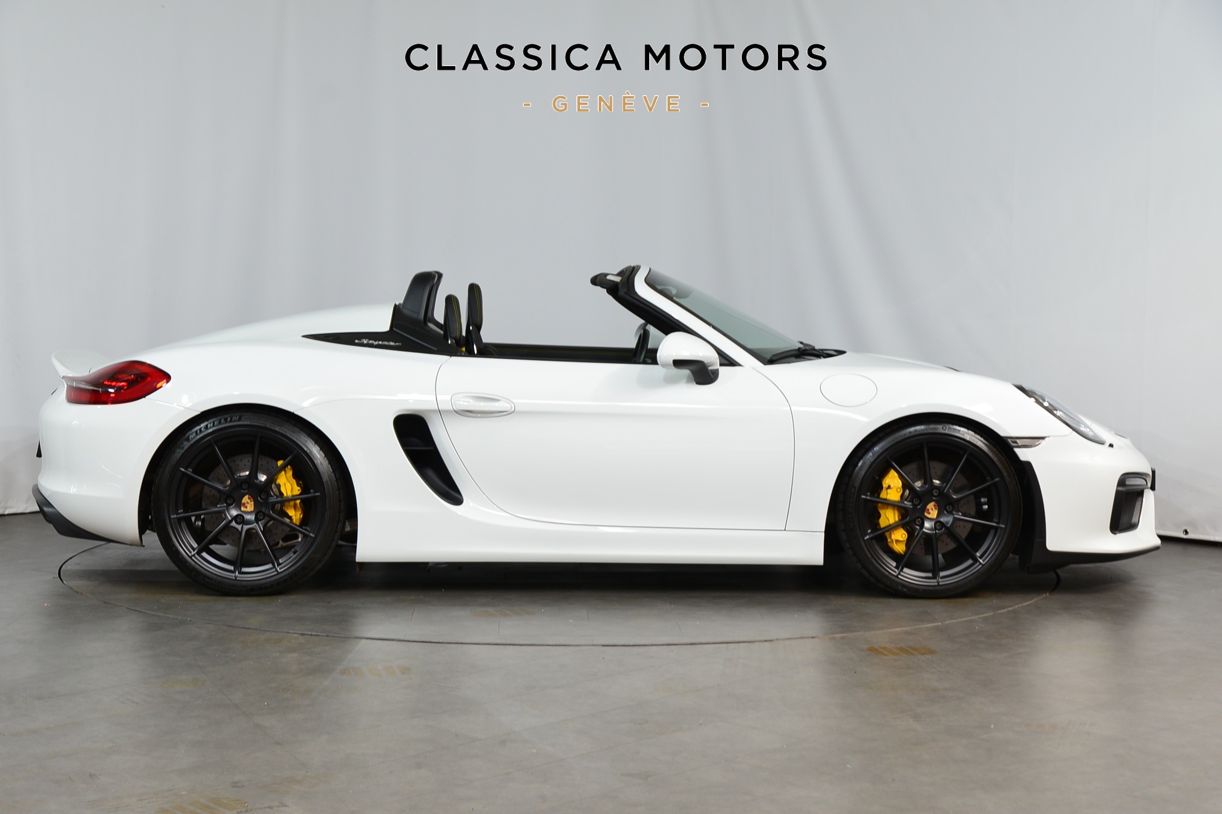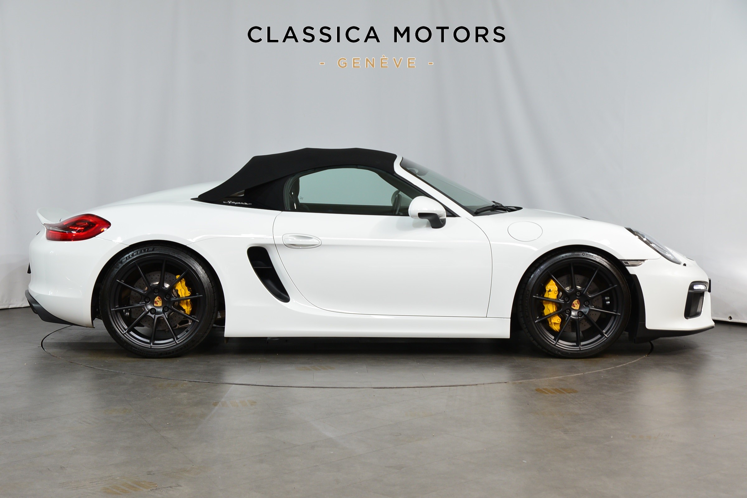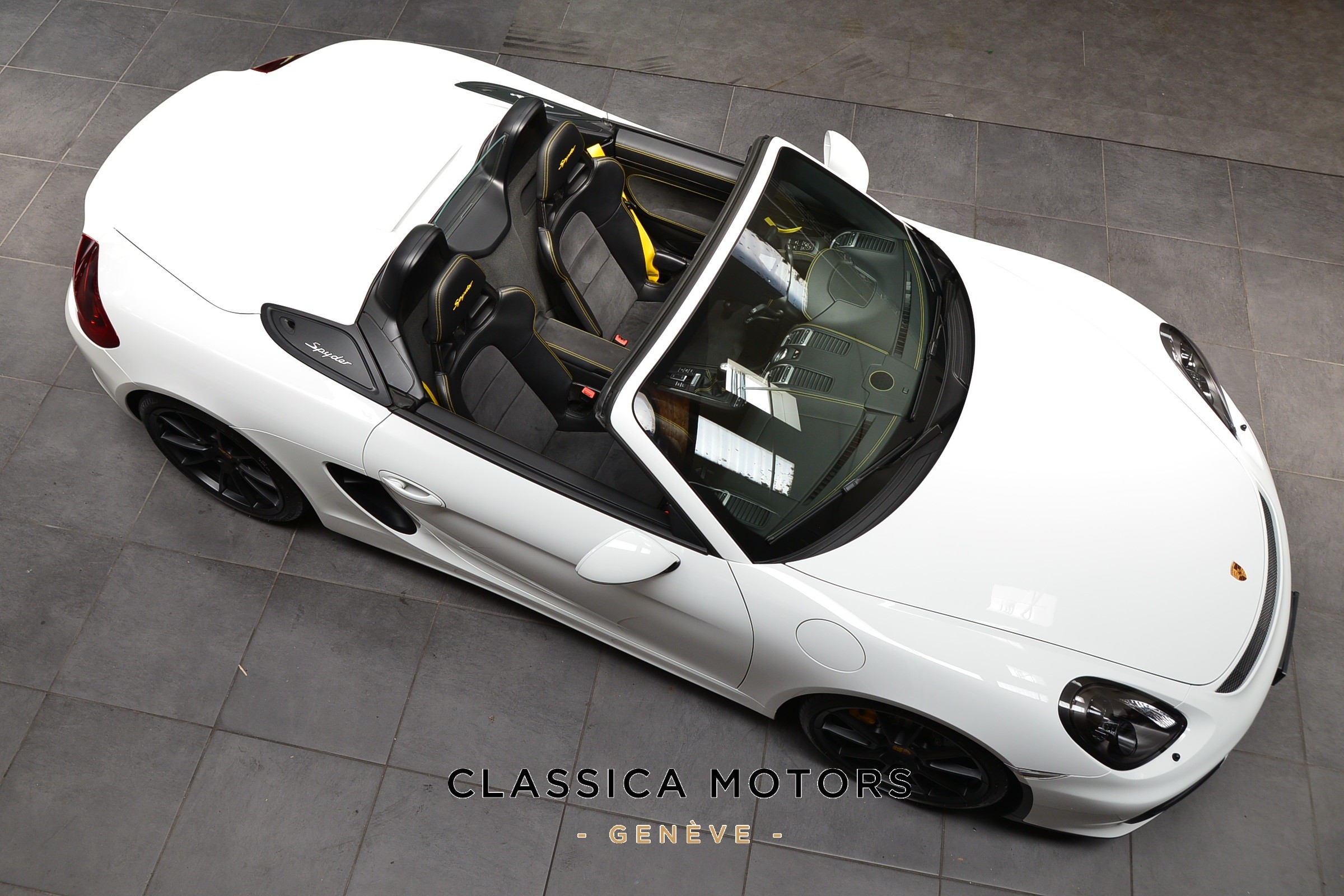 Porsche Boxster Spyder 3.8 - Boîte manuelle 6 vitesses, Véhicule suisse, présenté en Blanc avec intérieur cuir et Alcantara noir, surpiqûres et ceintures de couleur jaune.