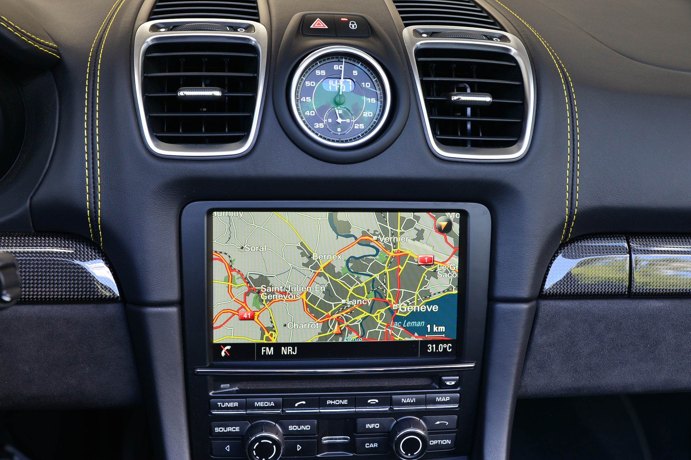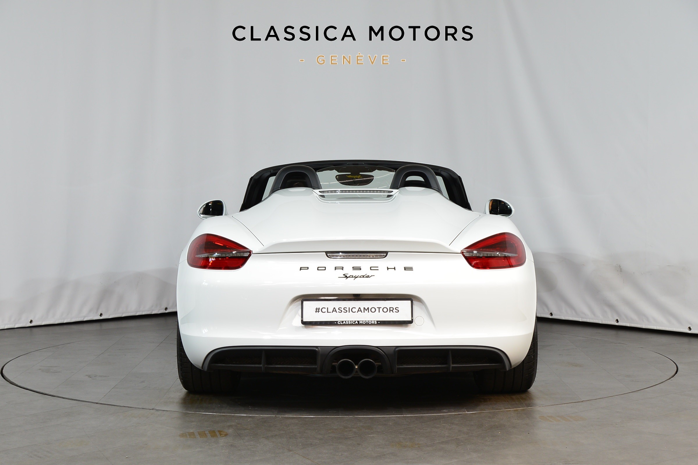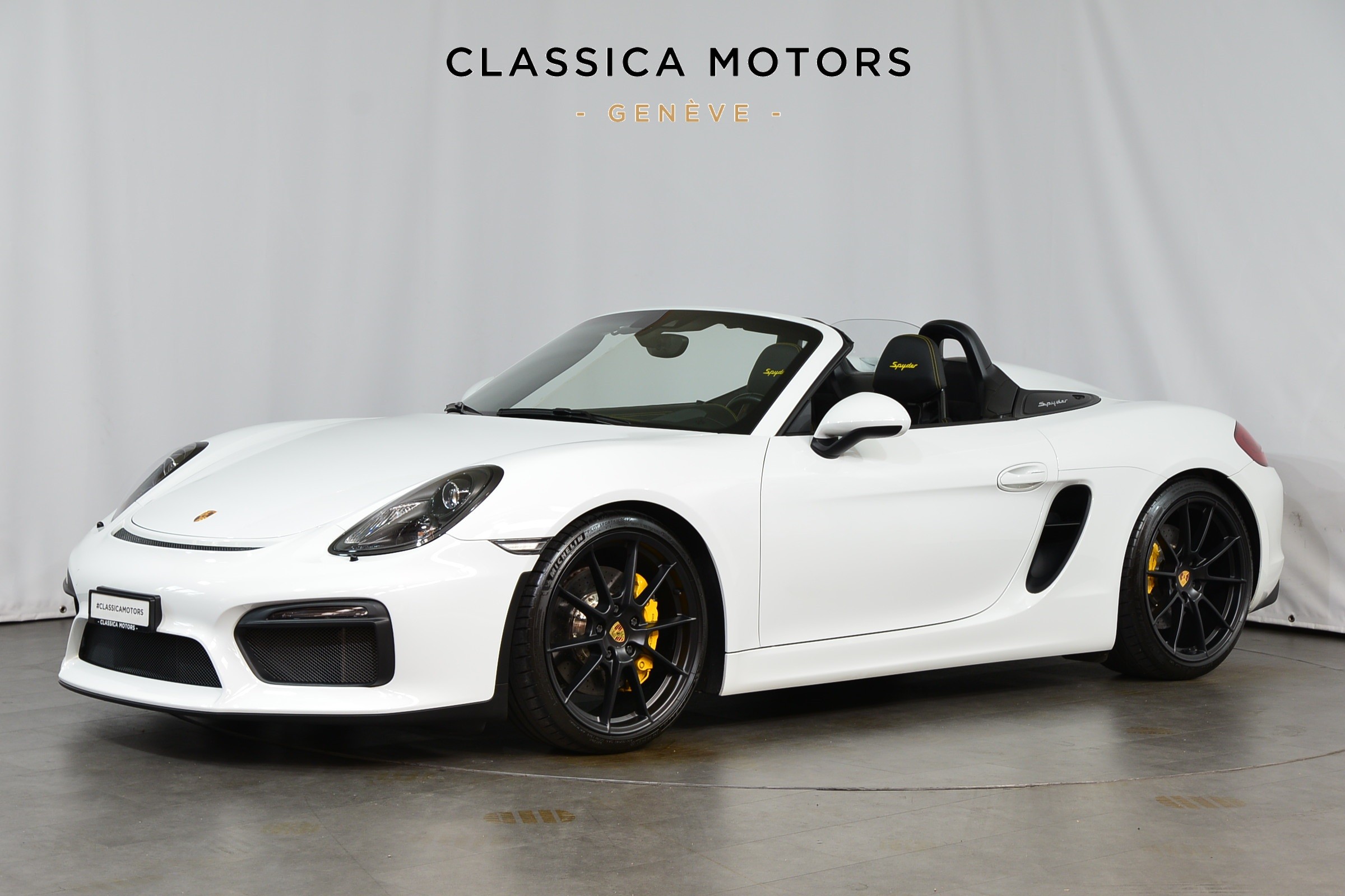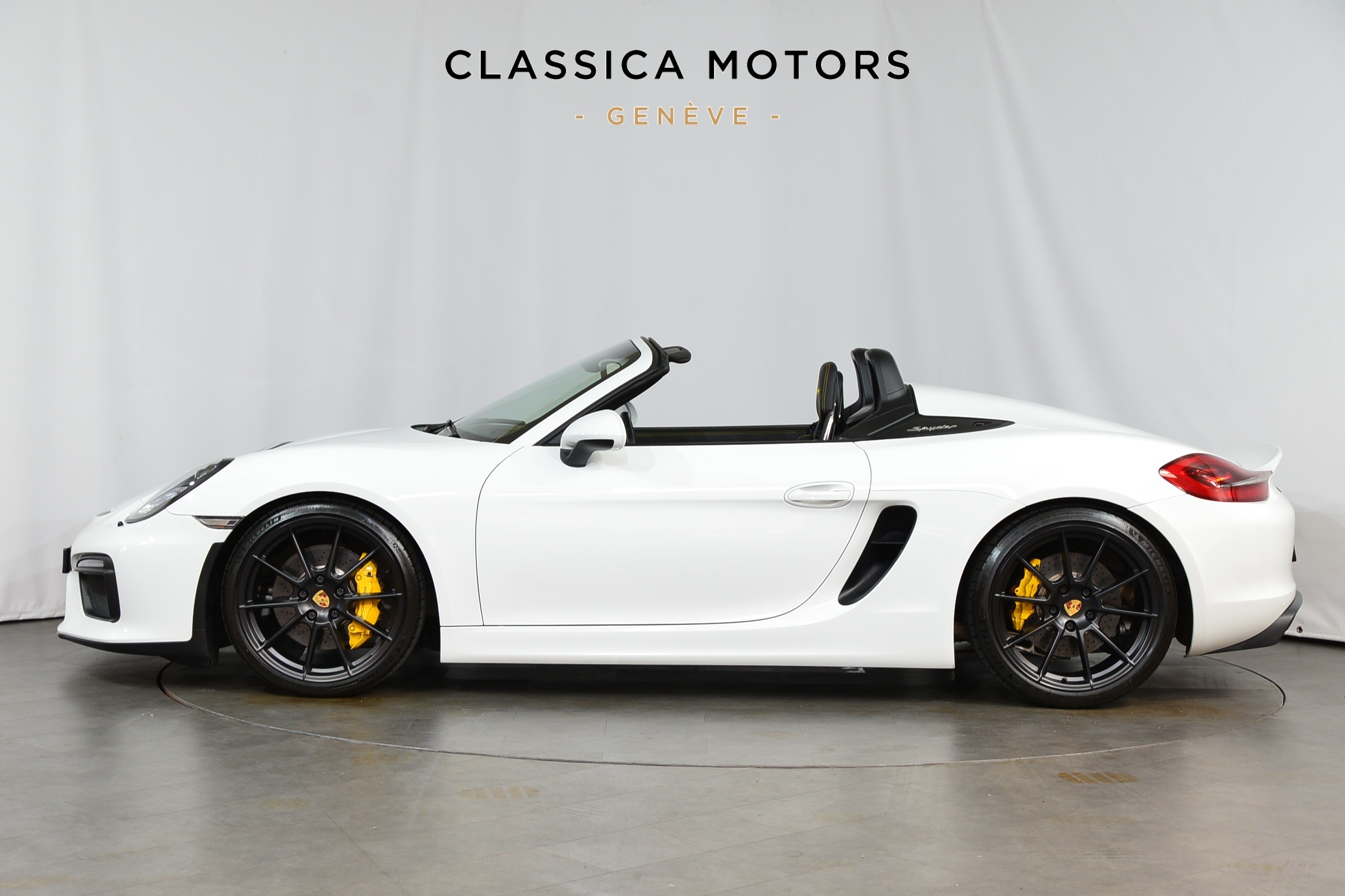Porsche Boxster Spyder 3.8 - Boîte manuelle 6 vitesses, Véhicule suisse, présenté en Blanc avec intérieur cuir et Alcantara noir, surpiqûres et ceintures de couleur jaune.