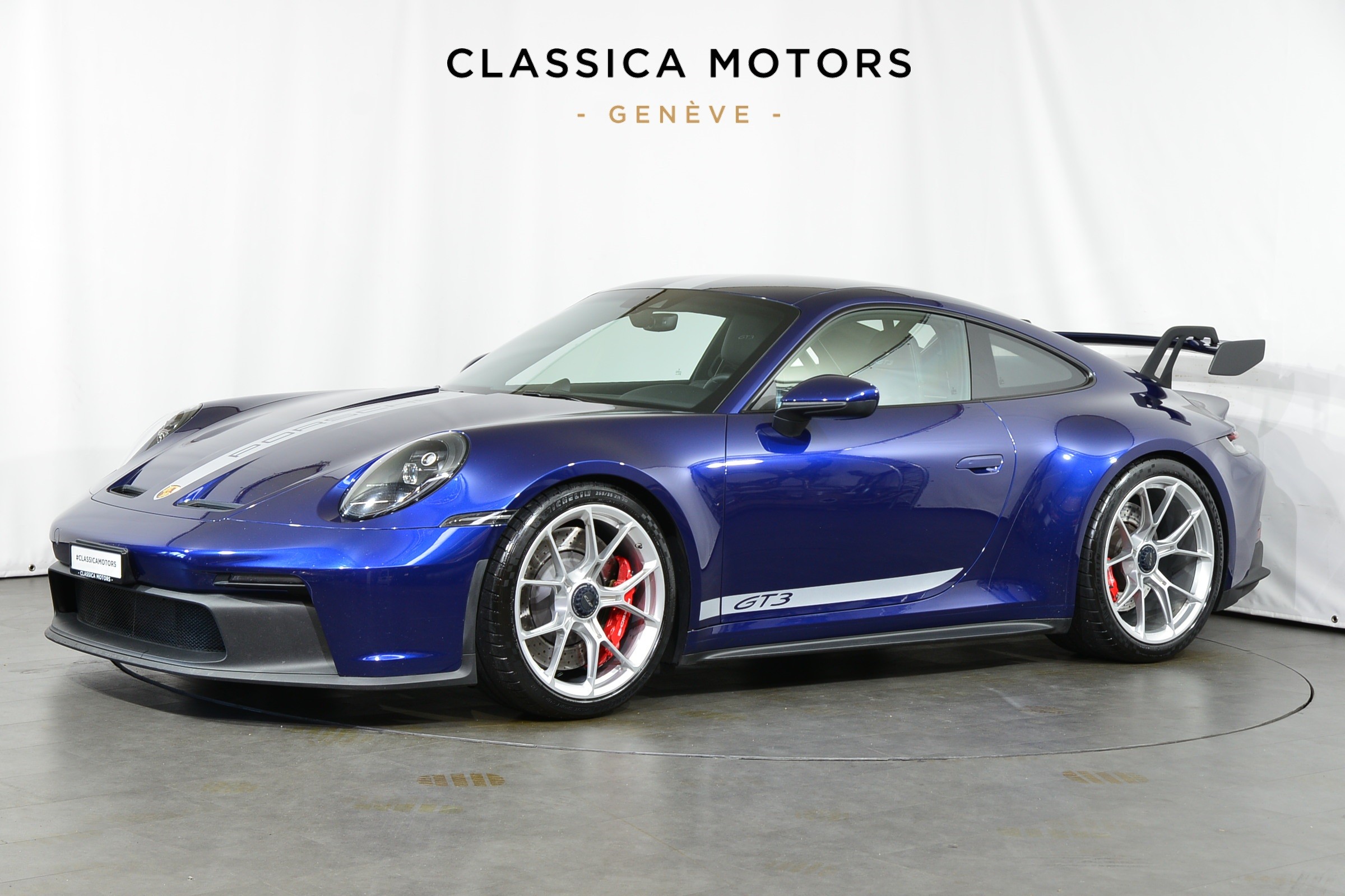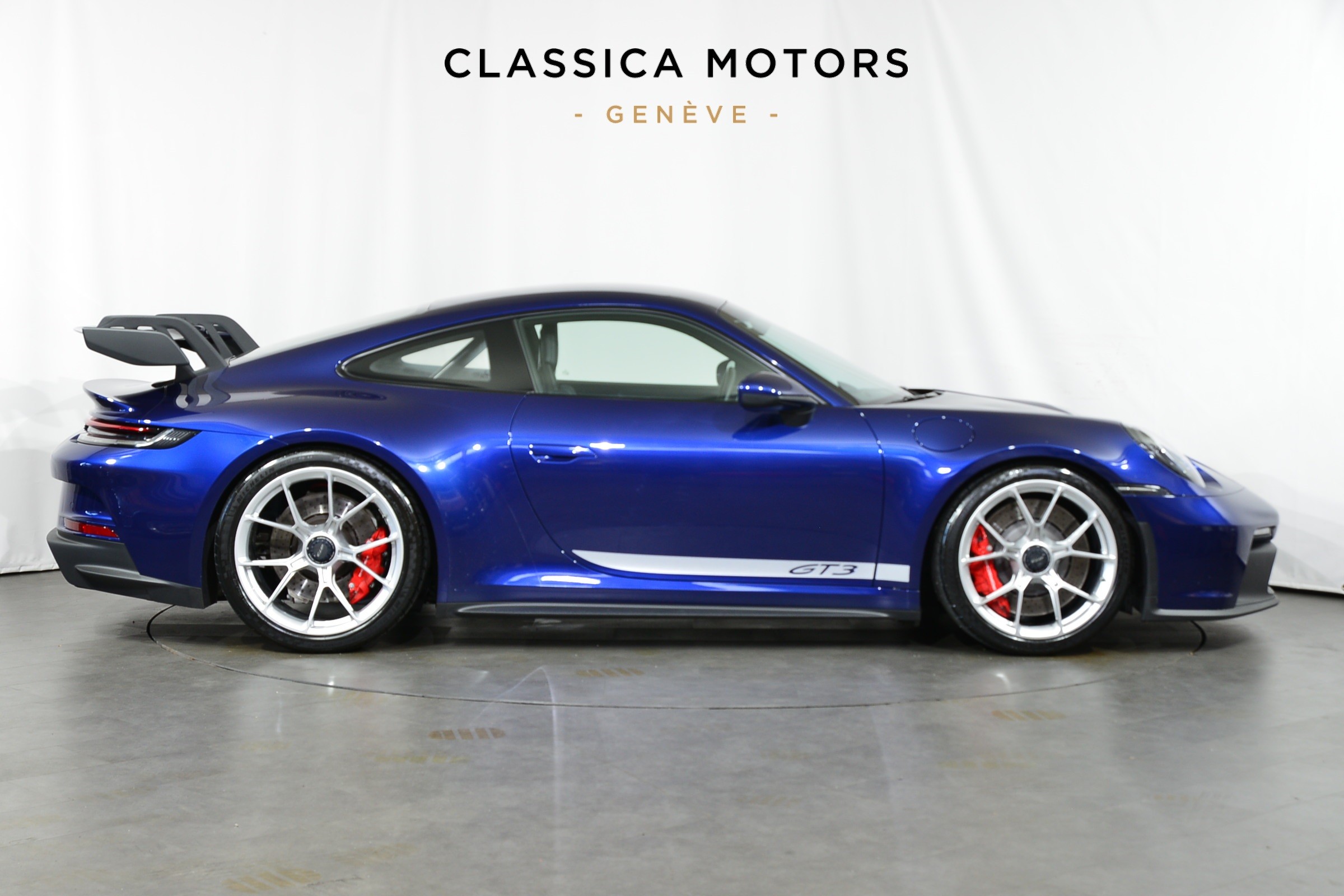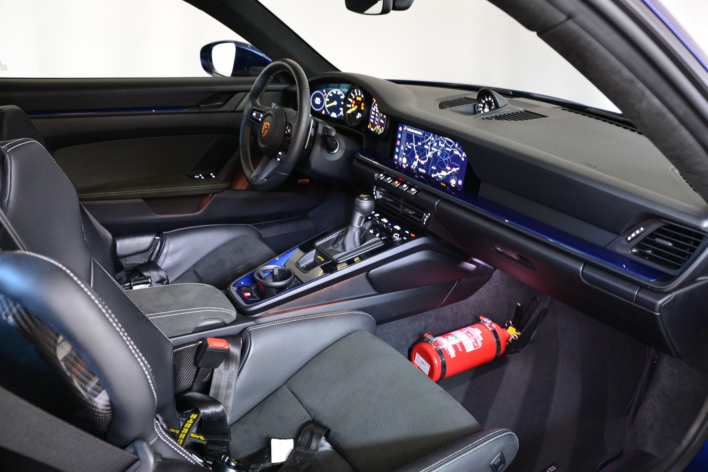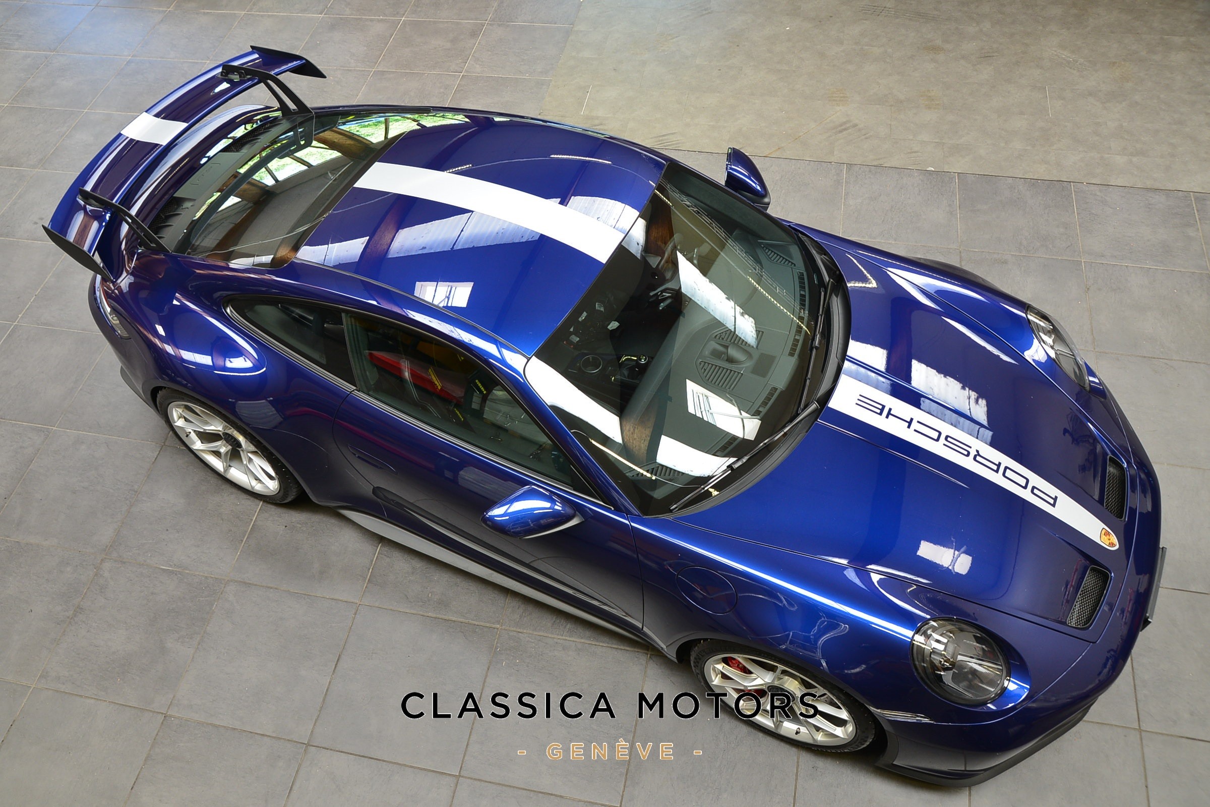 Porsche 911 GT3 PDK, Véhicule suisse, présentée dans une superbe teinte Bleu Gentiane métallisé avec intérieur cuir et Alcantara noir.