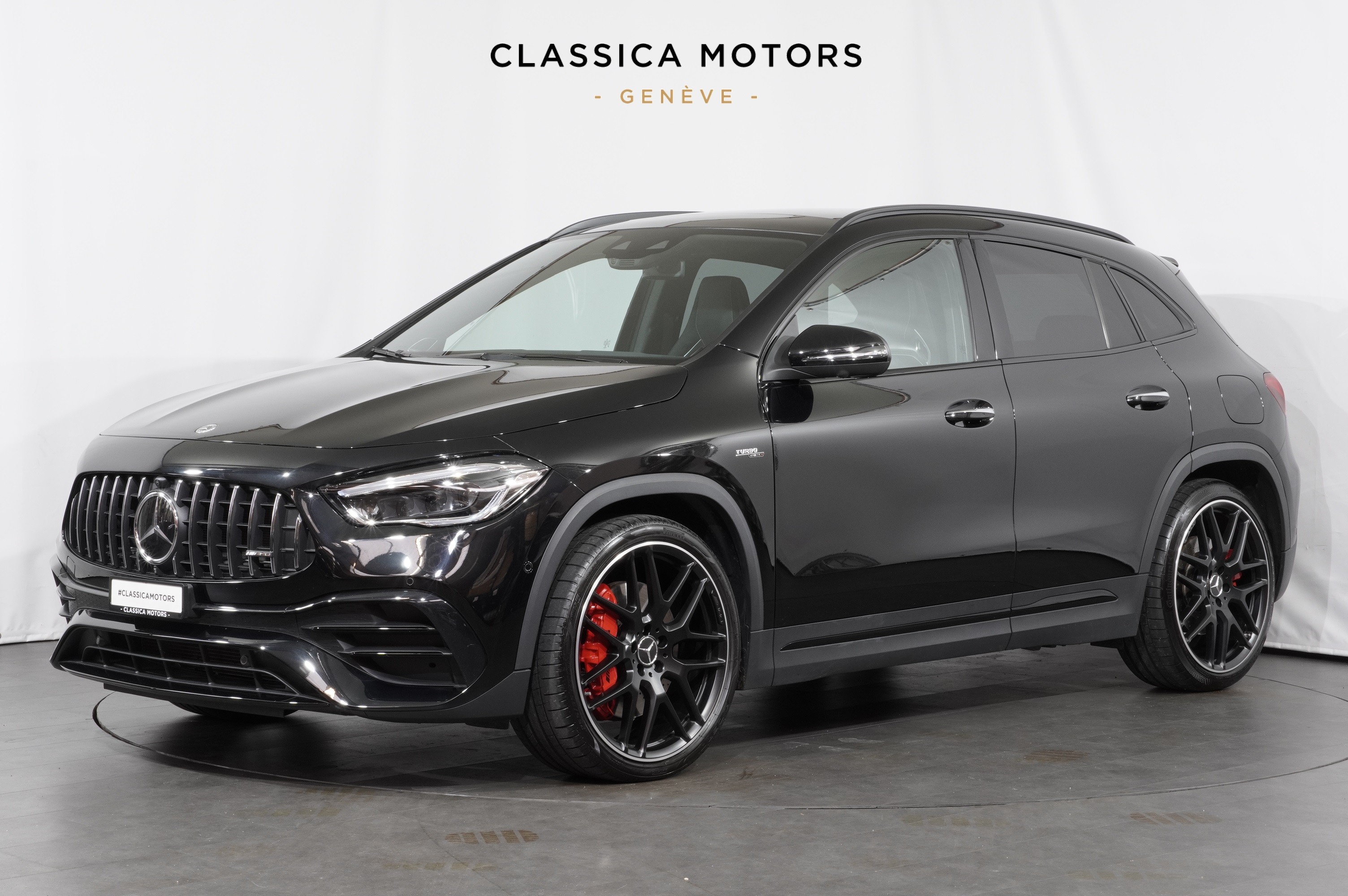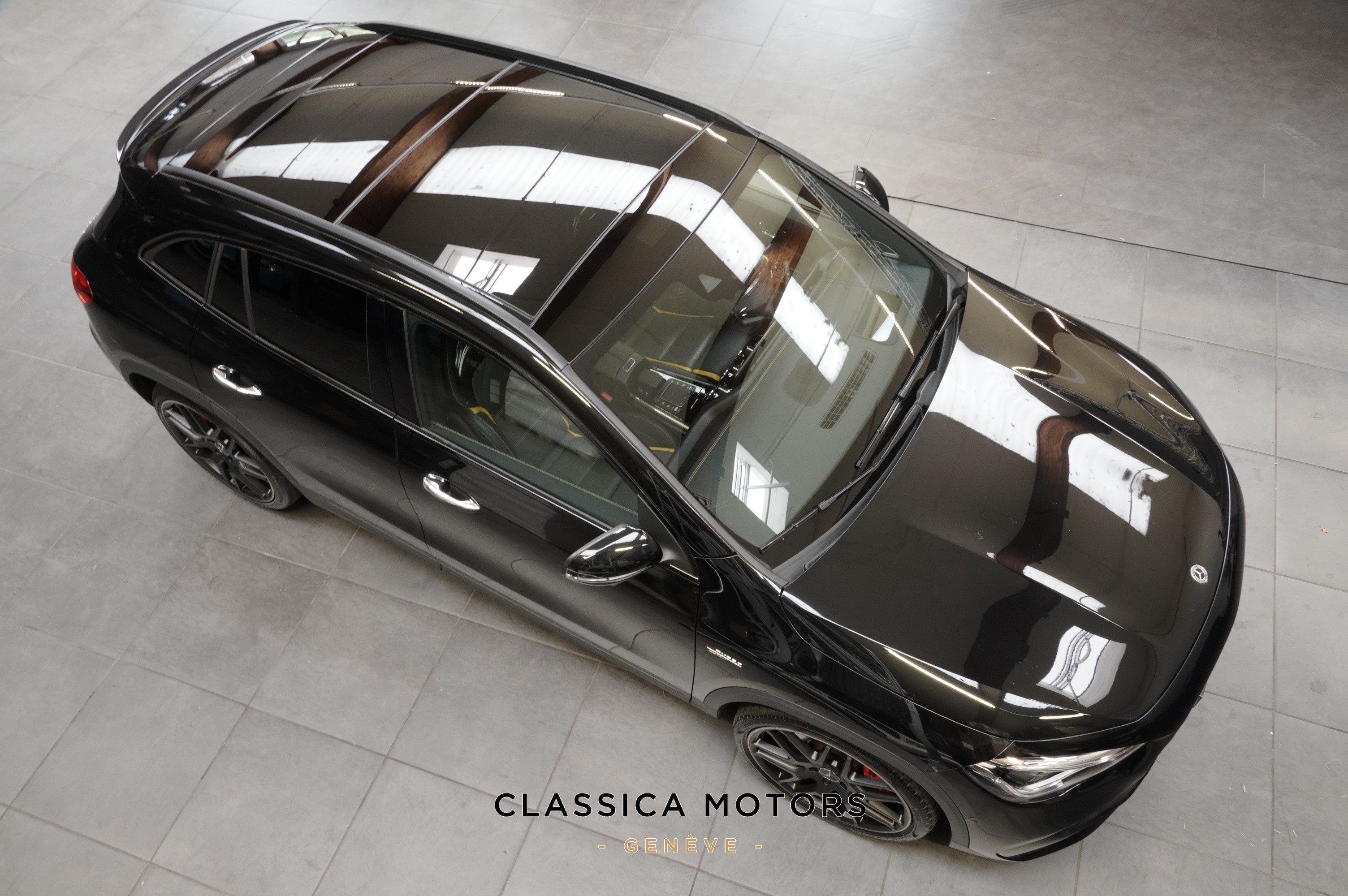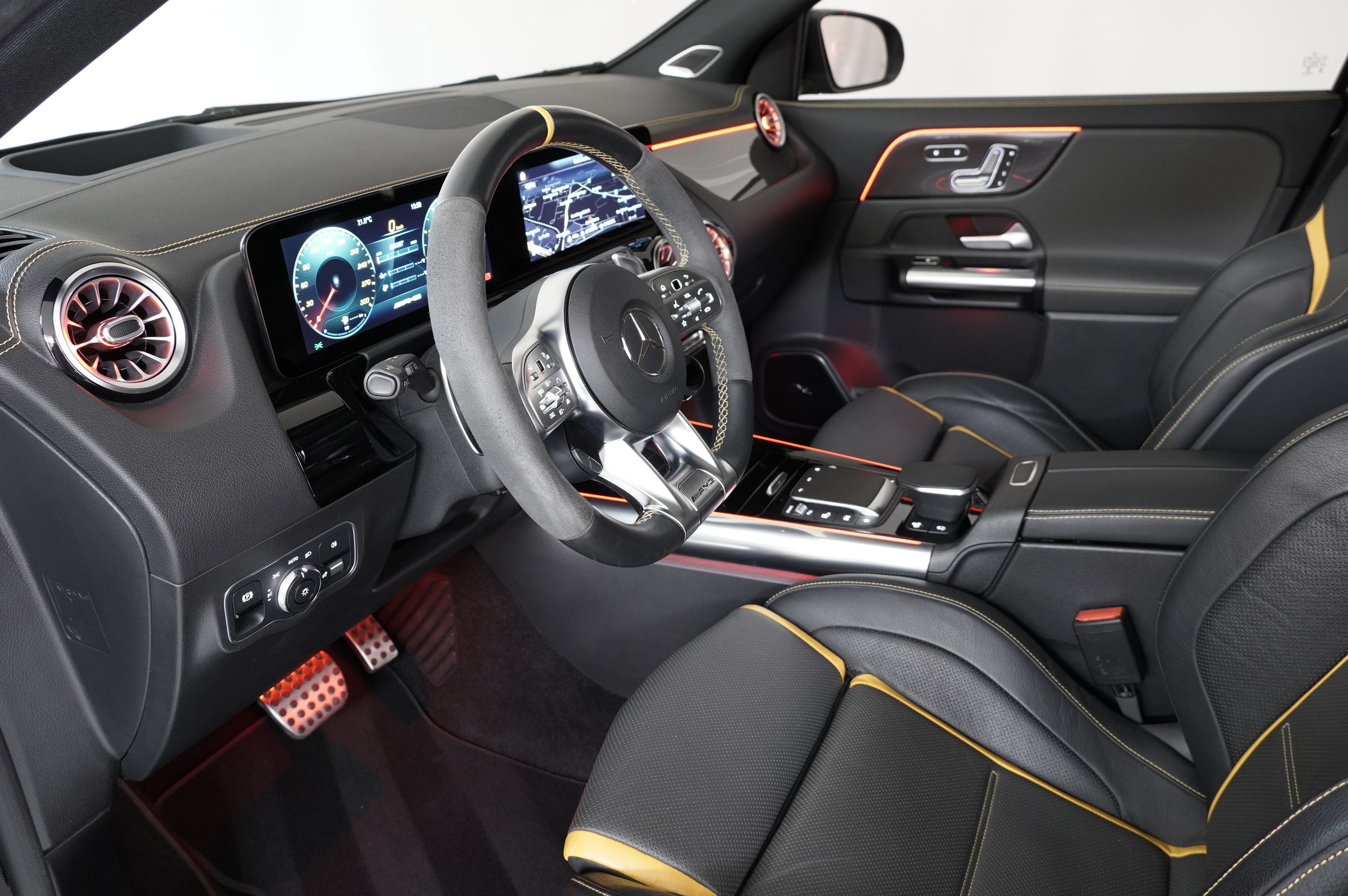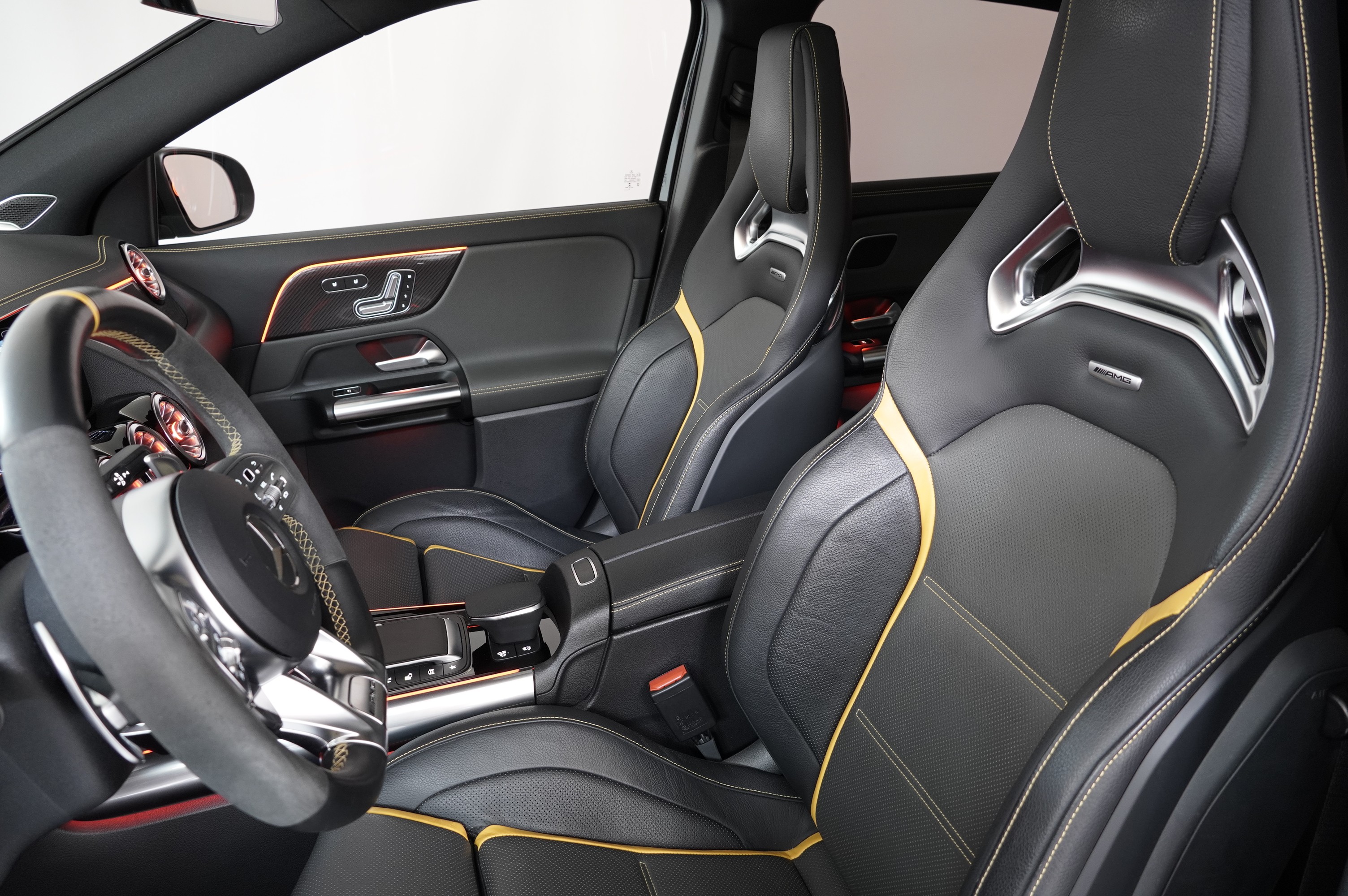 Mercedes GLA 45 S AMG, Véhicule suisse, présentée en Noir métallisé avec intérieur cuir noir et surpiqûres jaunes.