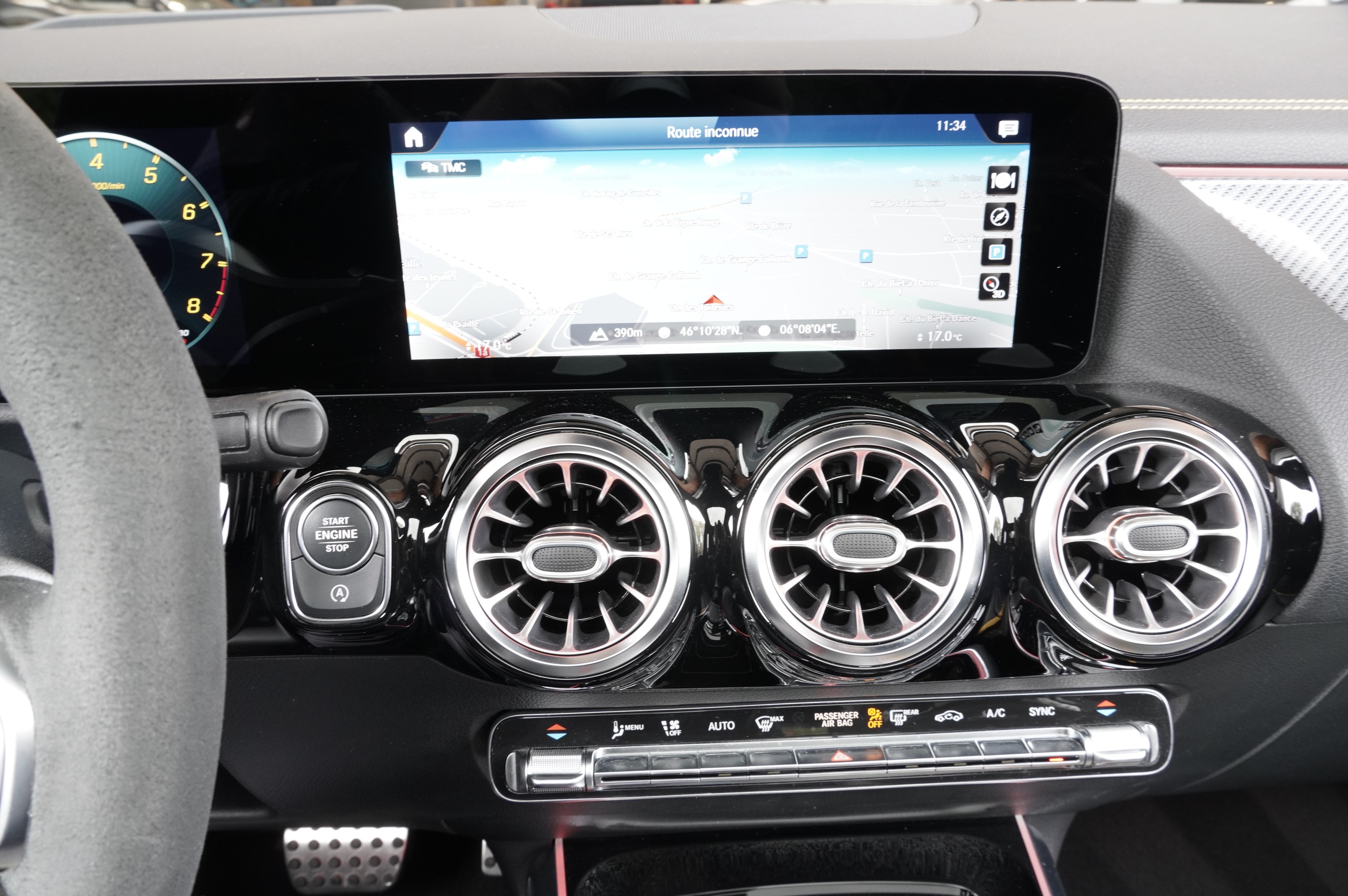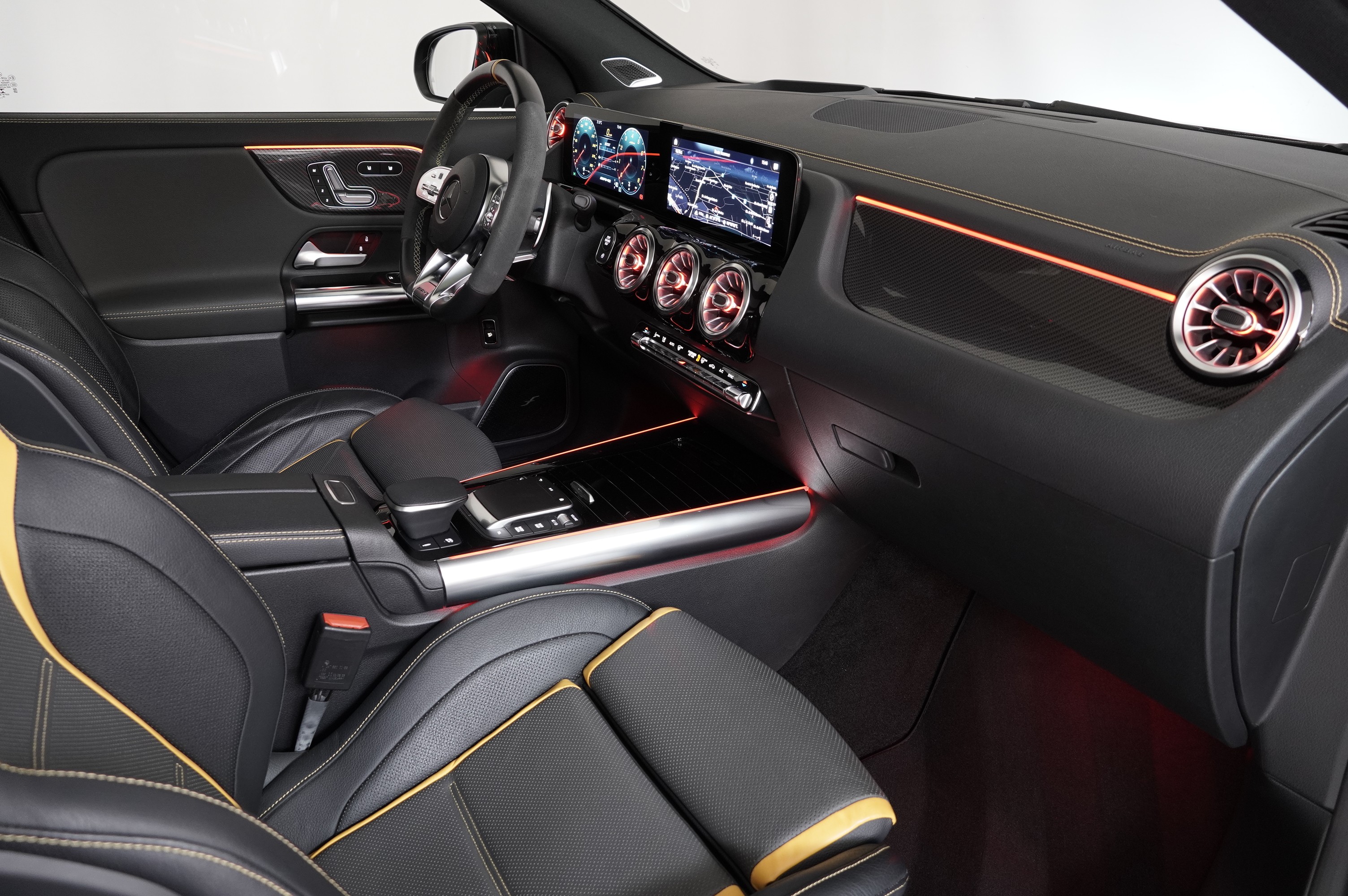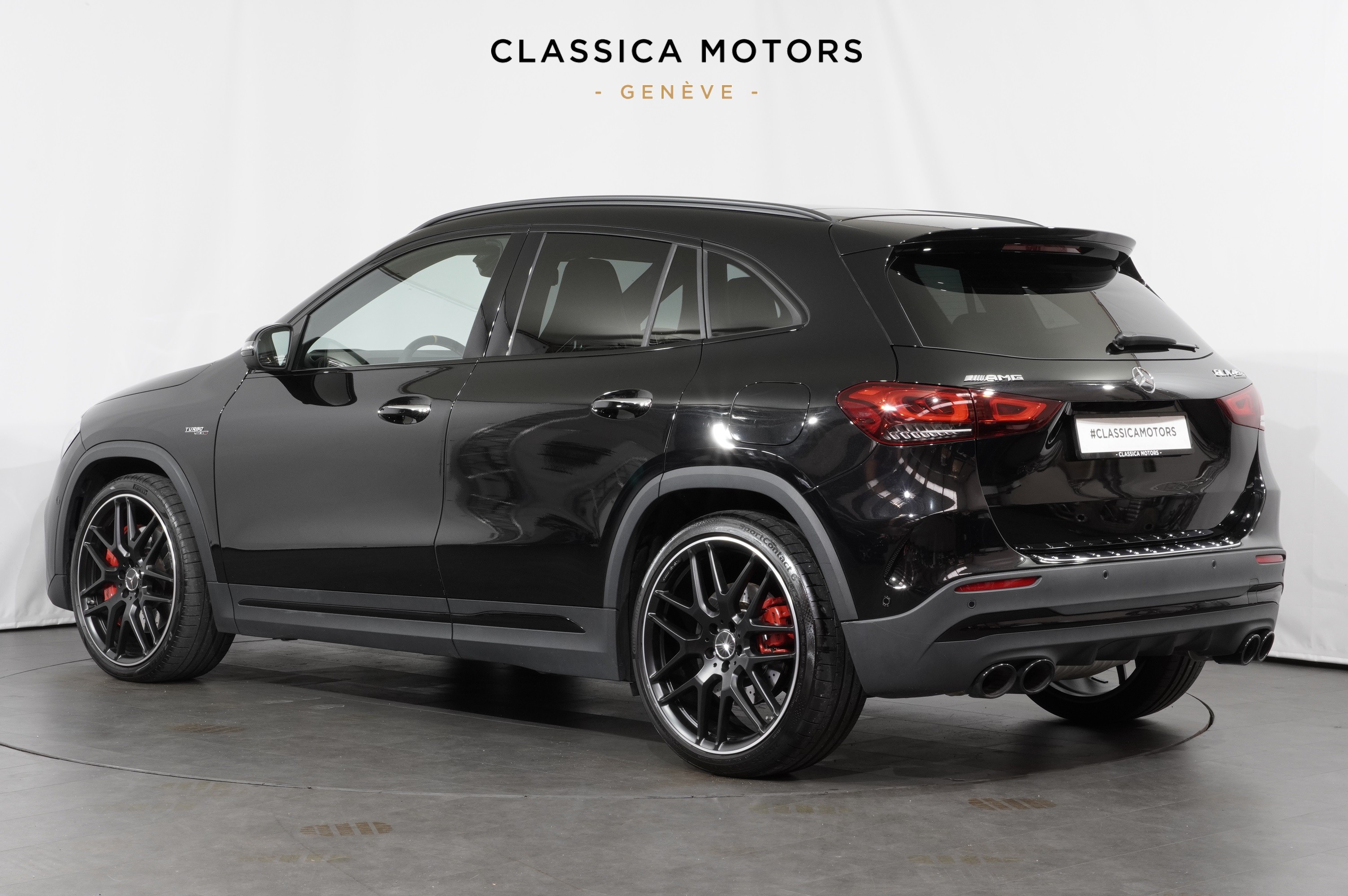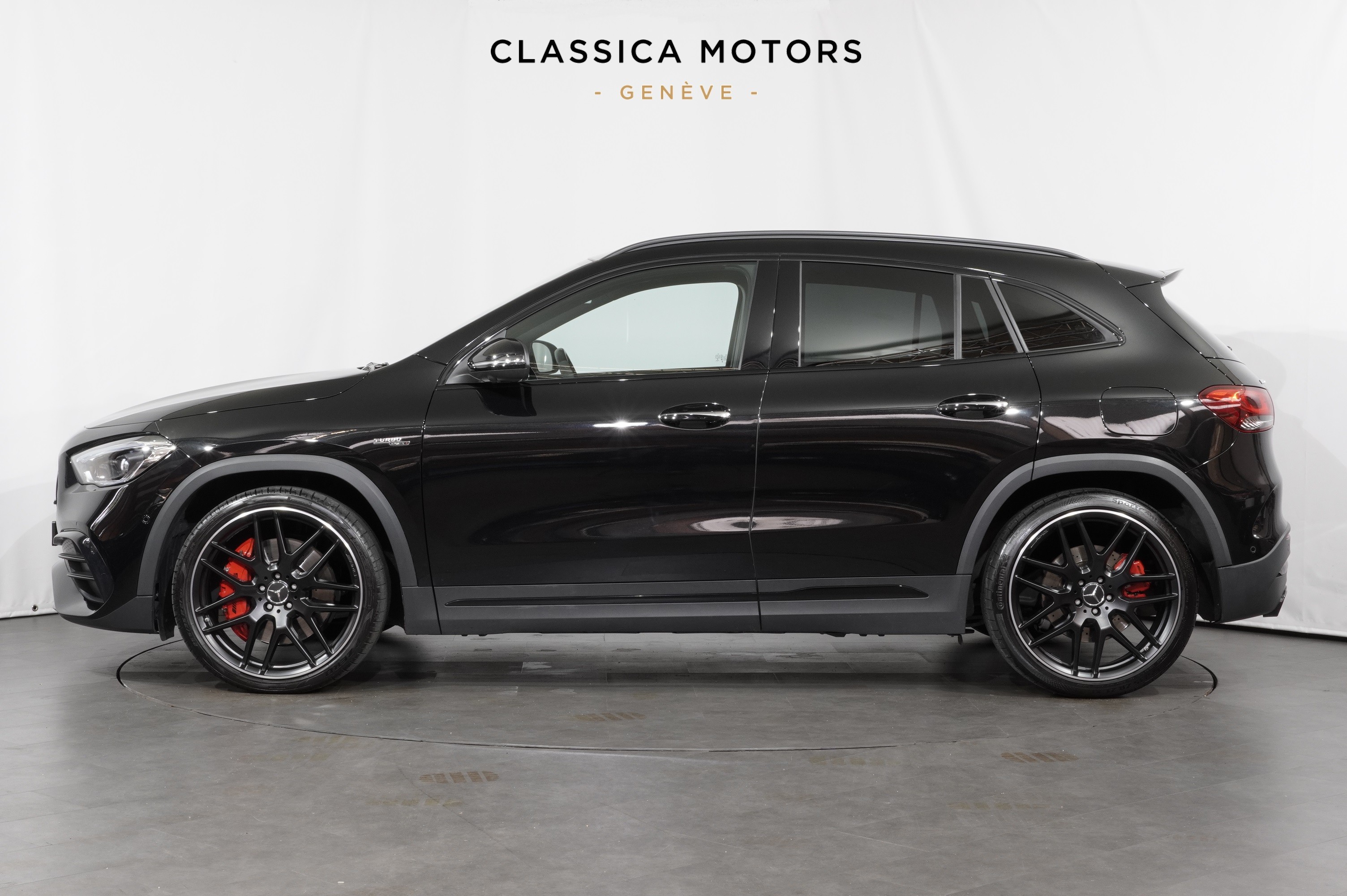 Mercedes GLA 45 S AMG, Véhicule suisse, présentée en Noir métallisé avec intérieur cuir noir et surpiqûres jaunes.