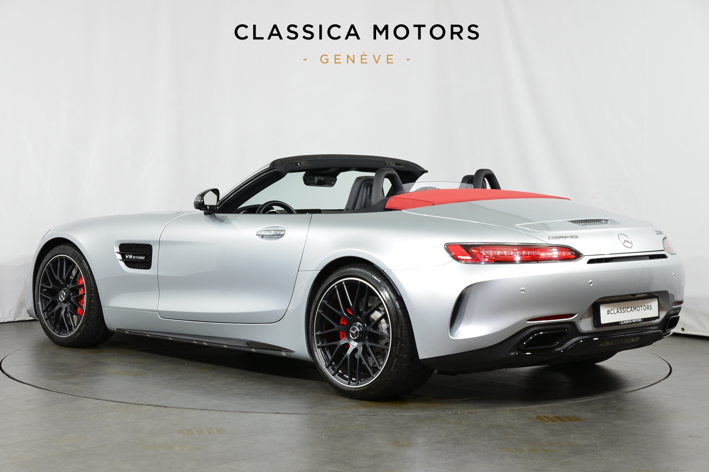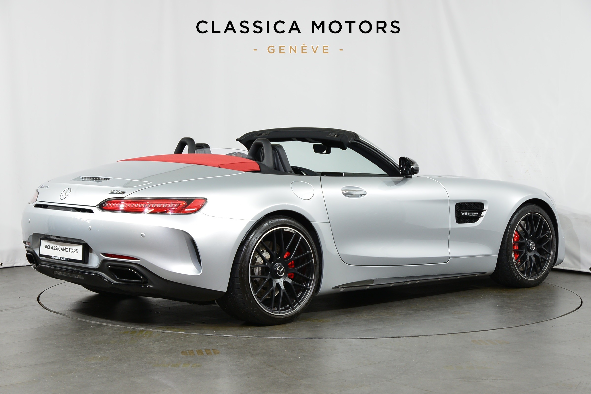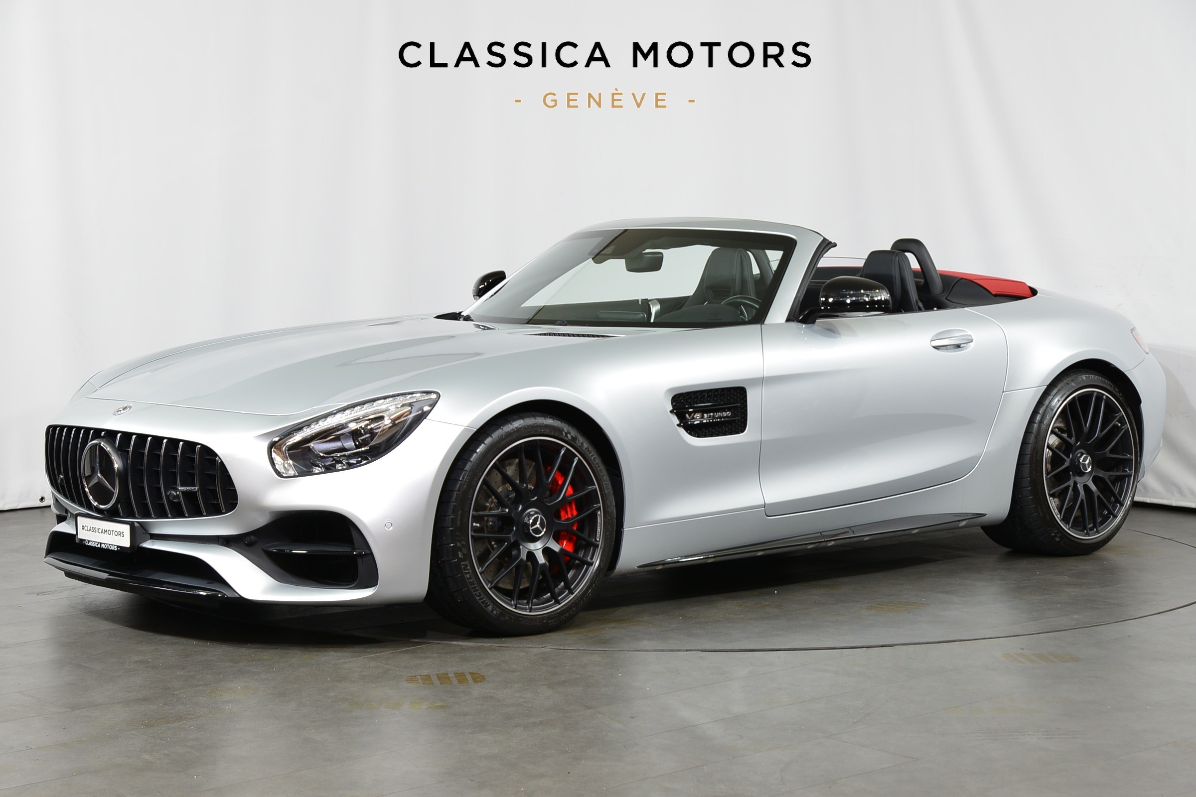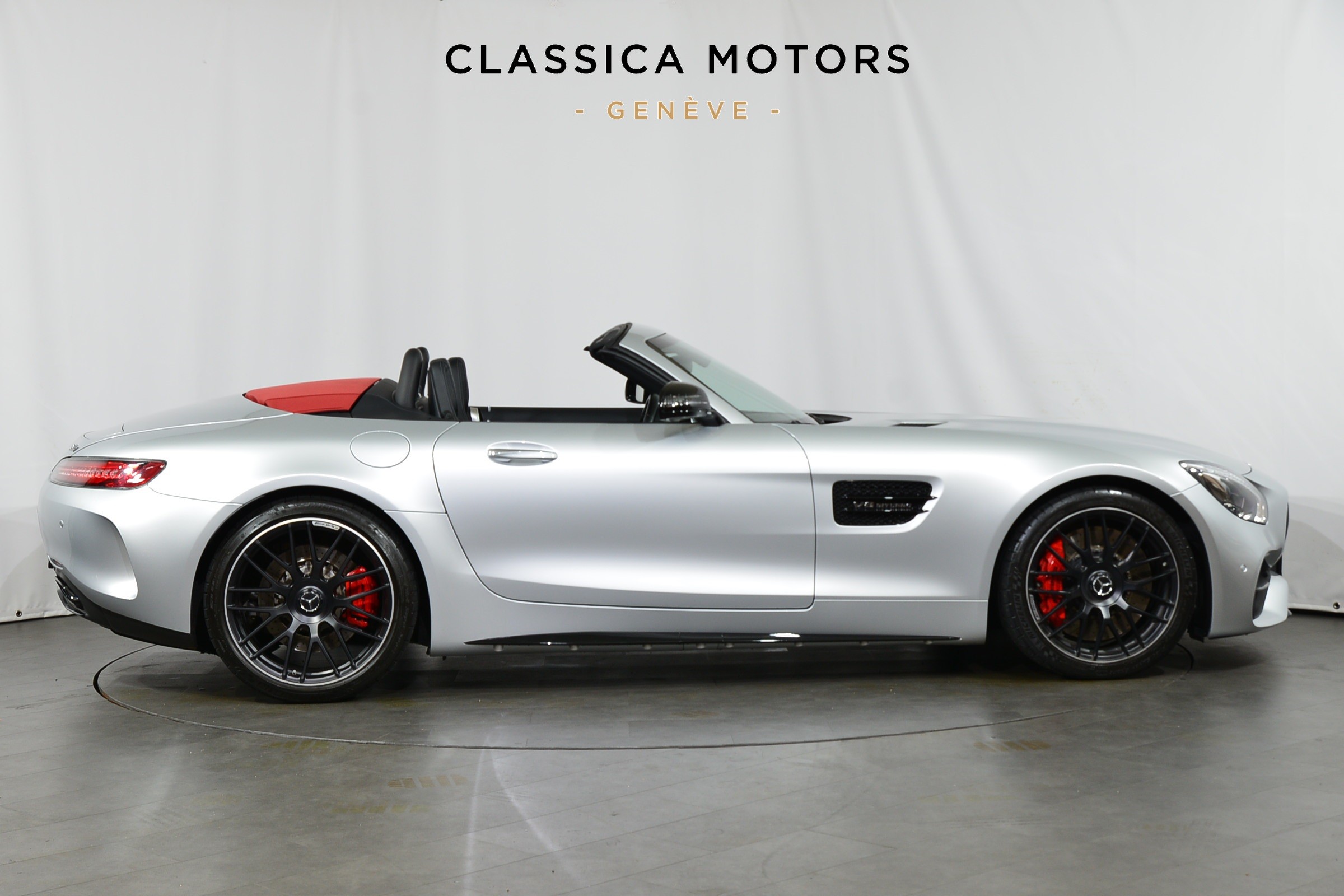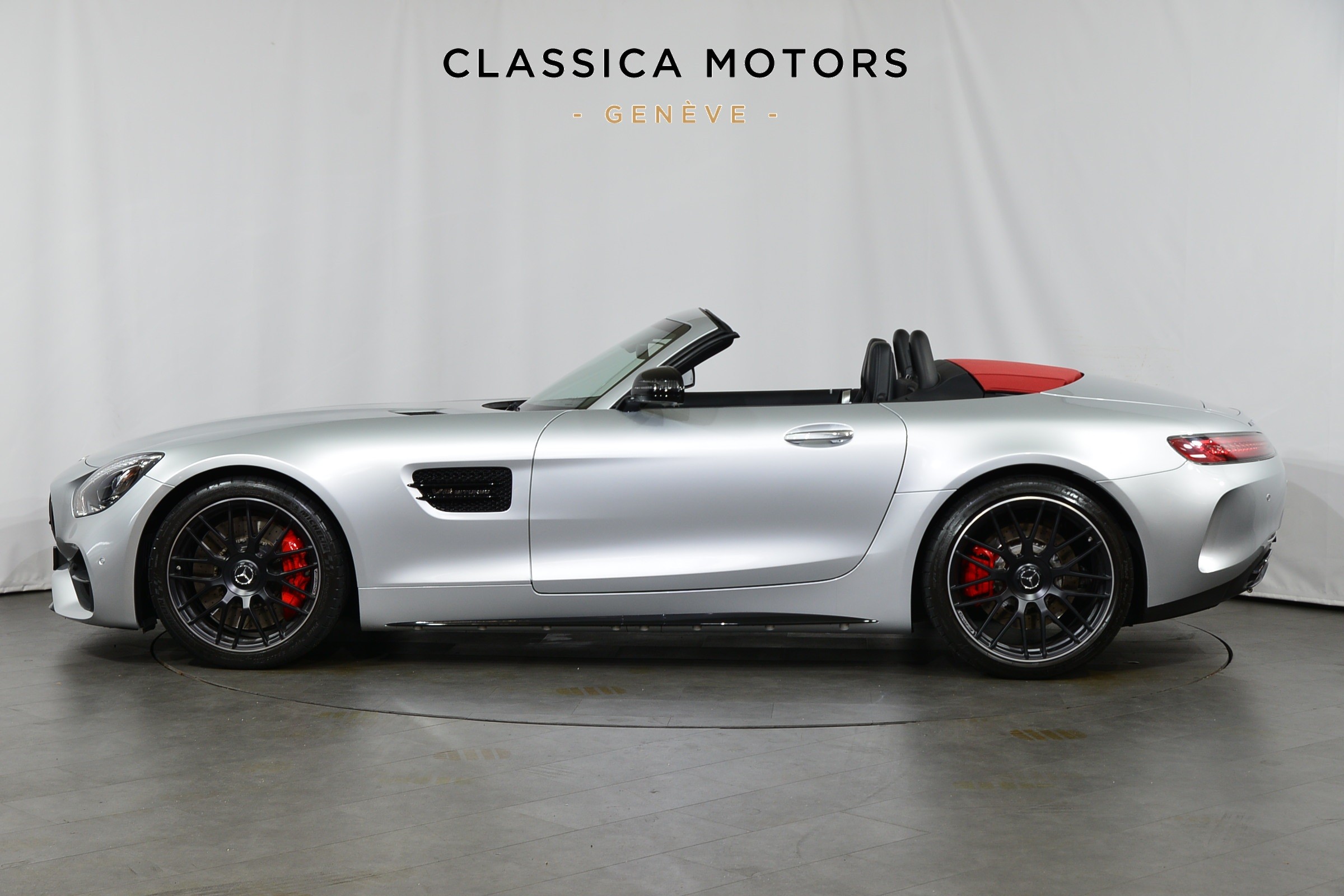 Mercedes-AMG GT C Roadster, Véhicule suisse, présentée en Argent Iridium métallisé avec intérieur cuir noir et capote rouge.
