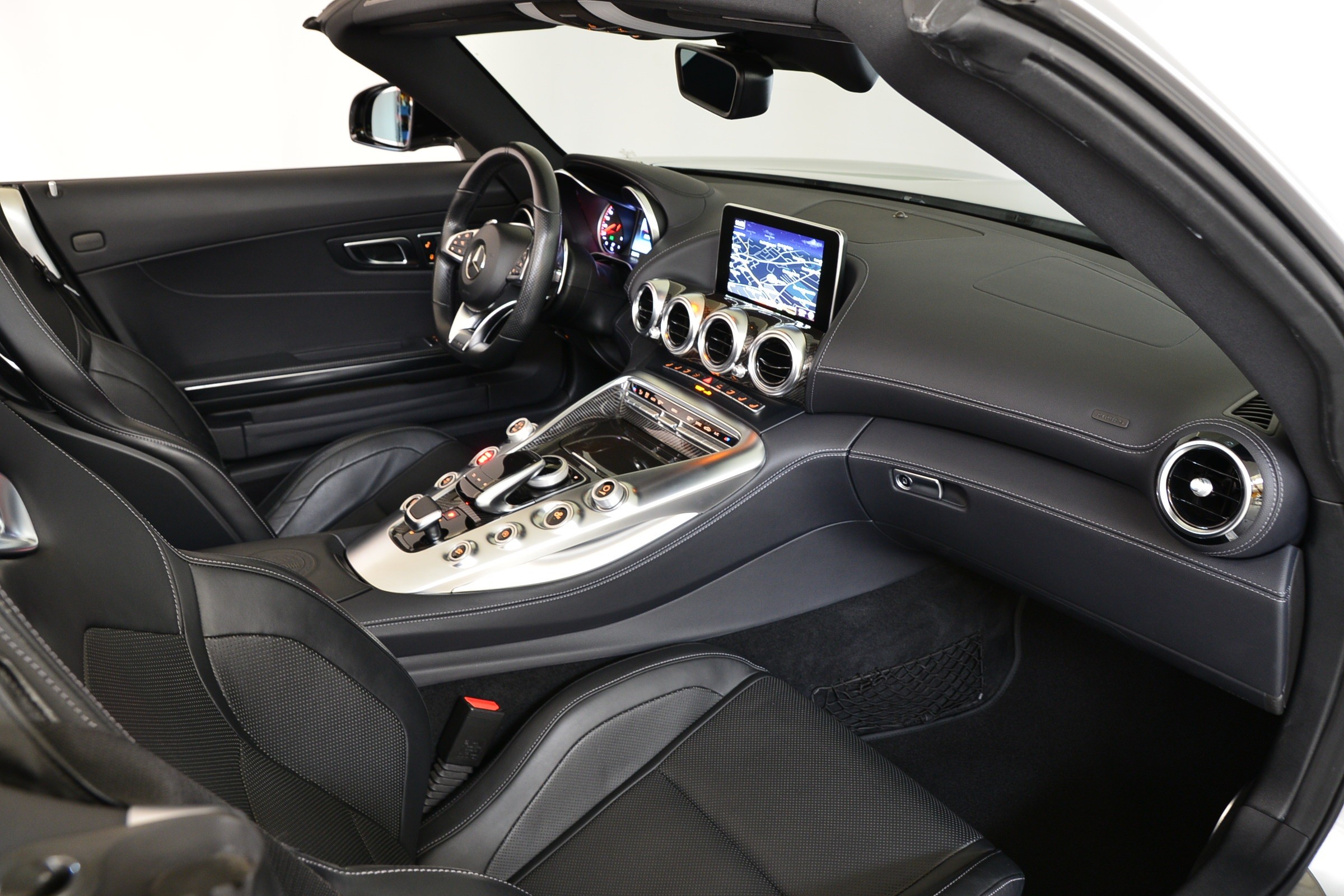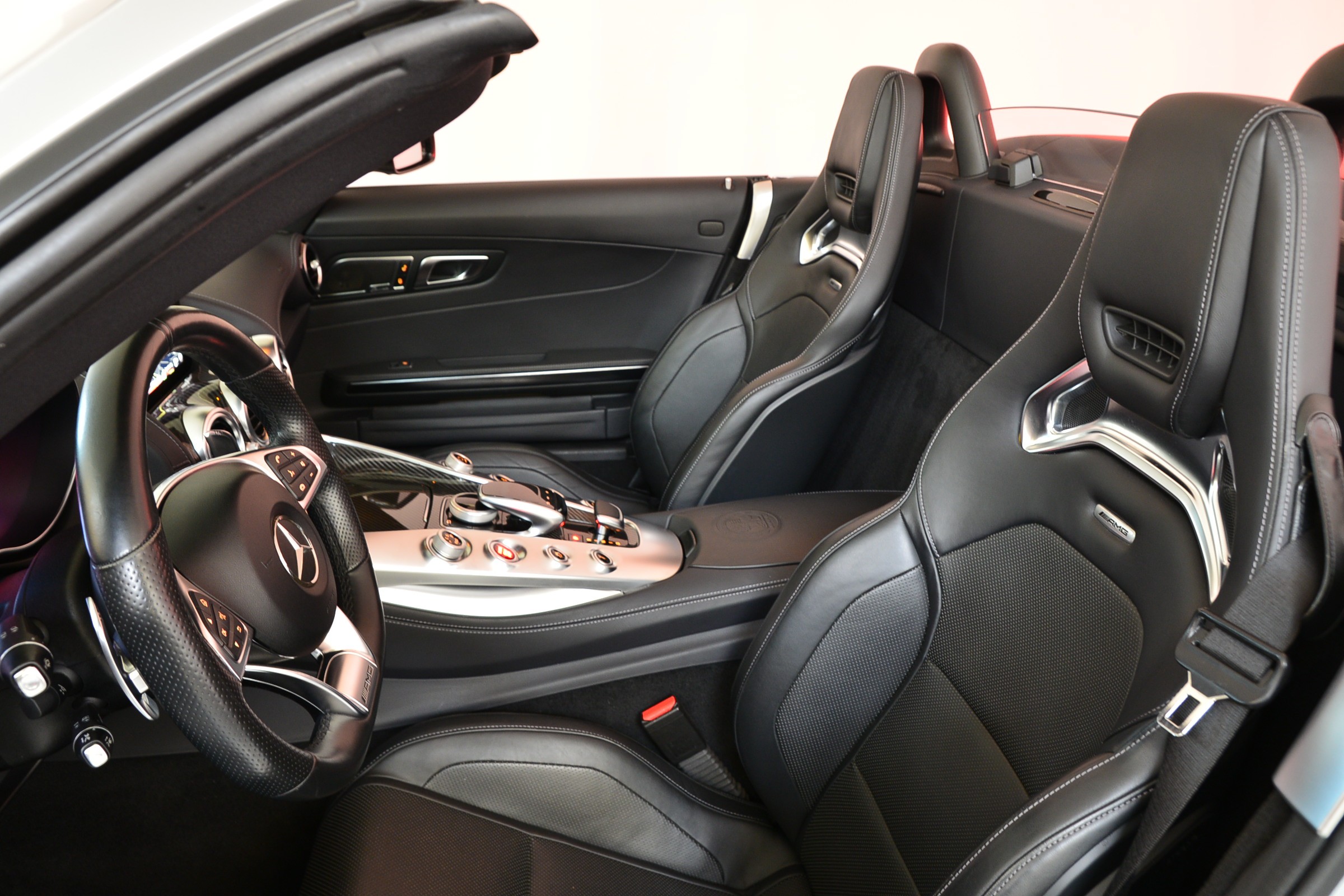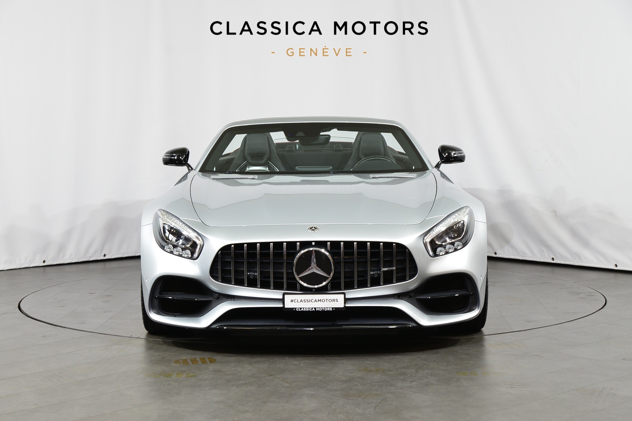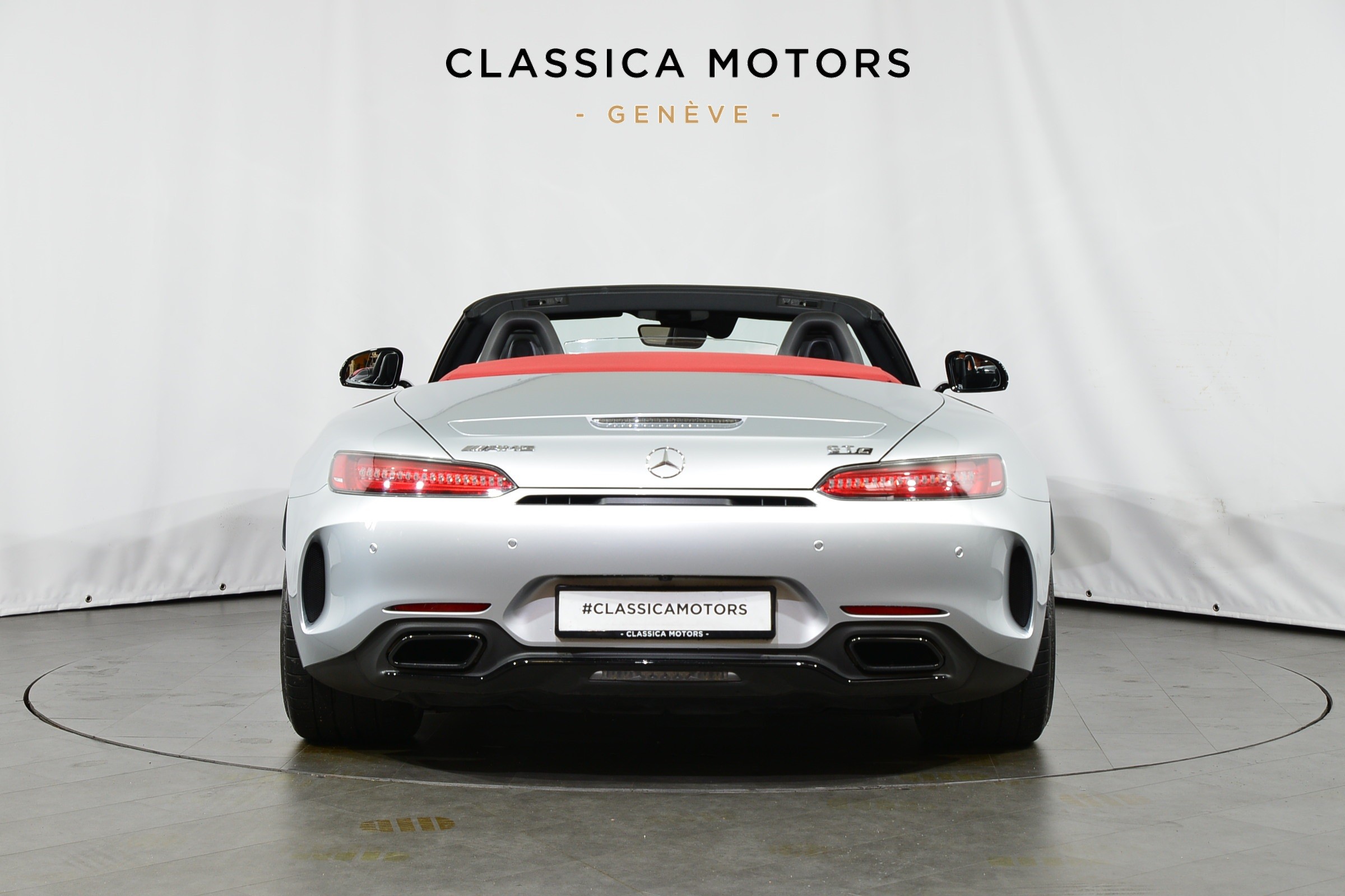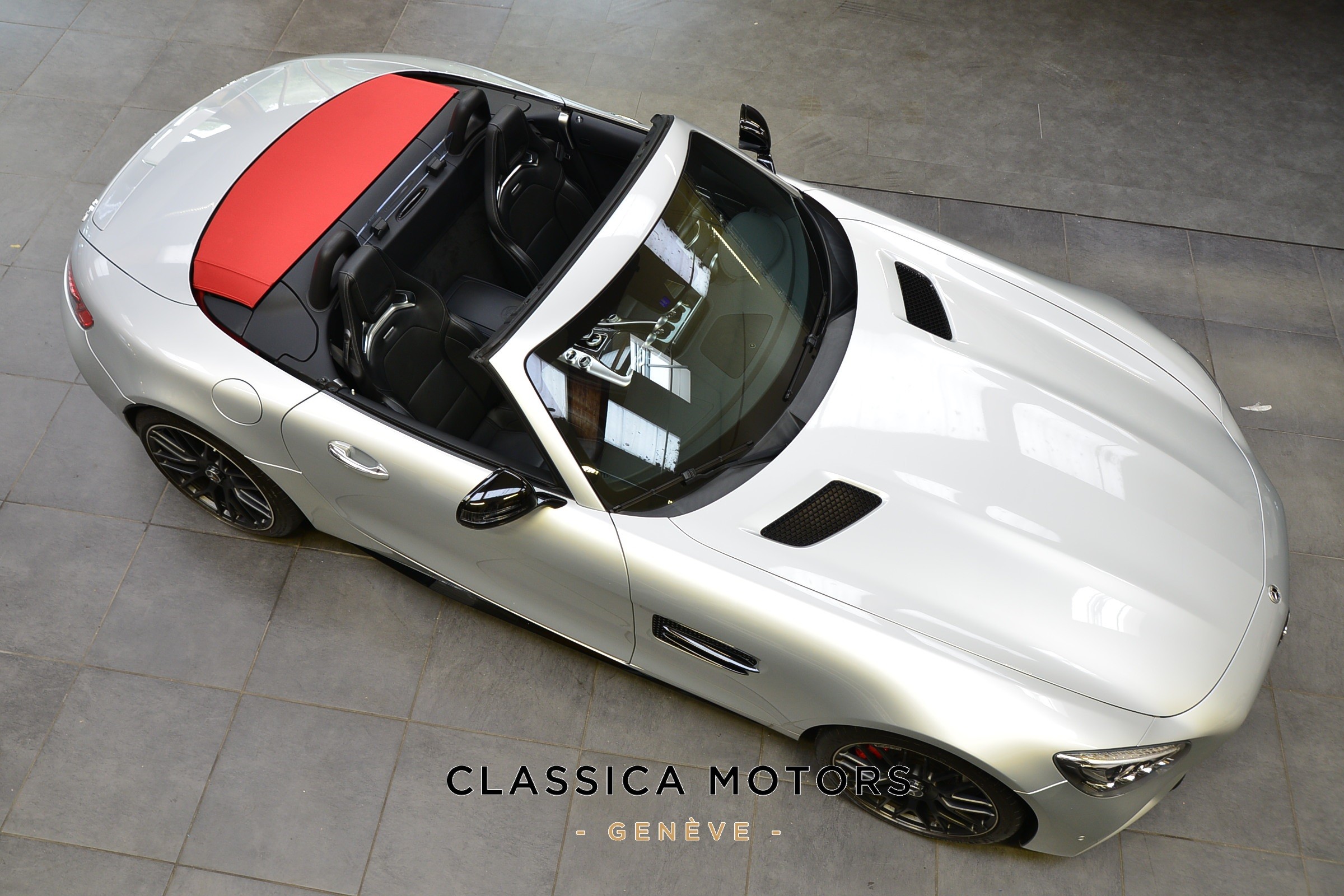 Mercedes-AMG GT C Roadster, Véhicule suisse, présentée en Argent Iridium métallisé avec intérieur cuir noir et capote rouge.