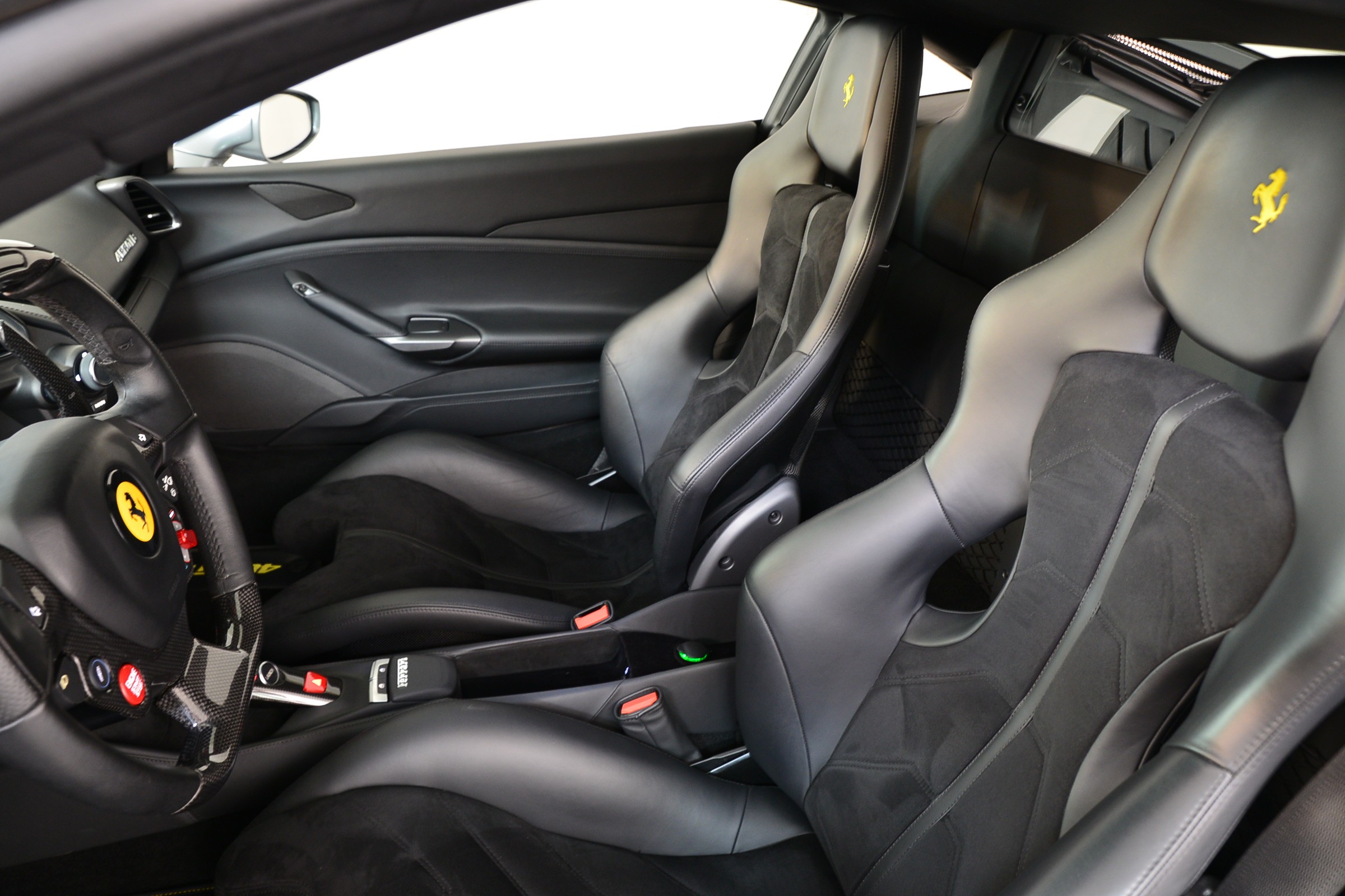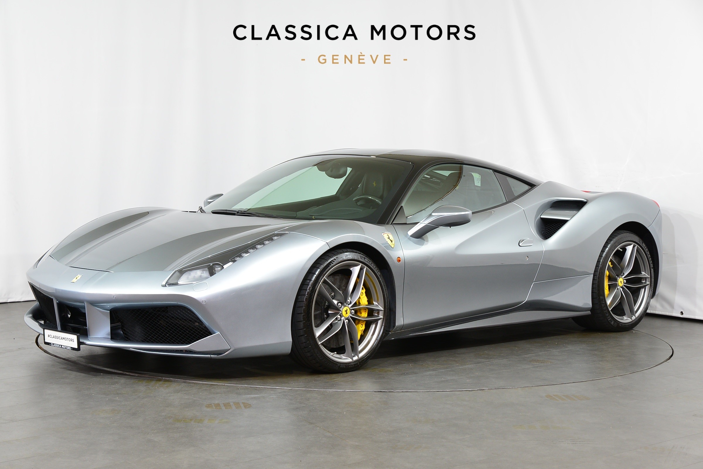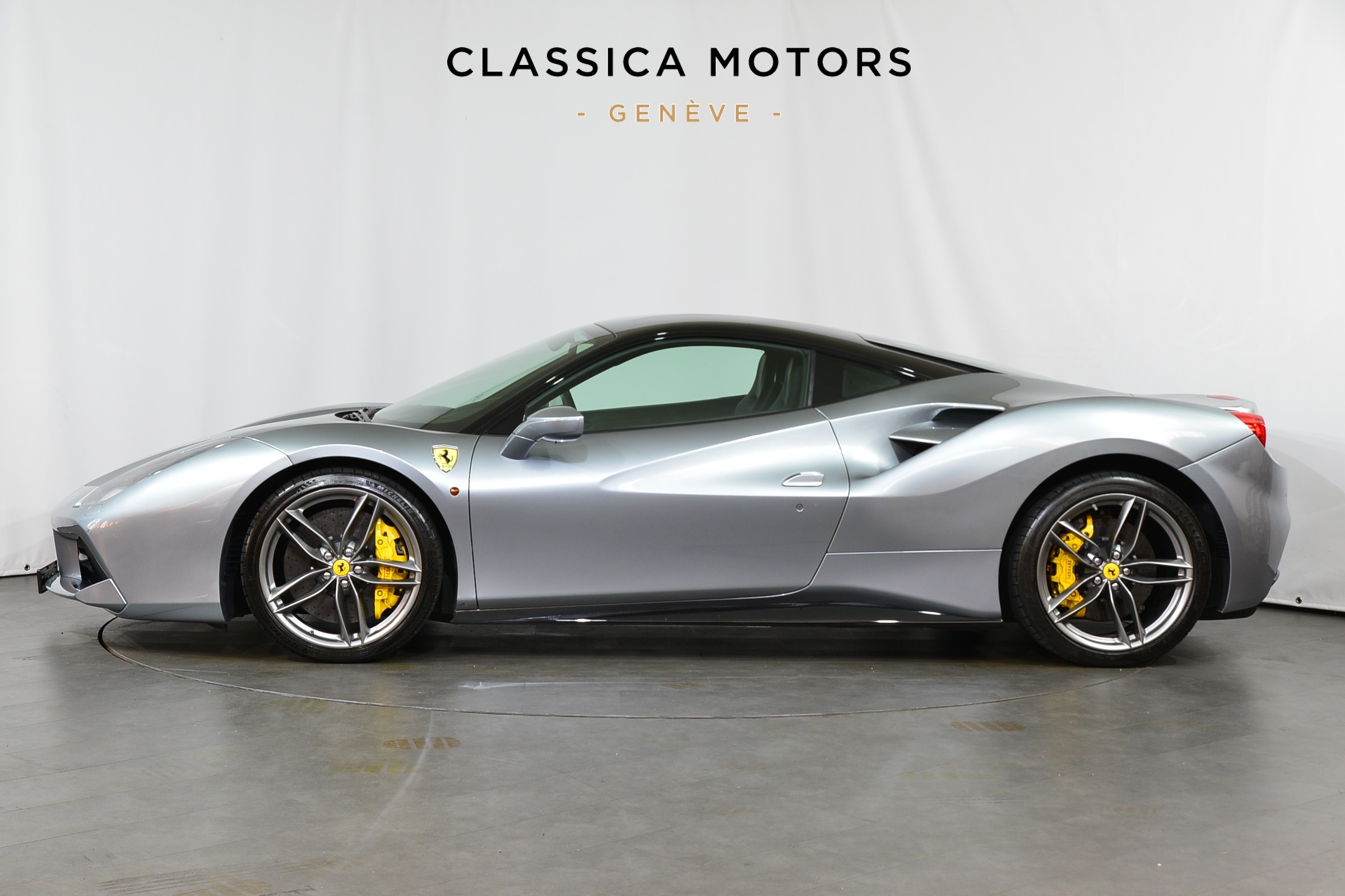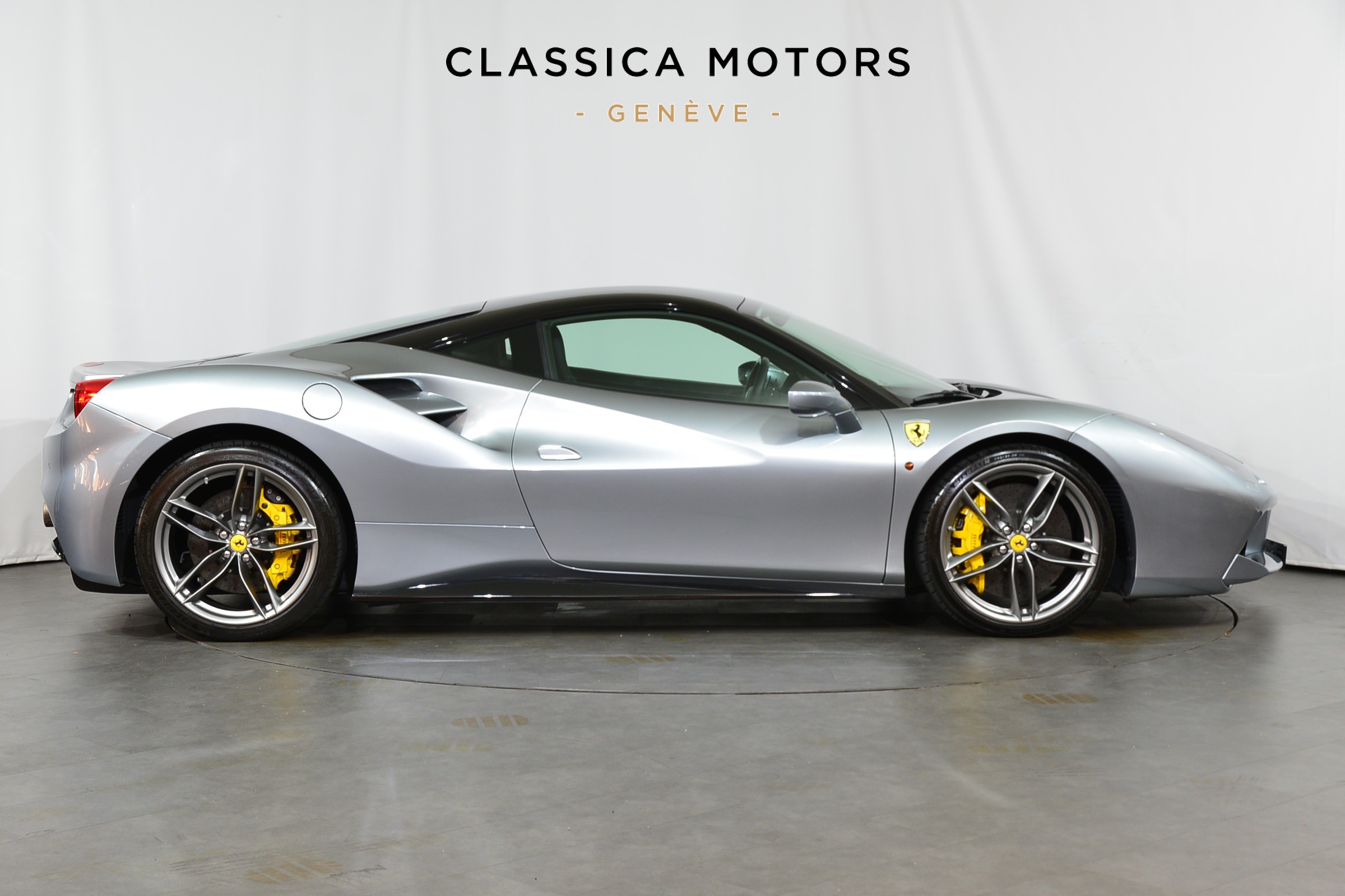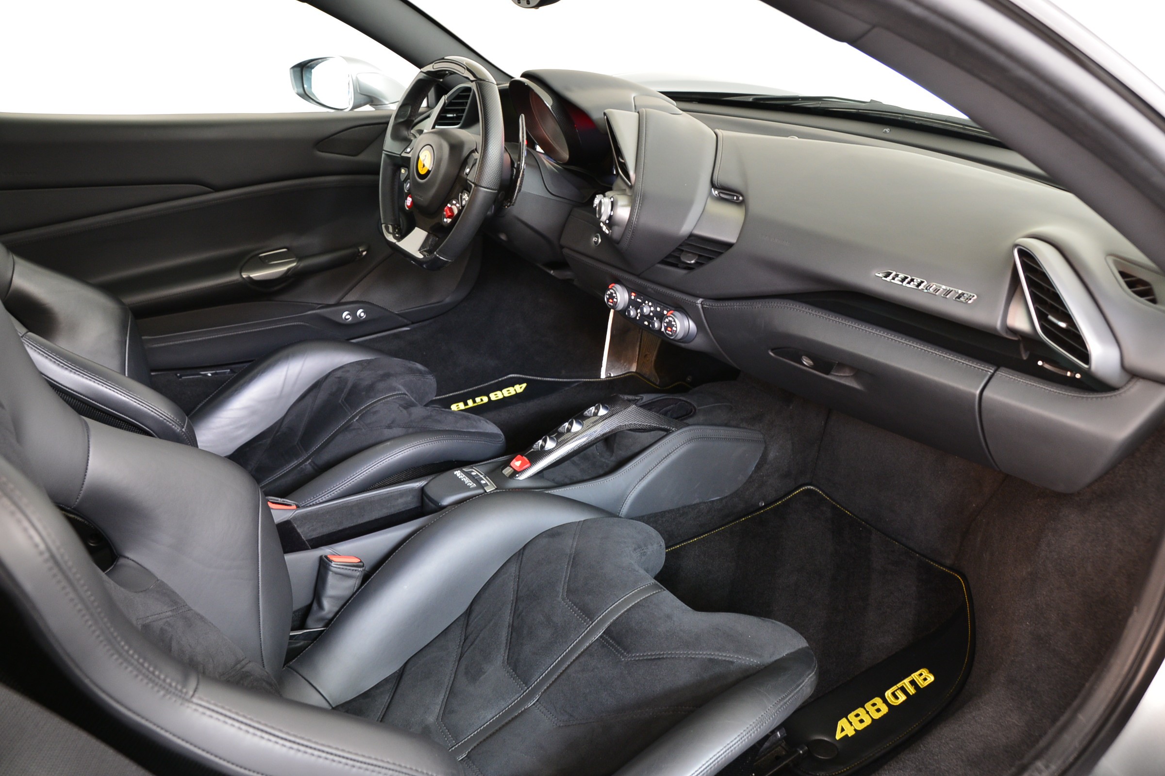 Ferrari 488 GTB, Véhicule suisse, présentée en Grigio Titanio métallisé (FQ 3238) avec sièges baquets « Goldrake » en cuir et Alcantara noir, surpiqûres jaunes.
