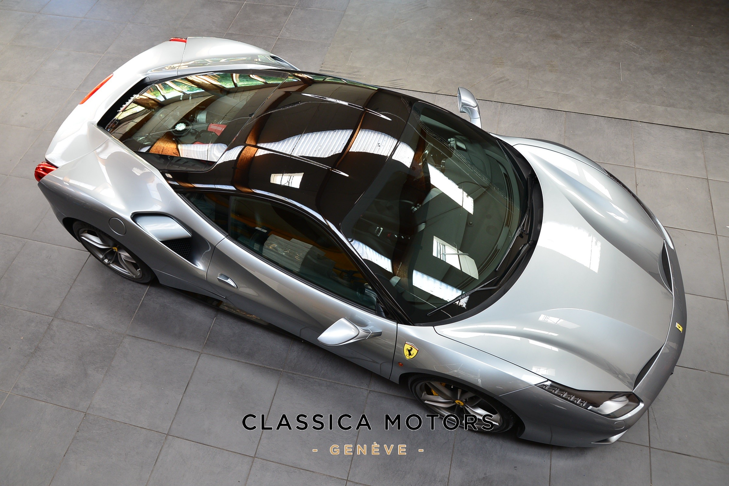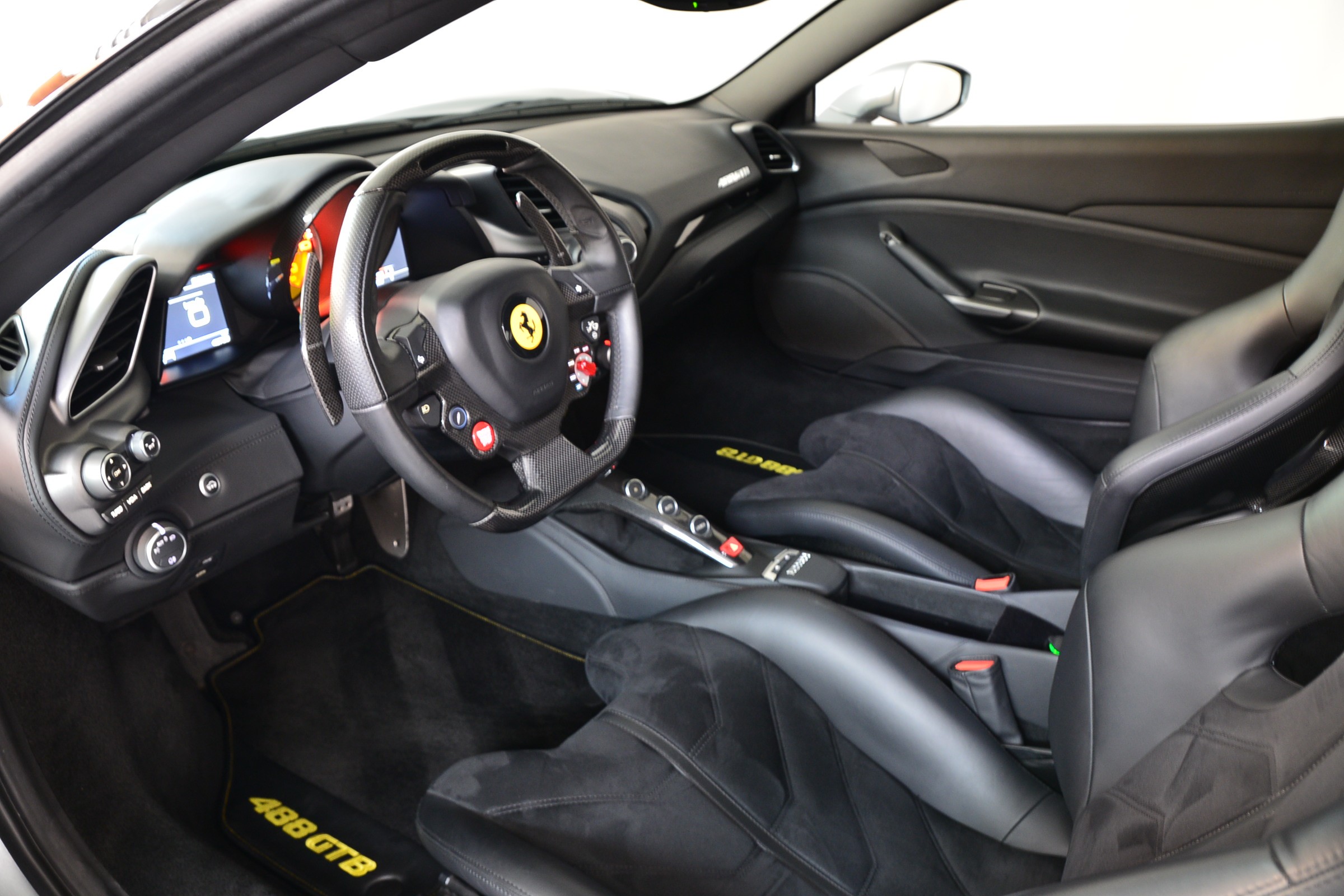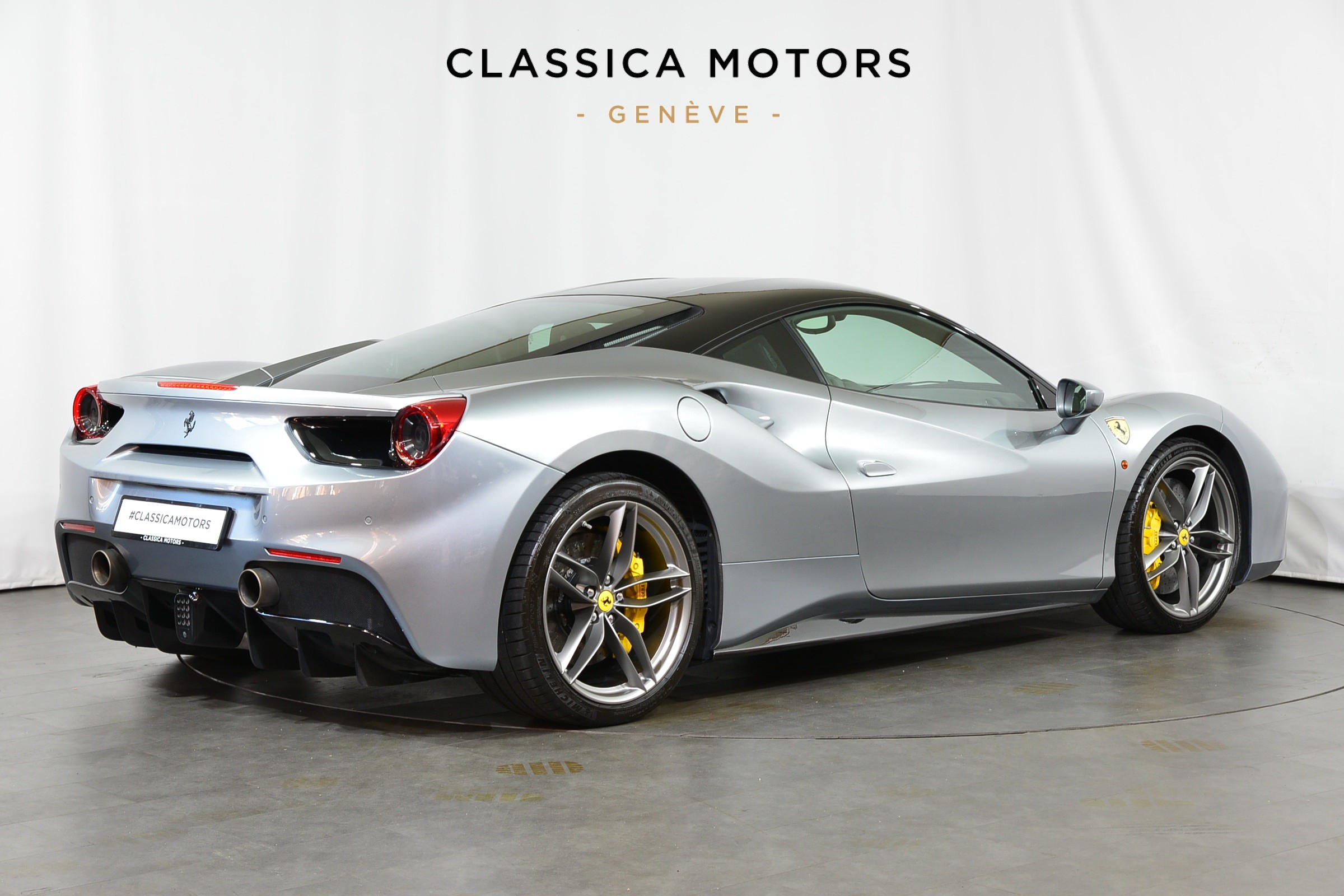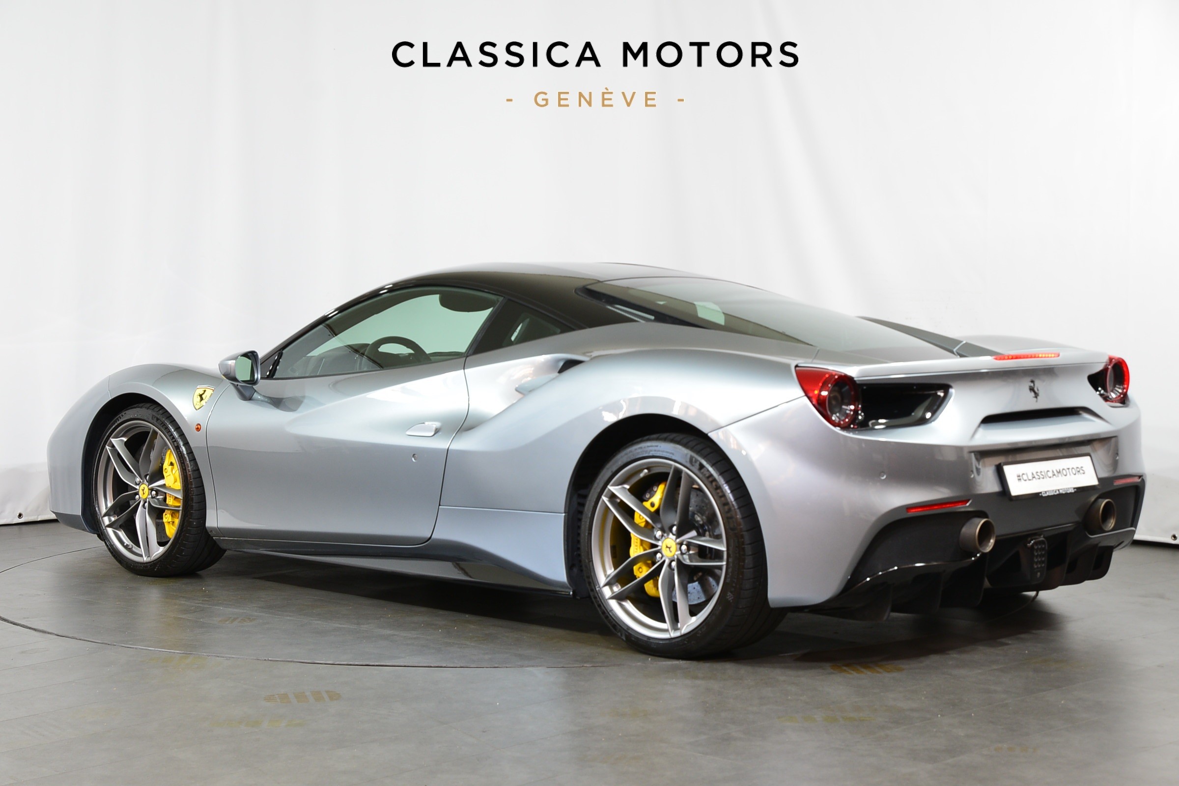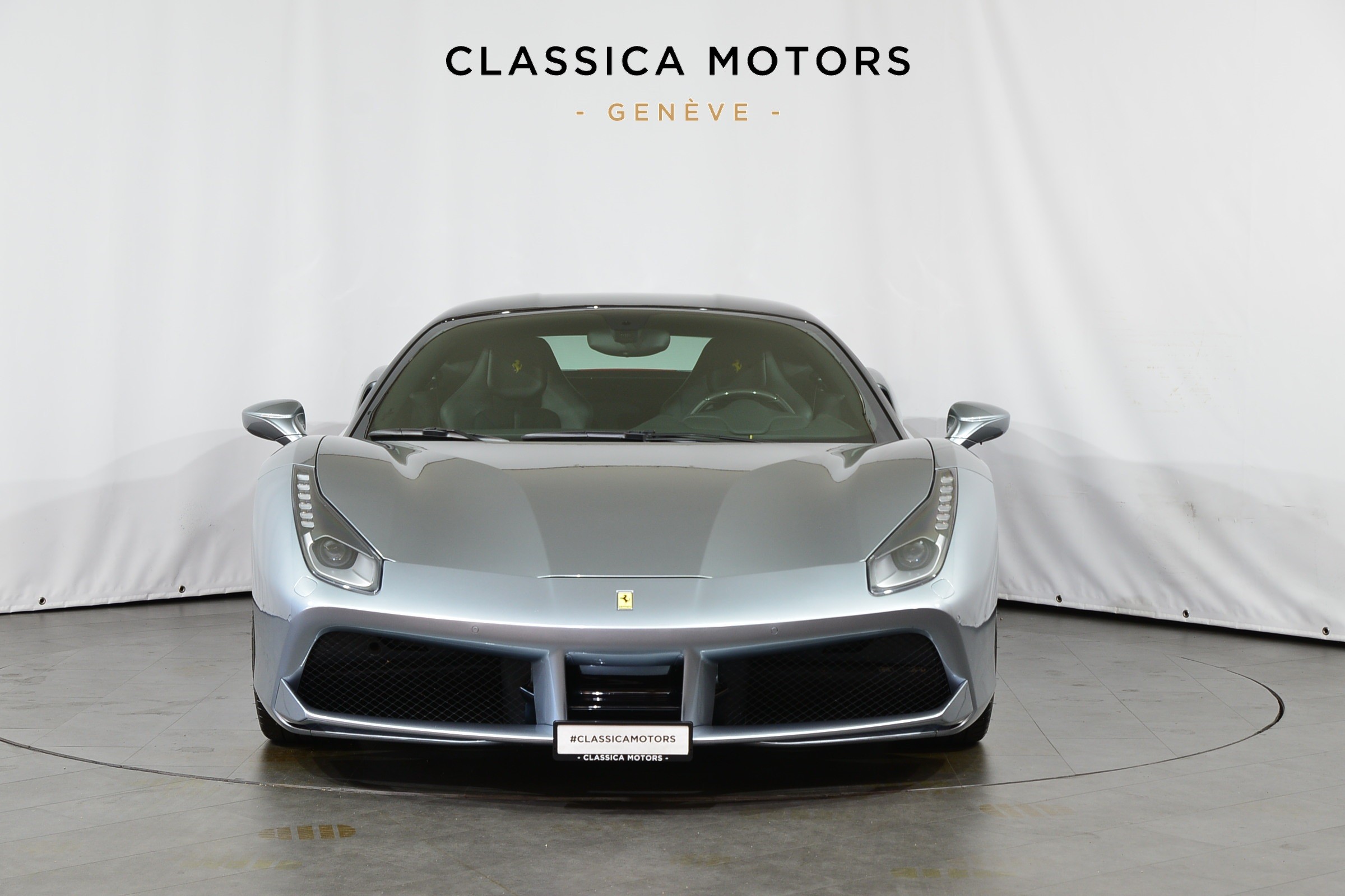 Ferrari 488 GTB, Véhicule suisse, présentée en Grigio Titanio métallisé (FQ 3238) avec sièges baquets « Goldrake » en cuir et Alcantara noir, surpiqûres jaunes.
