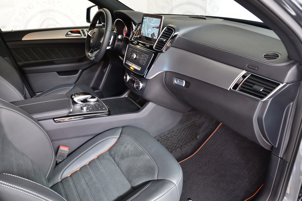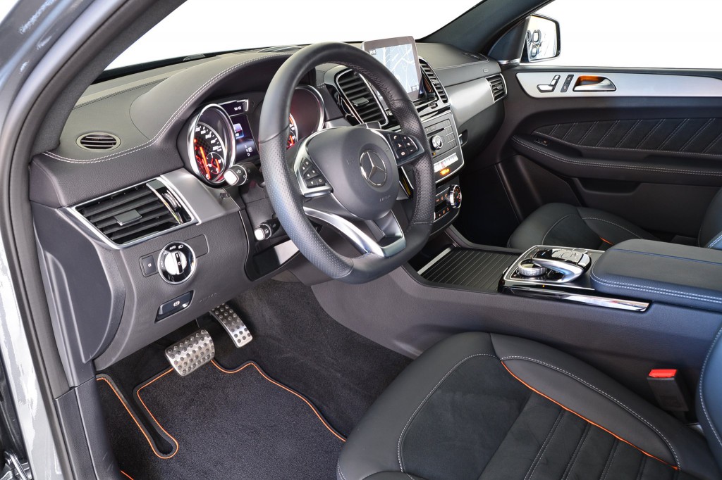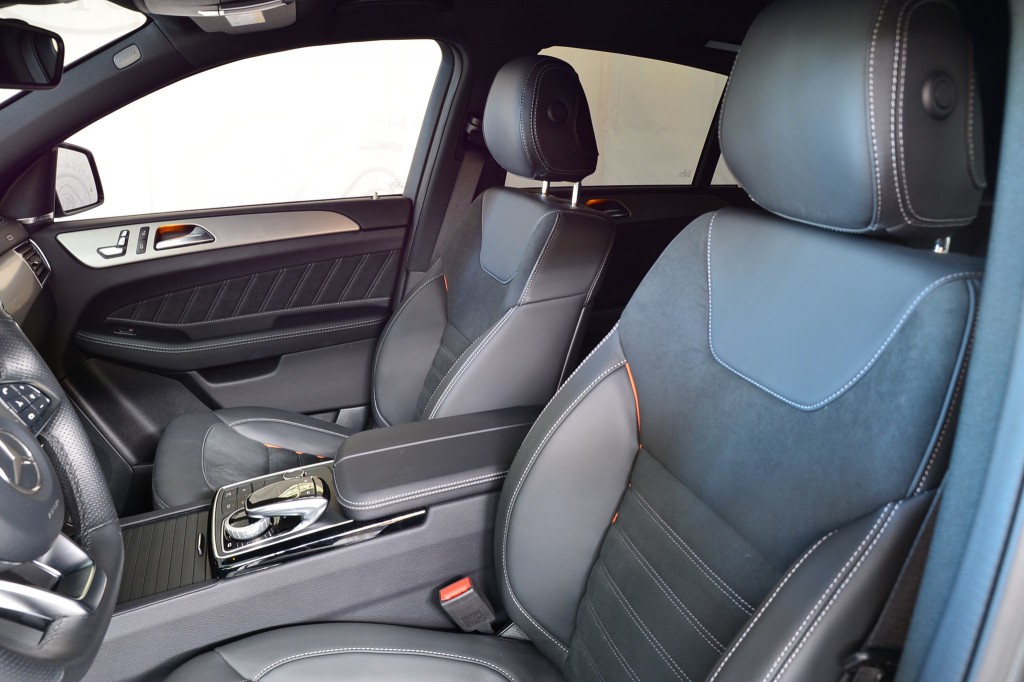 Gris Sélénite métallisé avec les sièges sport AMG en cuir et Alcantara noir. Coutures grises. Le tableau de bord est en cuir noir.